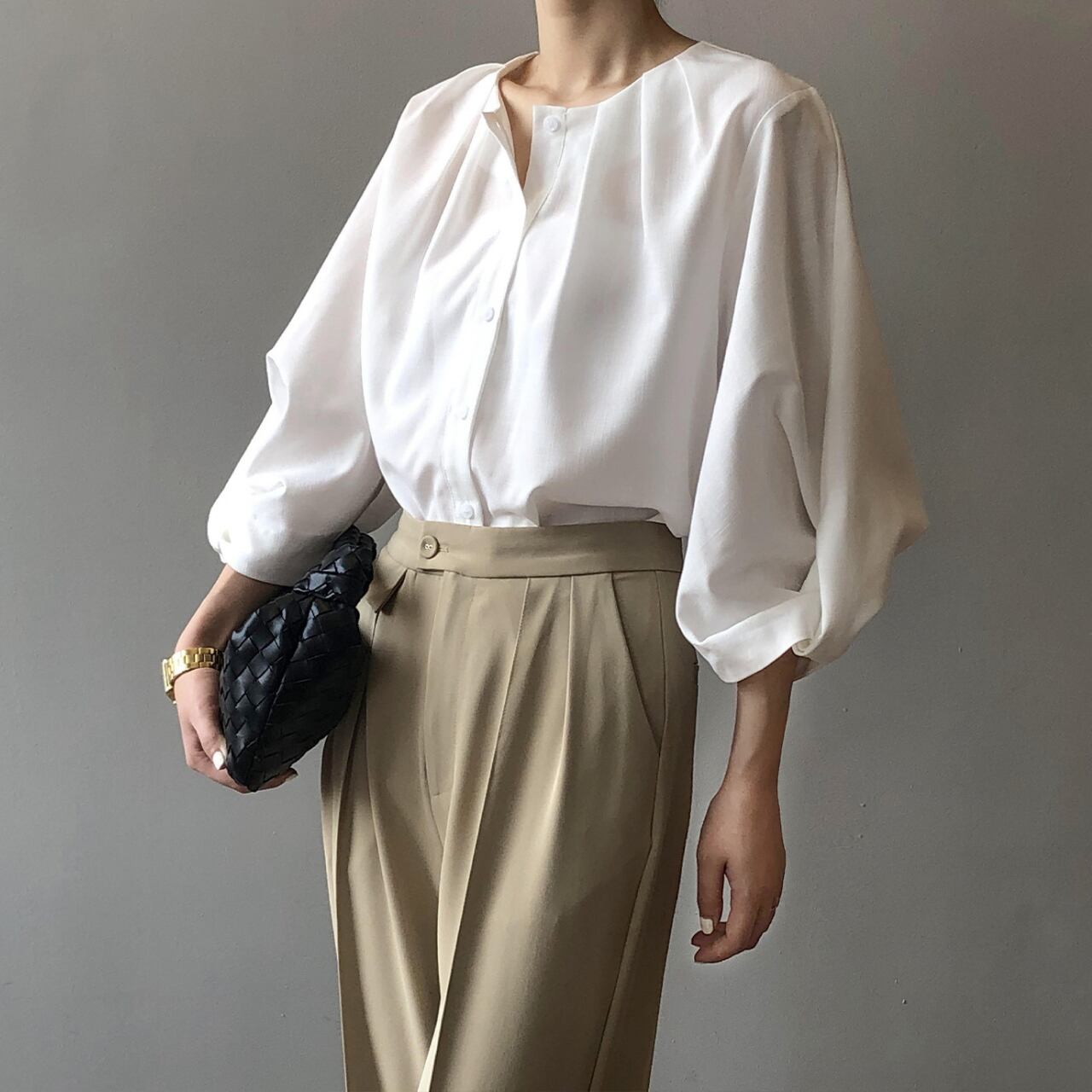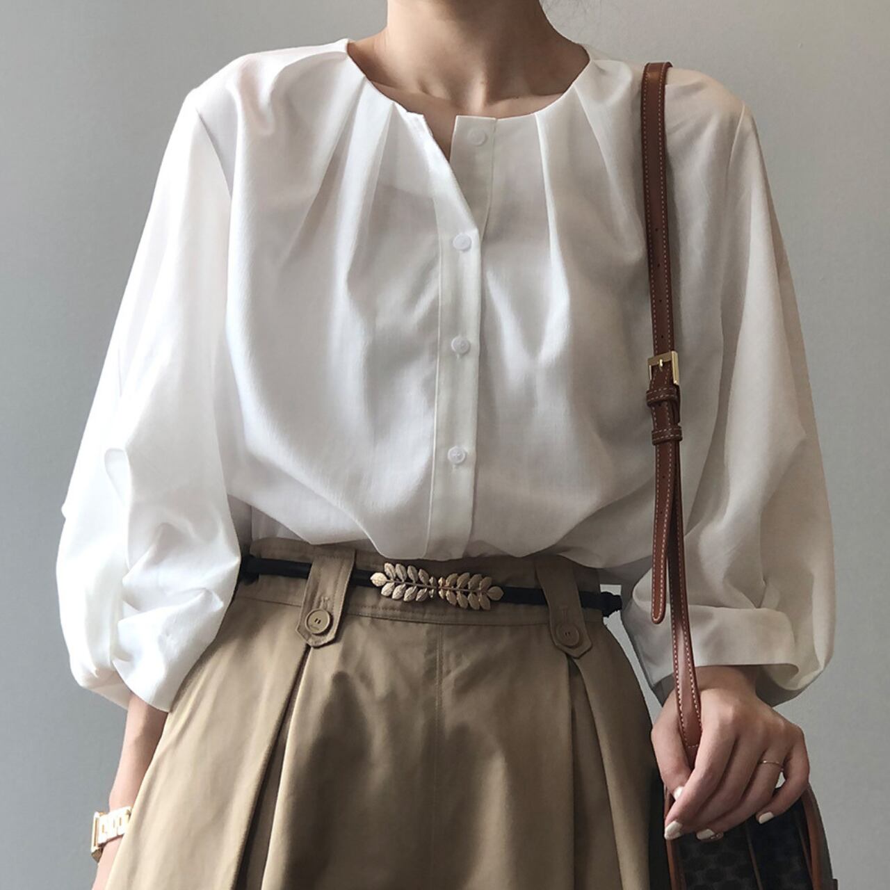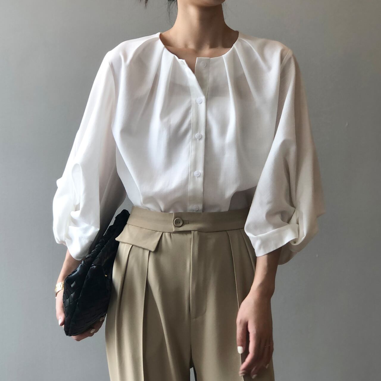 ボリュームスリーブが上品な七分袖シャツ。