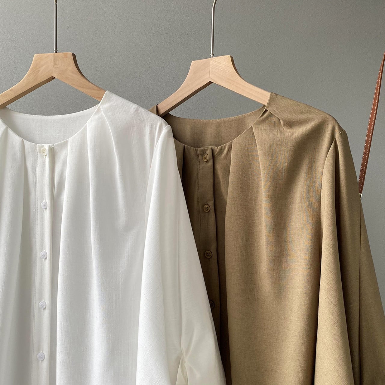 フロントボタンのデザインがさりげないアクセントとなり、オフィスシーンからカジュアルなオフスタイルまで幅広く活躍します。