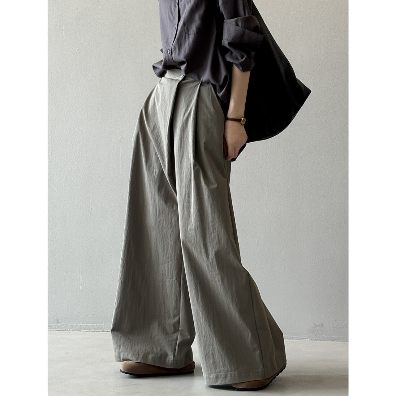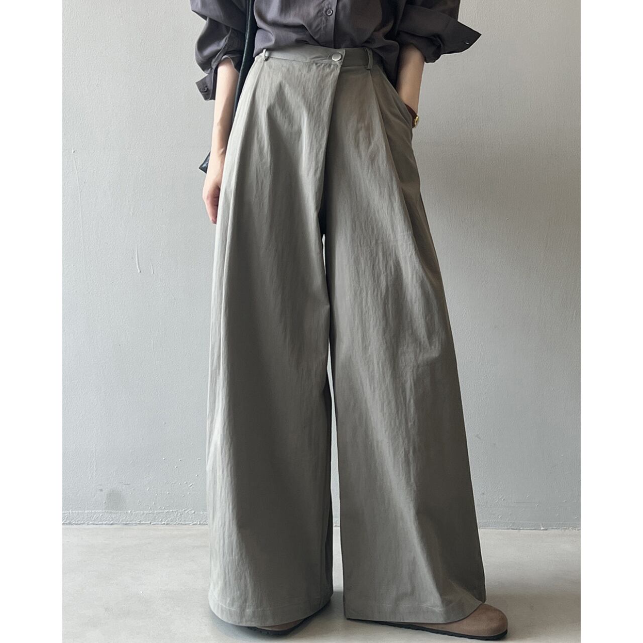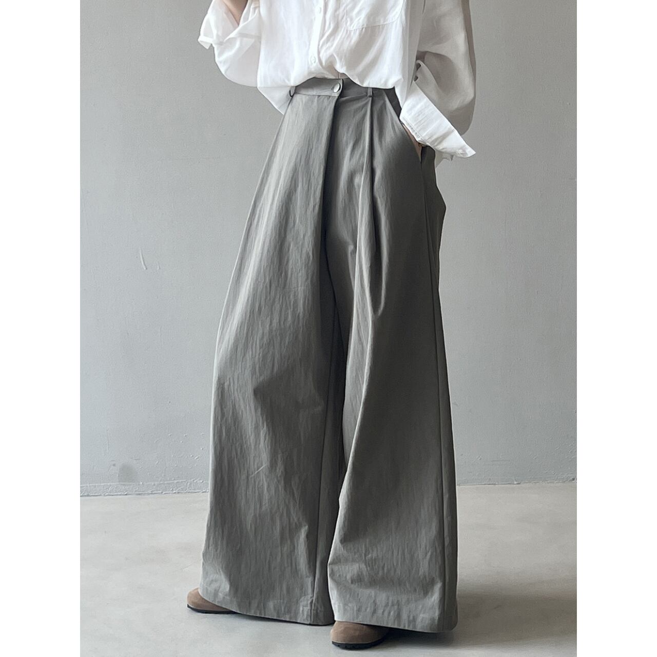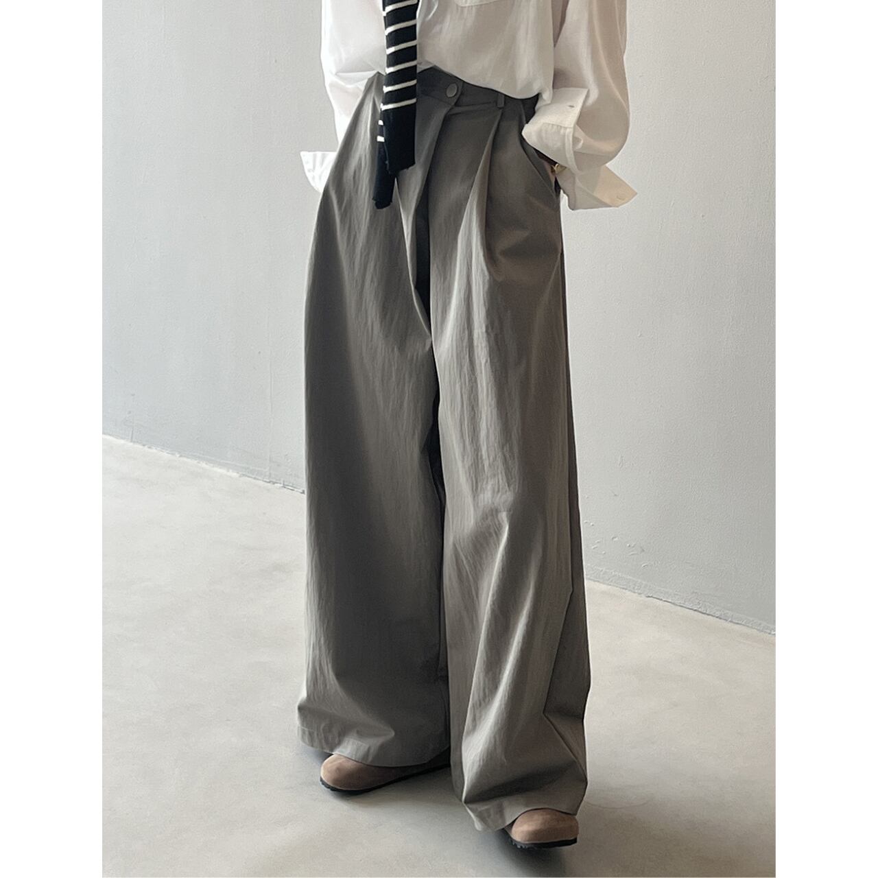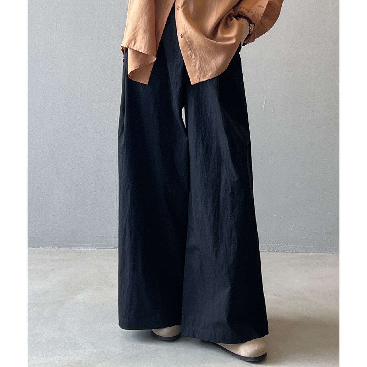 ゆったりとしたワイドレッグシルエットは、リラックス感と女性らしさを演出します。