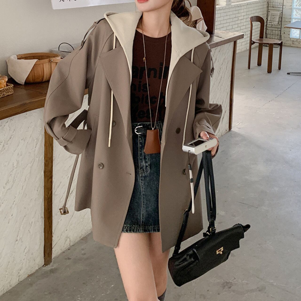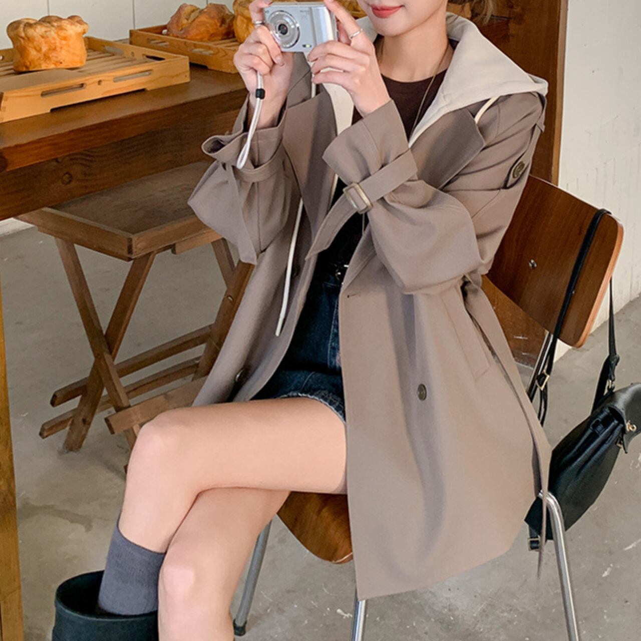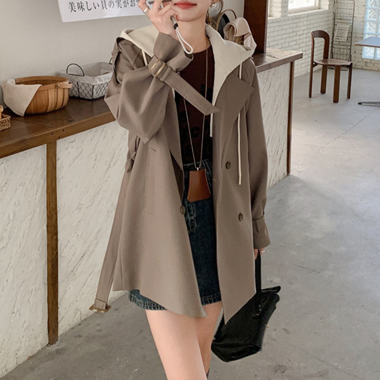 トレンド感と実用性を兼ね備えたフード付きダブルブレストトレンチコート。