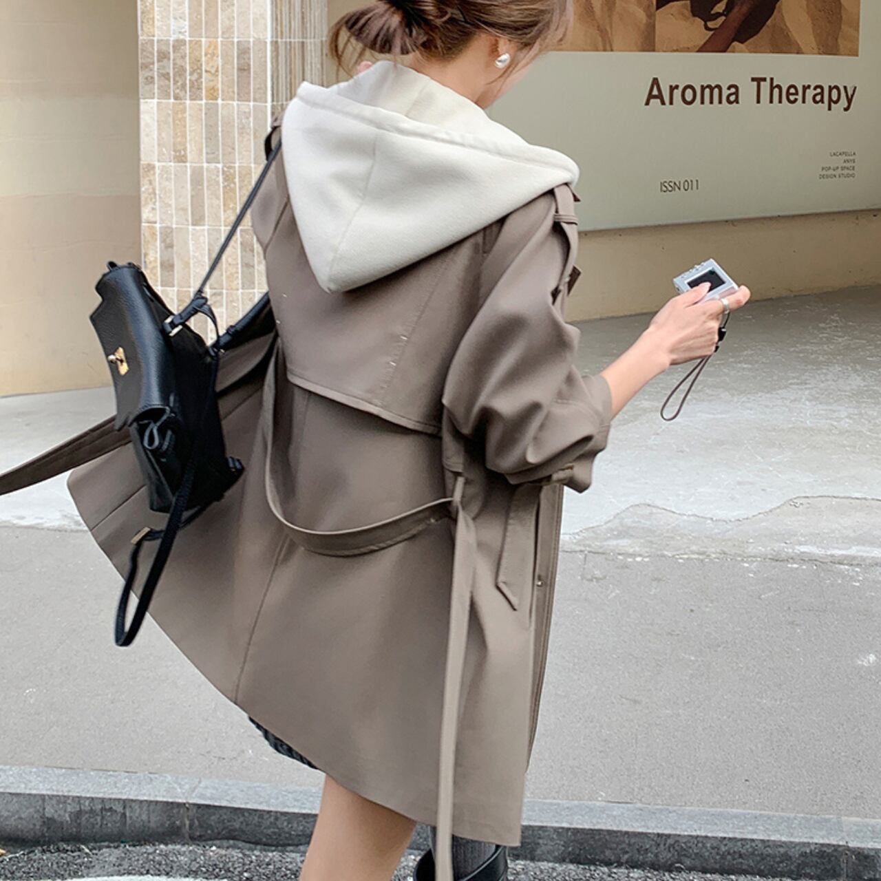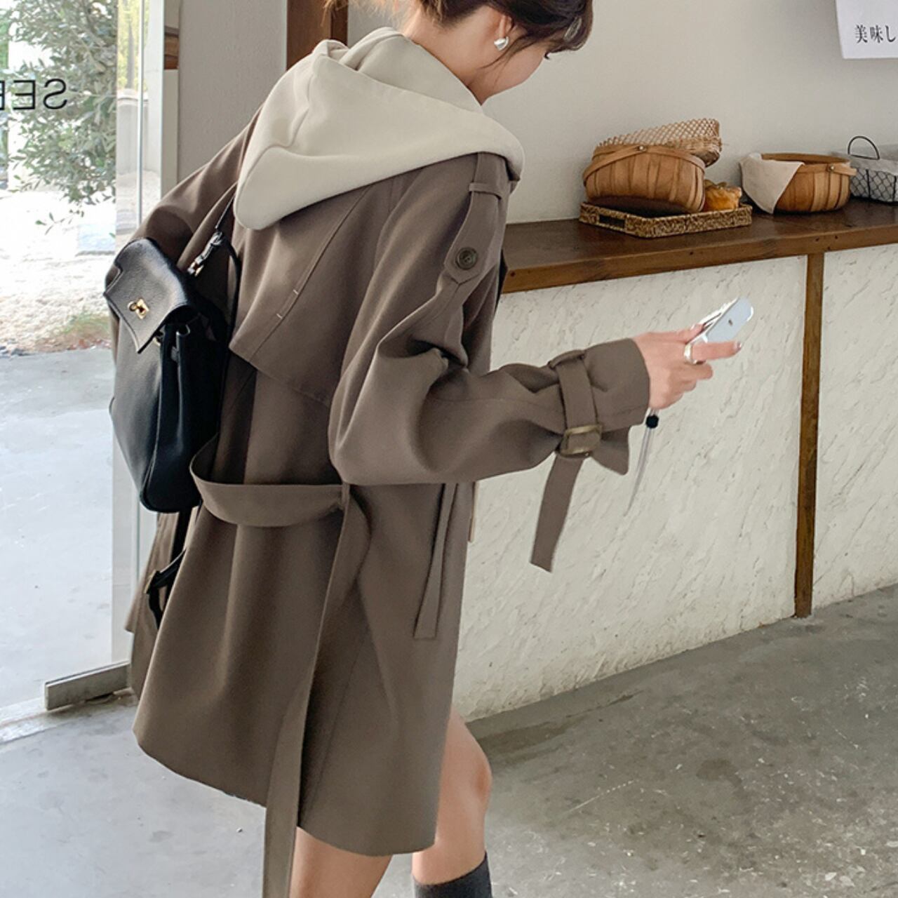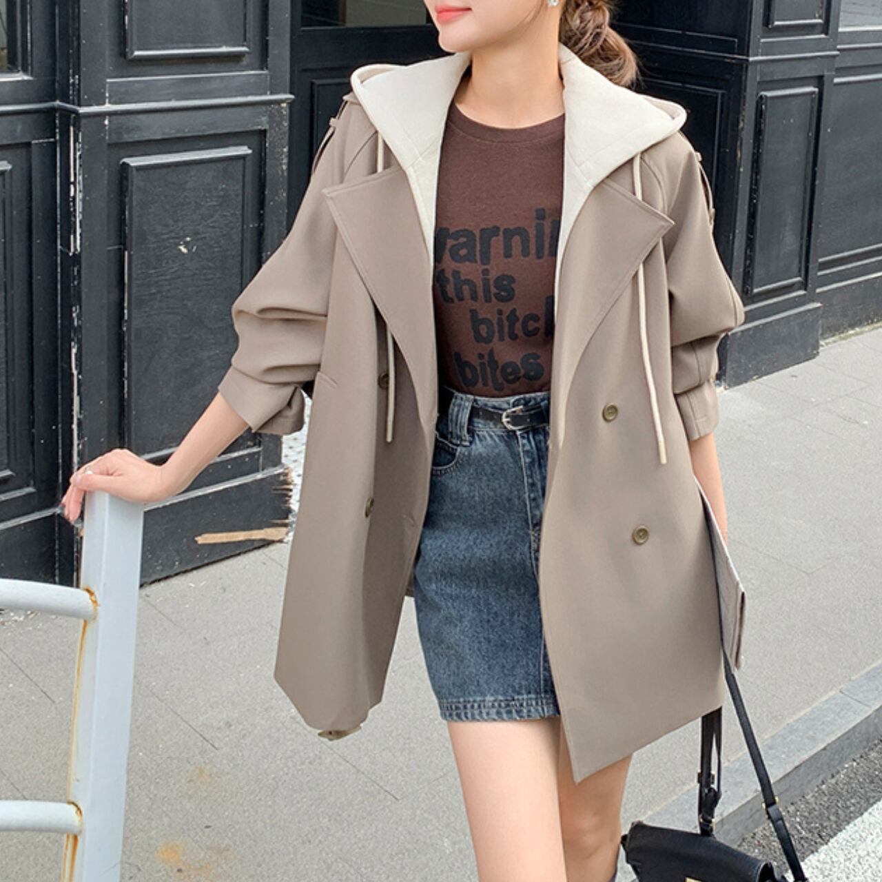 トレンド感と実用性を兼ね備えたフード付きダブルブレストトレンチコート。