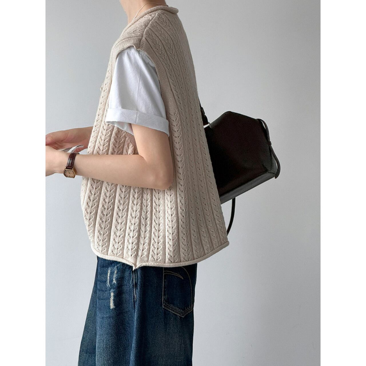 いつものトップスに重ねるだけで、スタイリングの幅が広がるニットベスト。