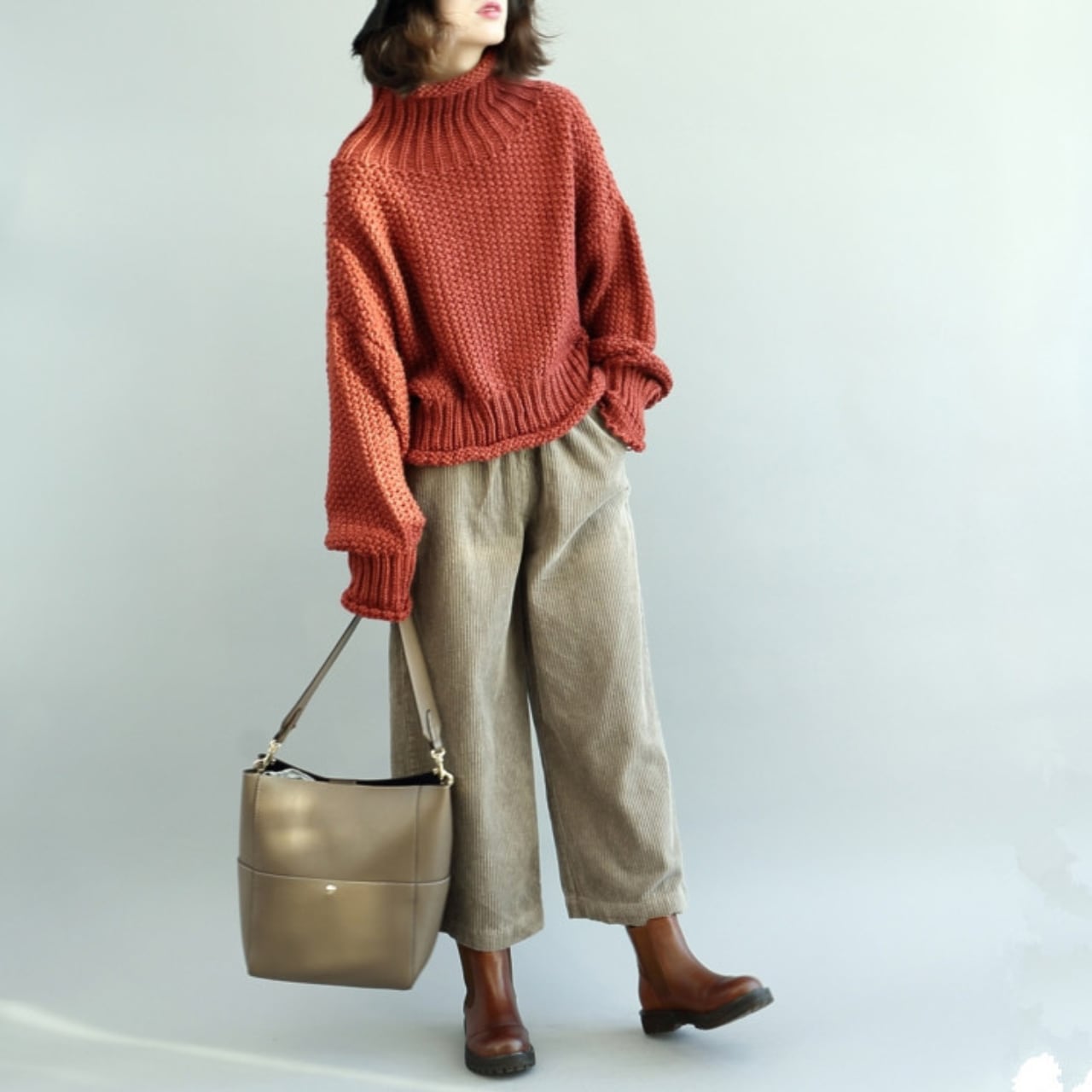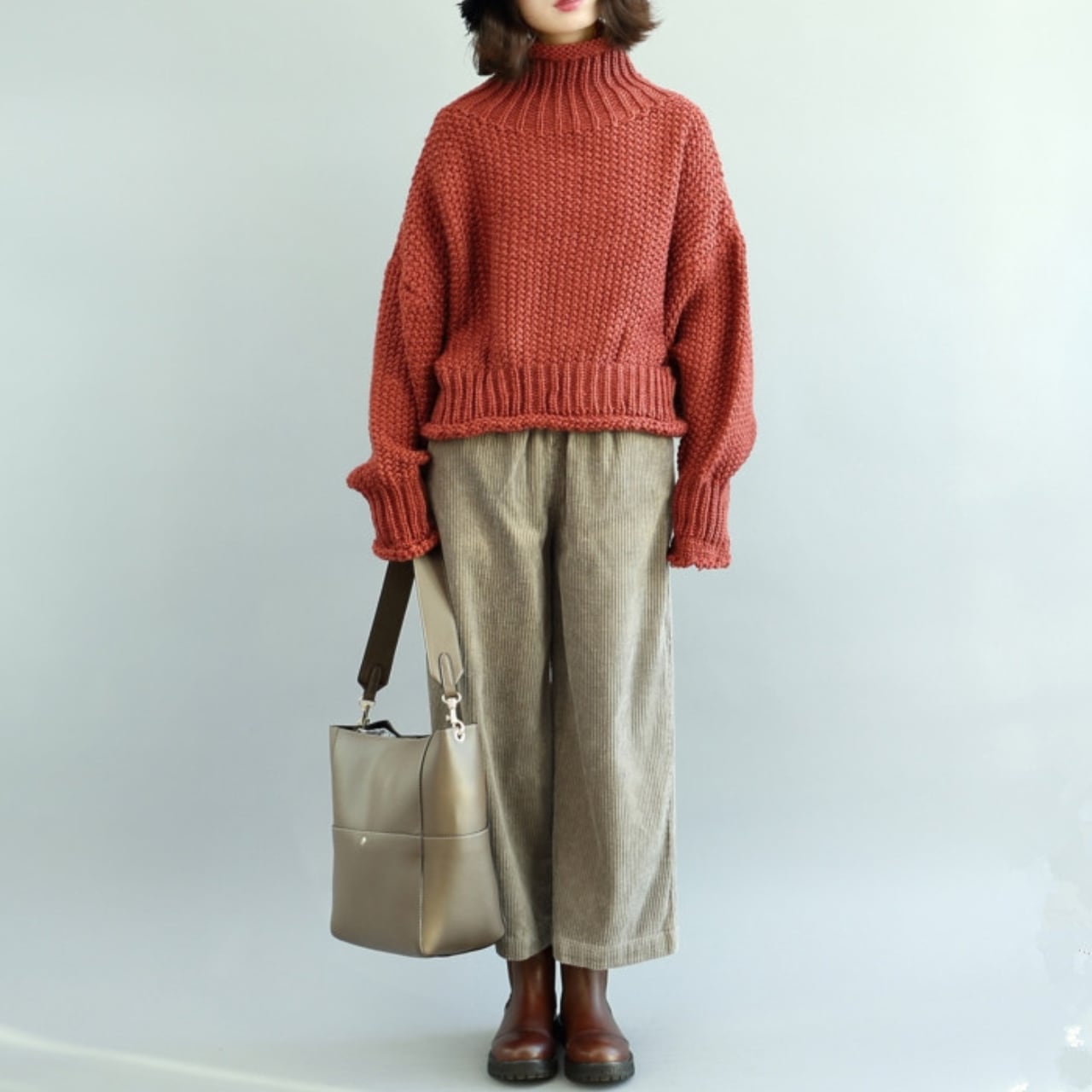 首元を暖かく包み込むハイネックデザインのニット。