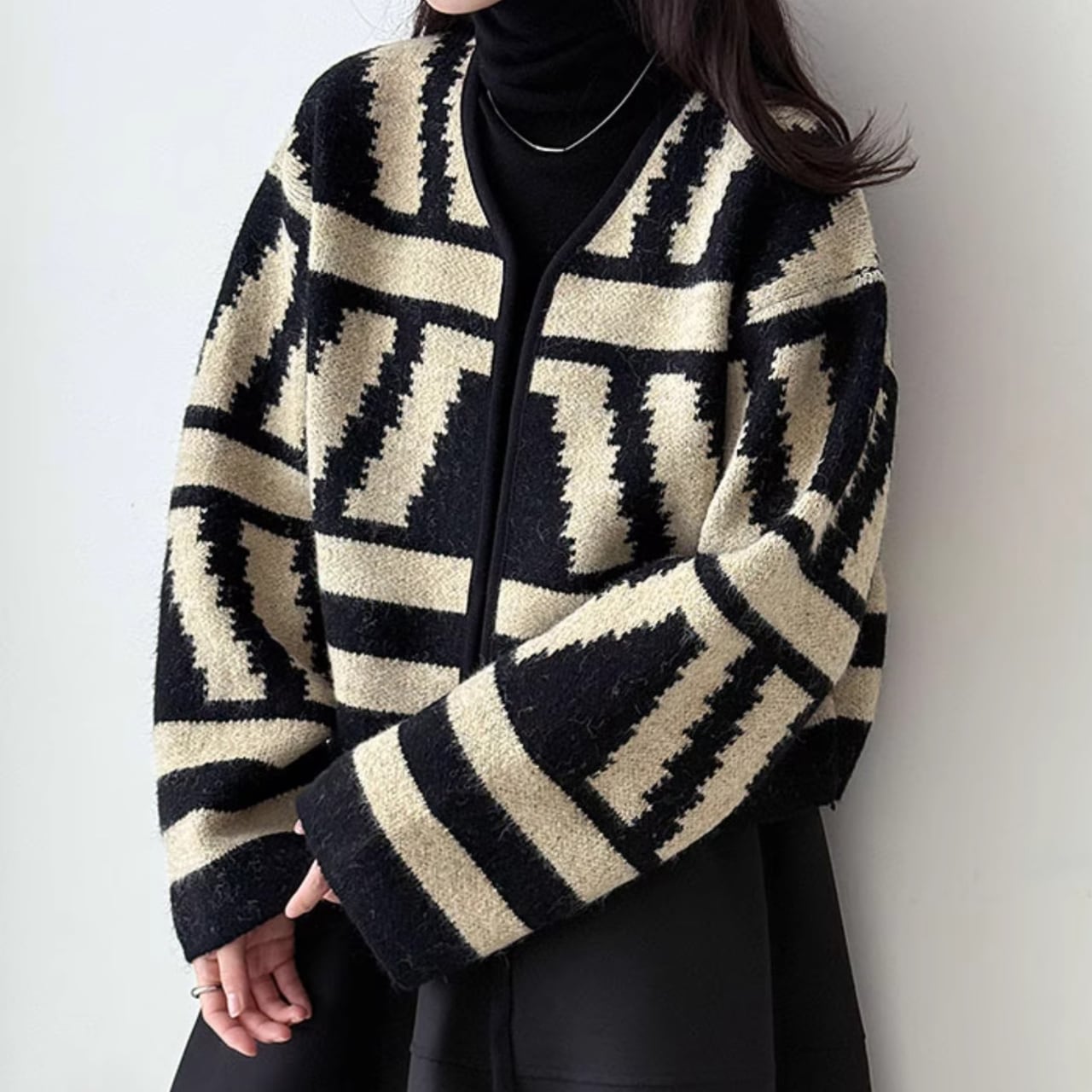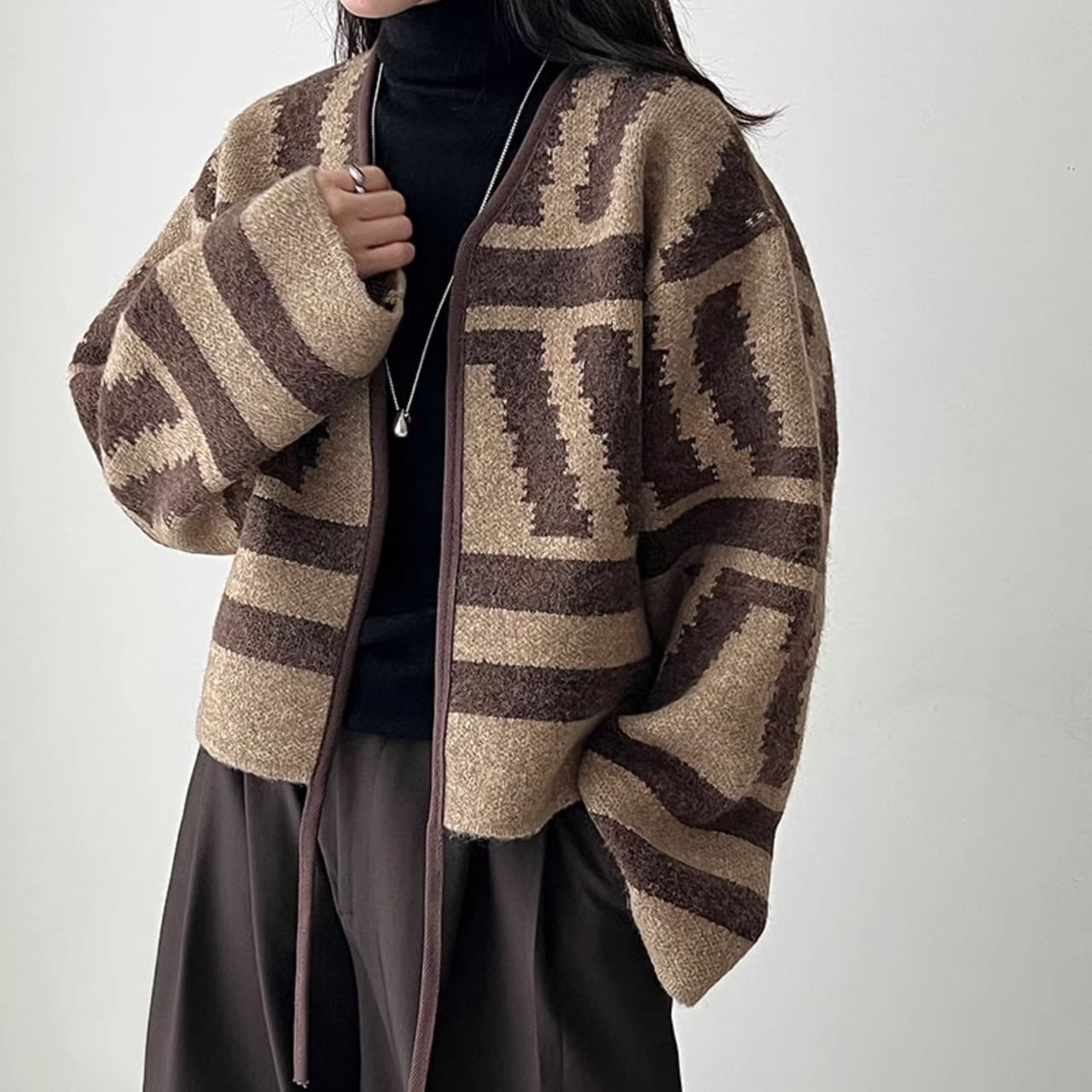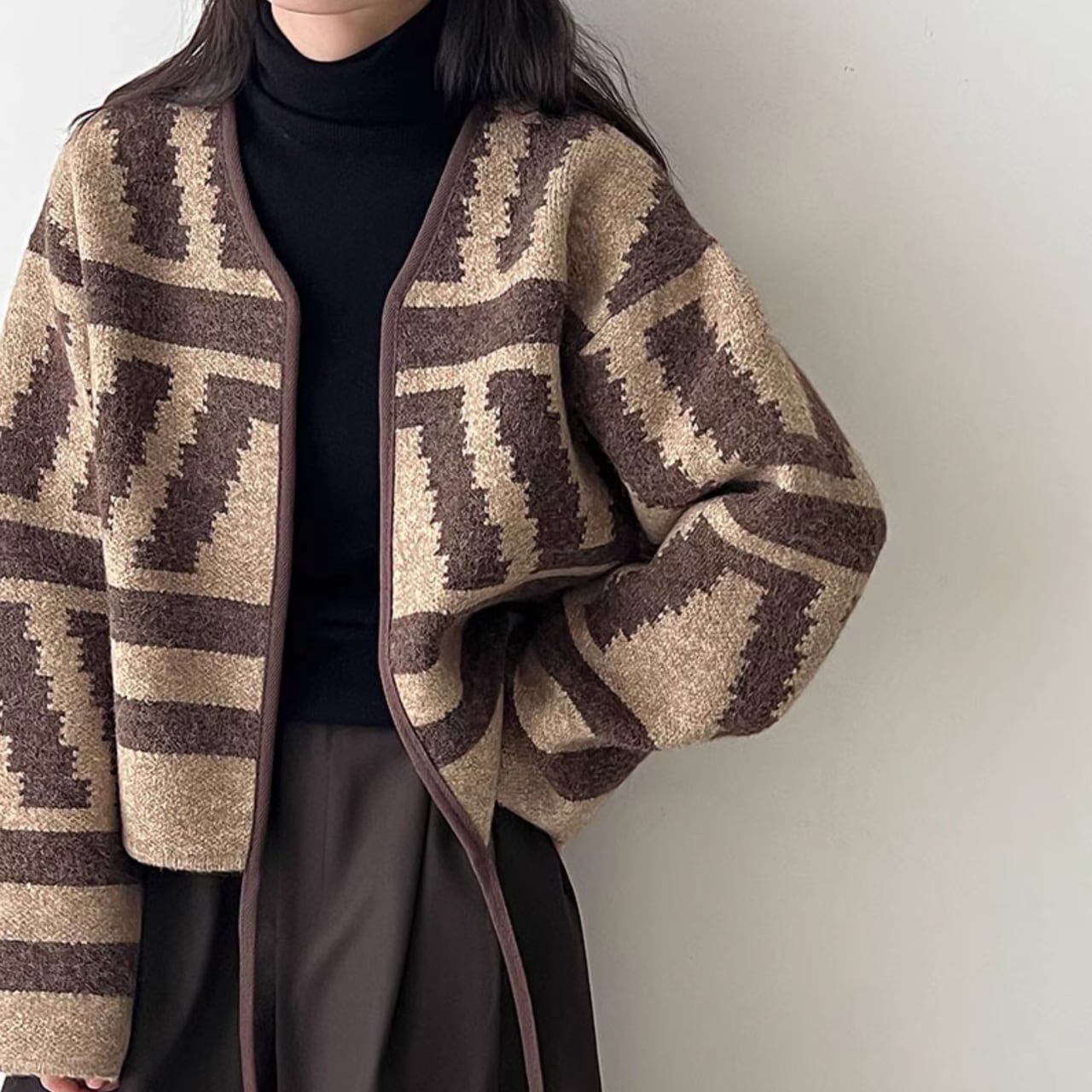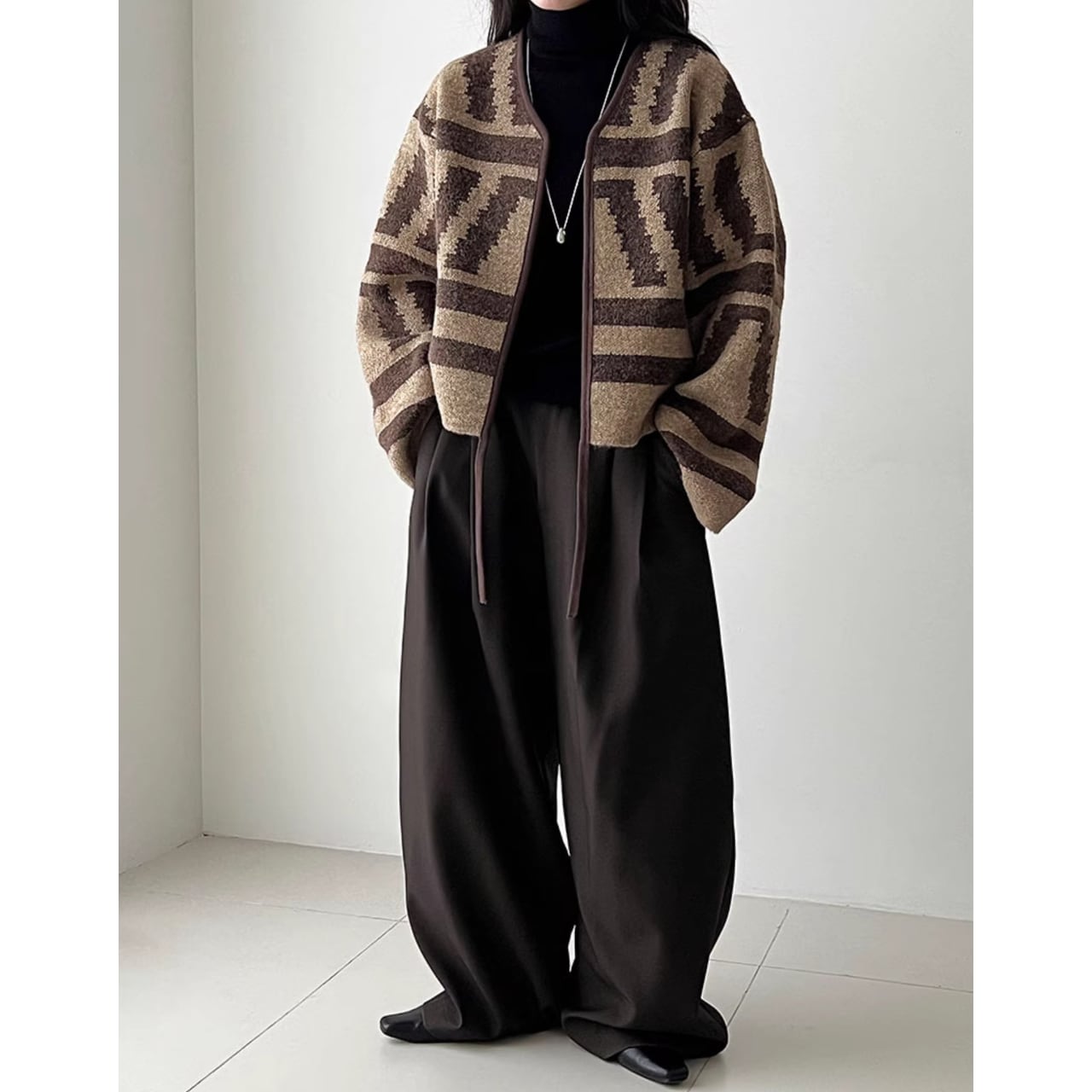 目を引くパターンは、シンプルな装いにアクセントを加え、洗練された印象を与えます。