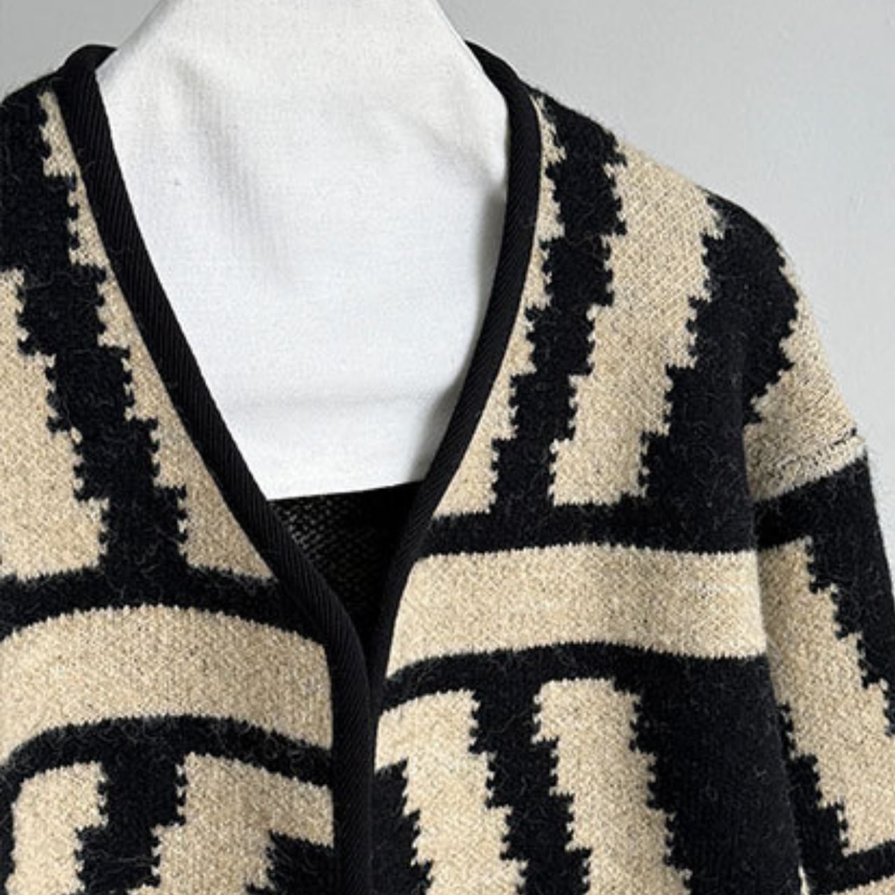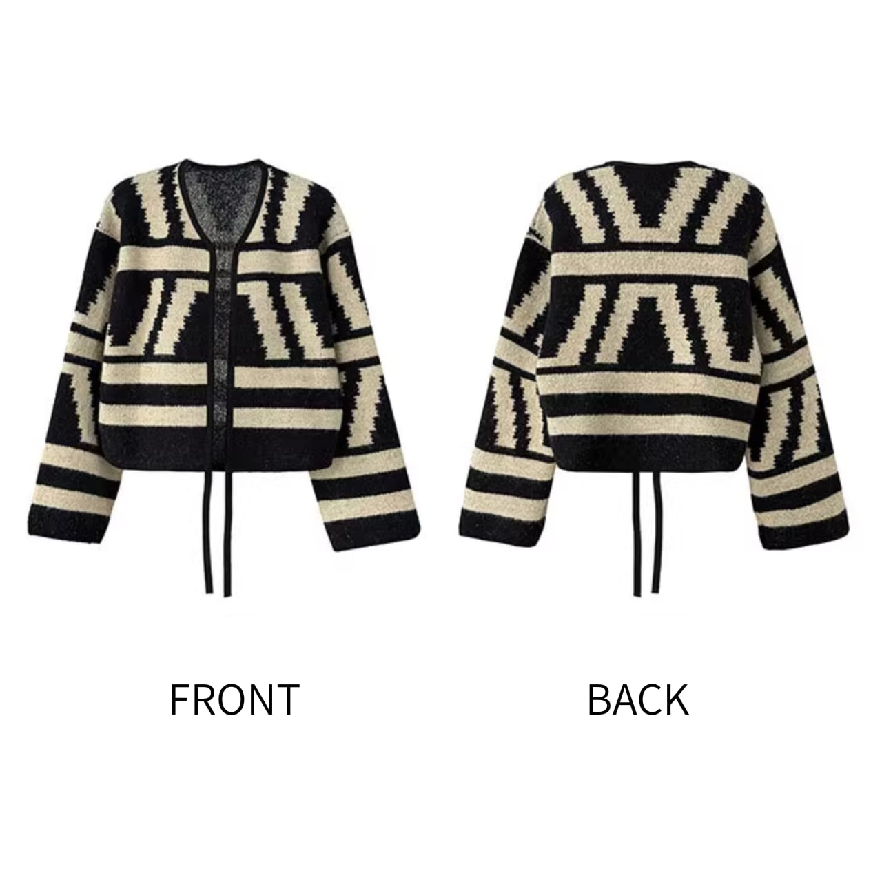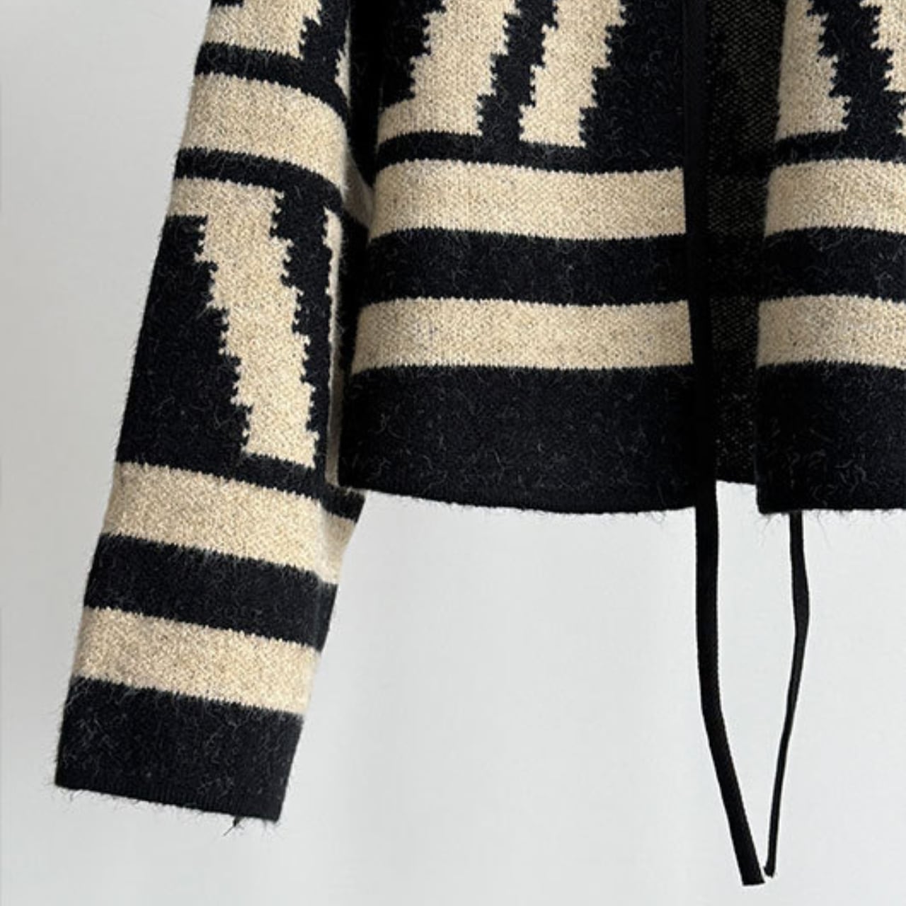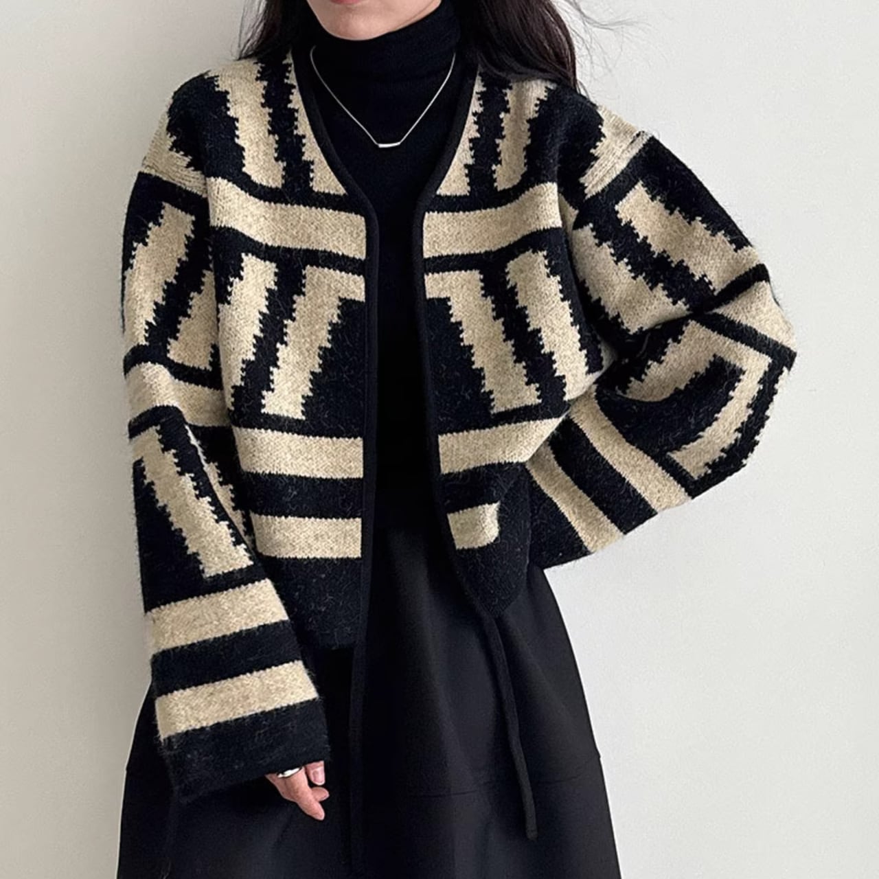 目を引くパターンは、シンプルな装いにアクセントを加え、洗練された印象を与えます。