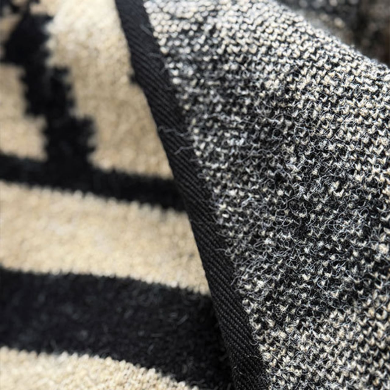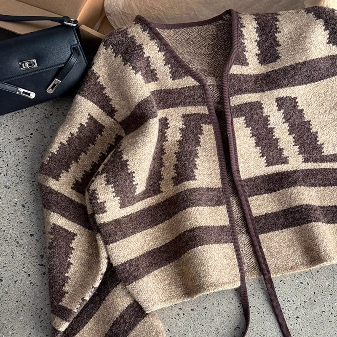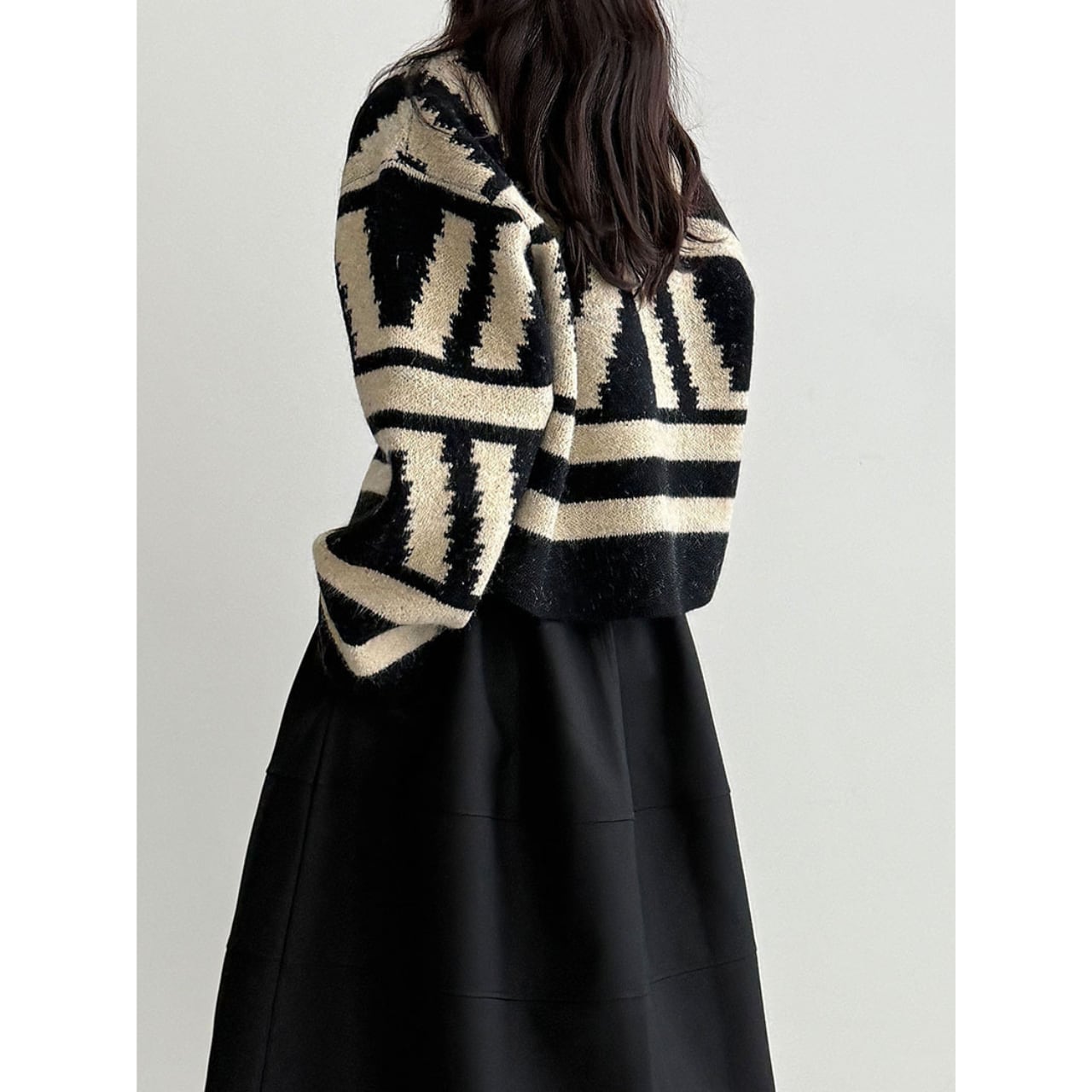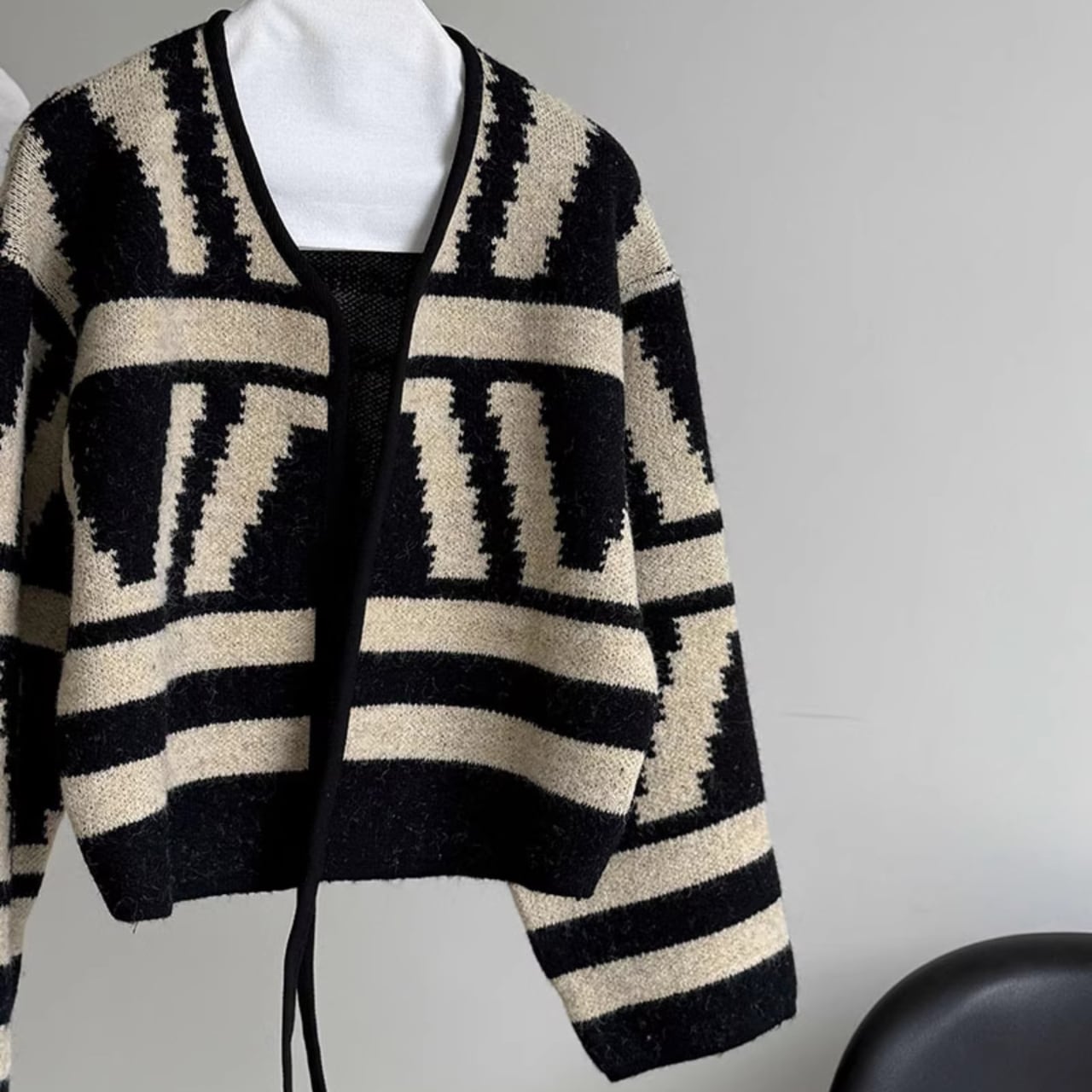 目を引くパターンは、シンプルな装いにアクセントを加え、洗練された印象を与えます。