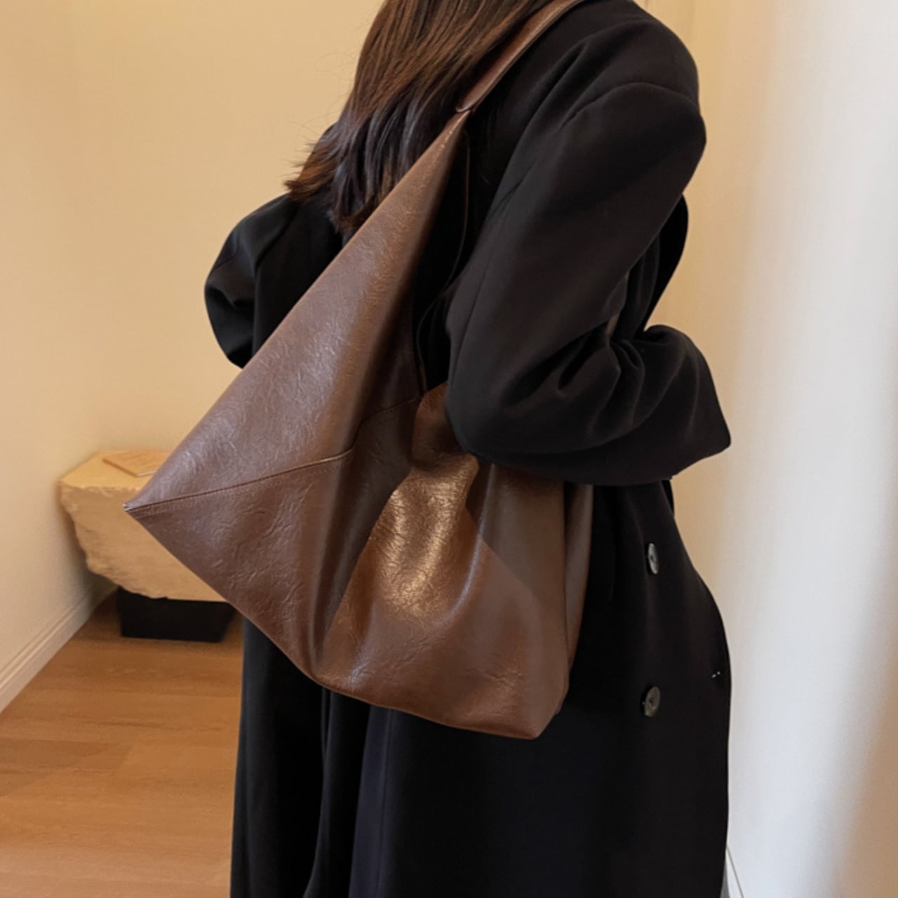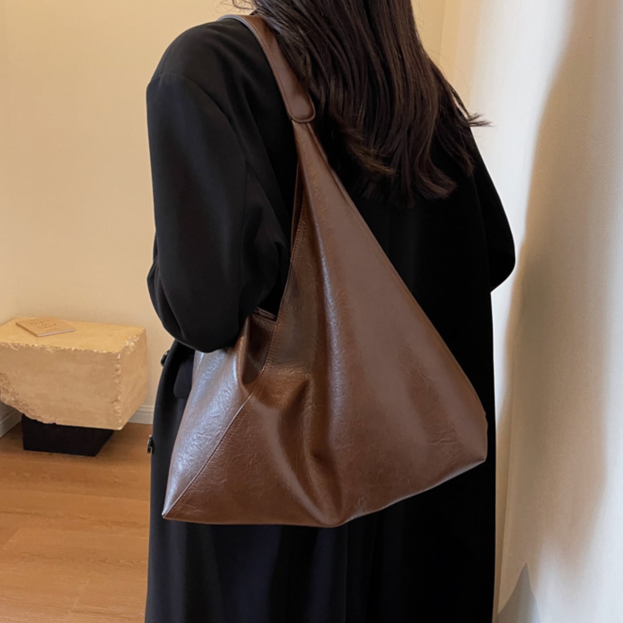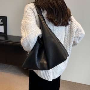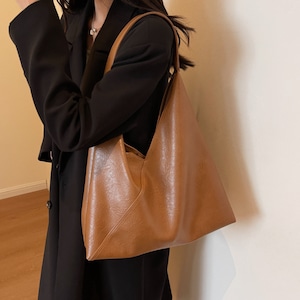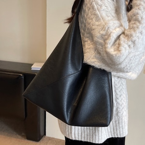普段使いに便利な、フェイクレザーのトートバッグ。