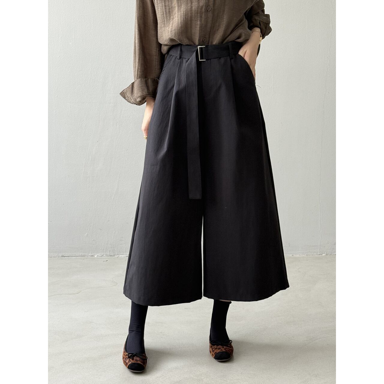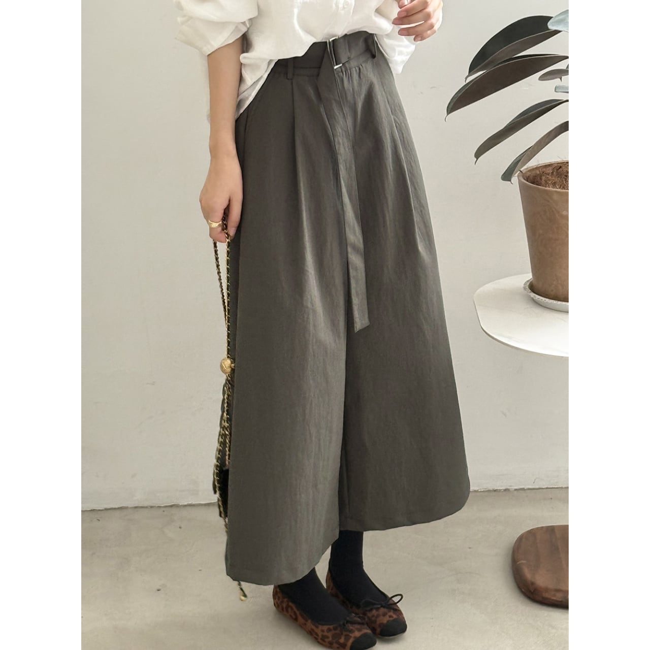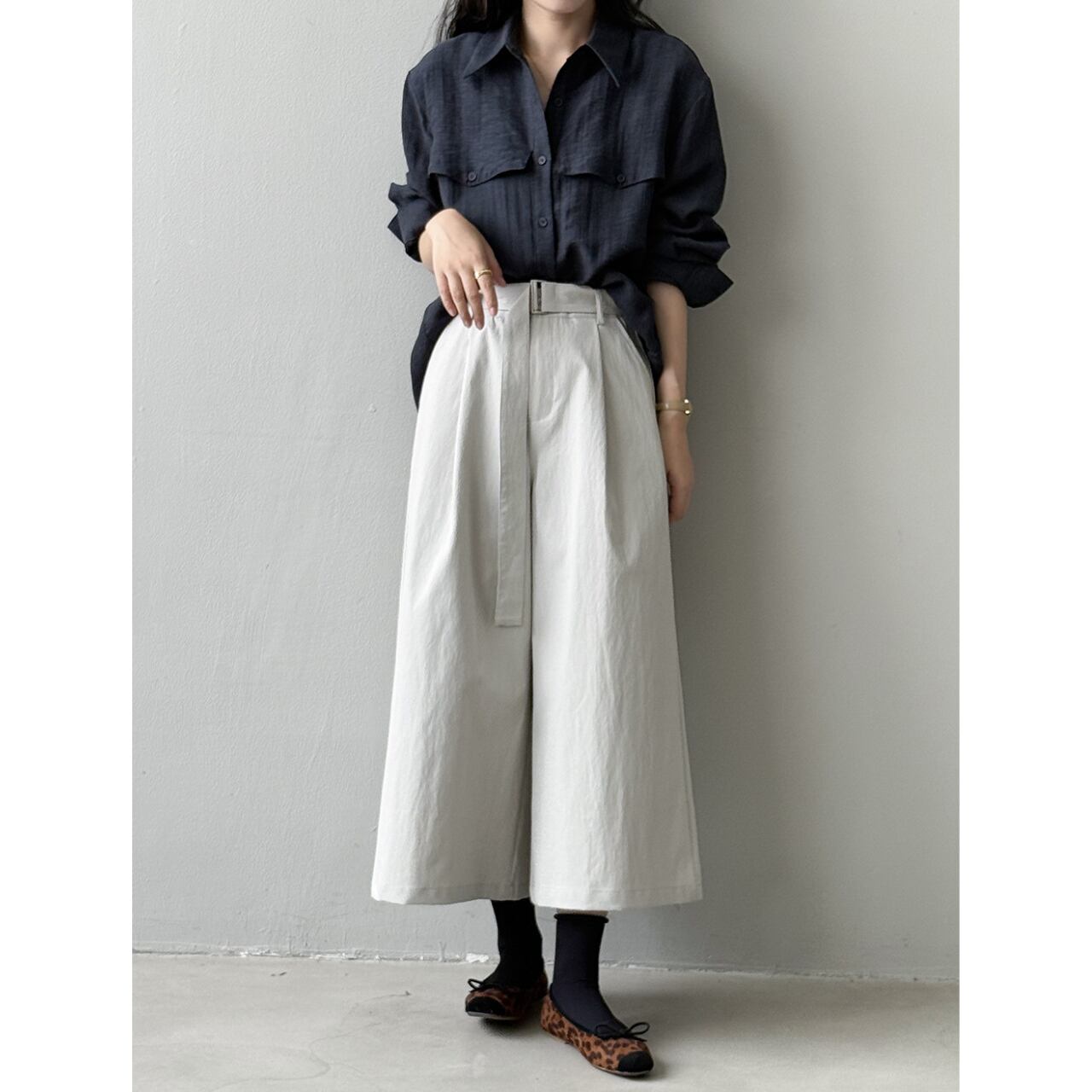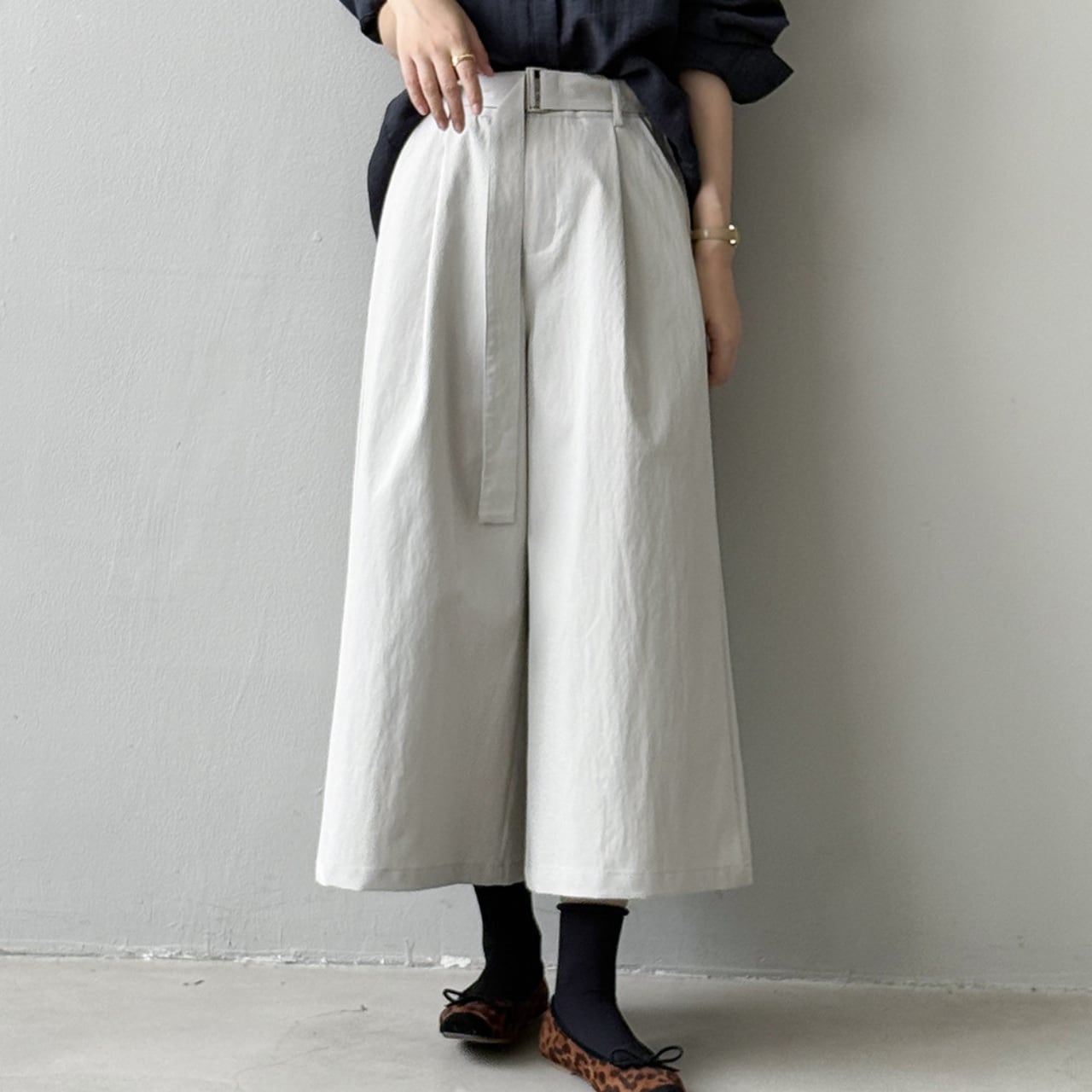 ベルトでウエストを調整できるので、トップスに合わせてシルエットを変えられます。