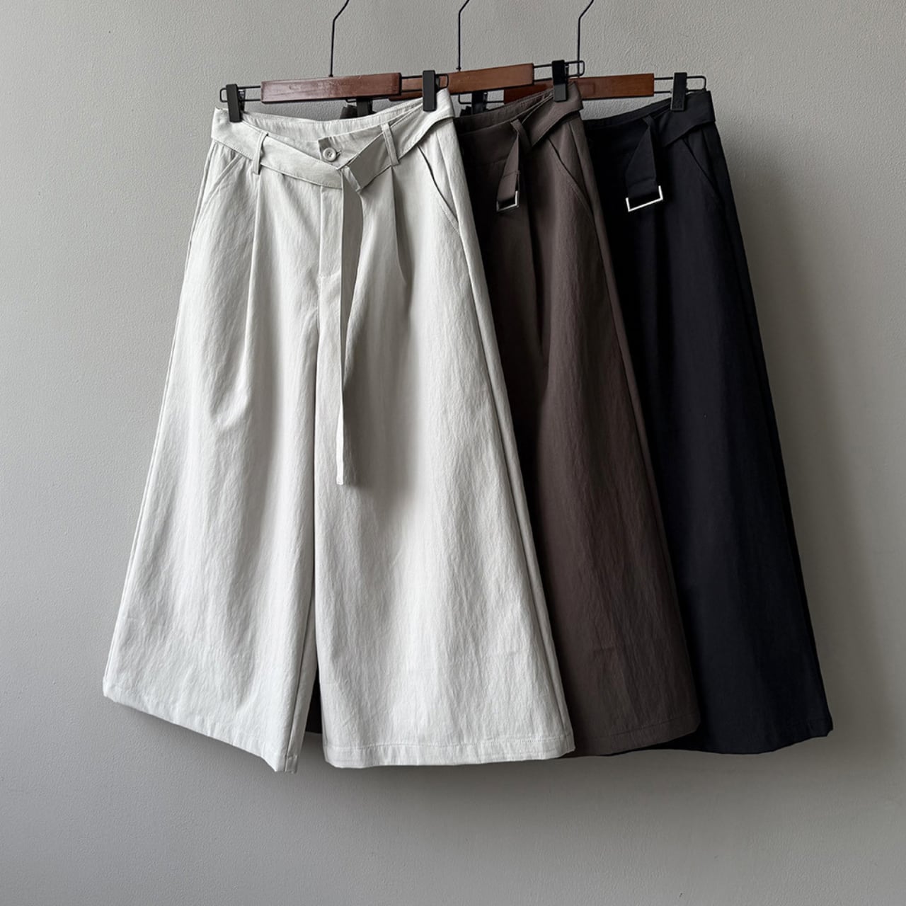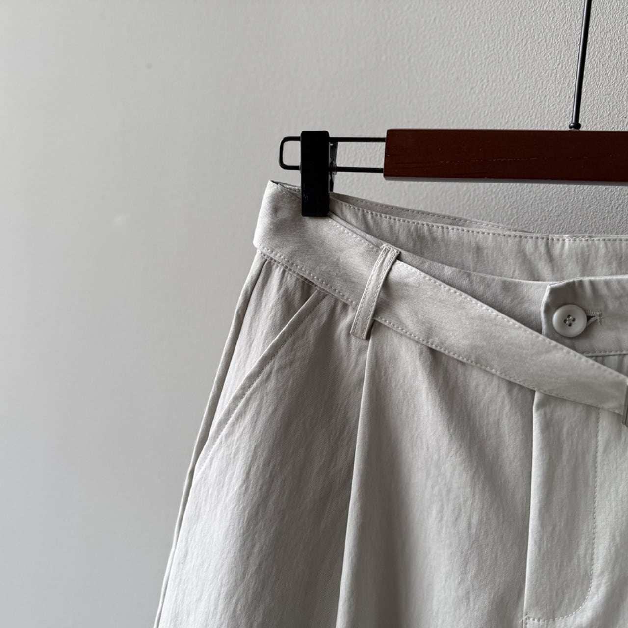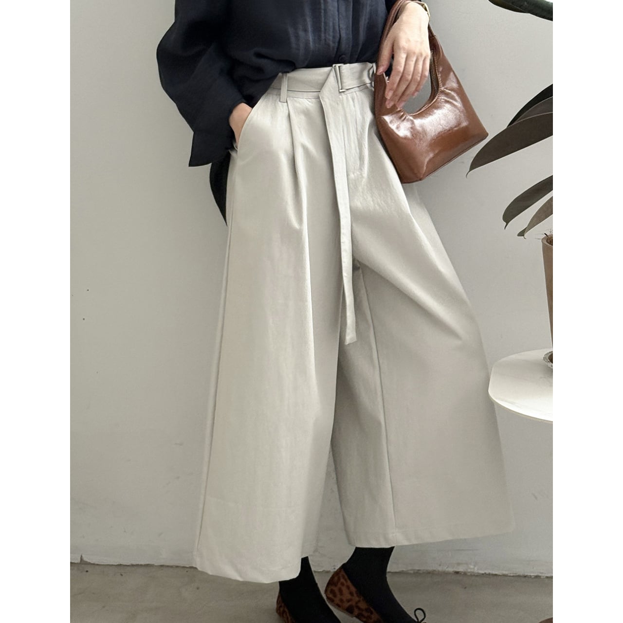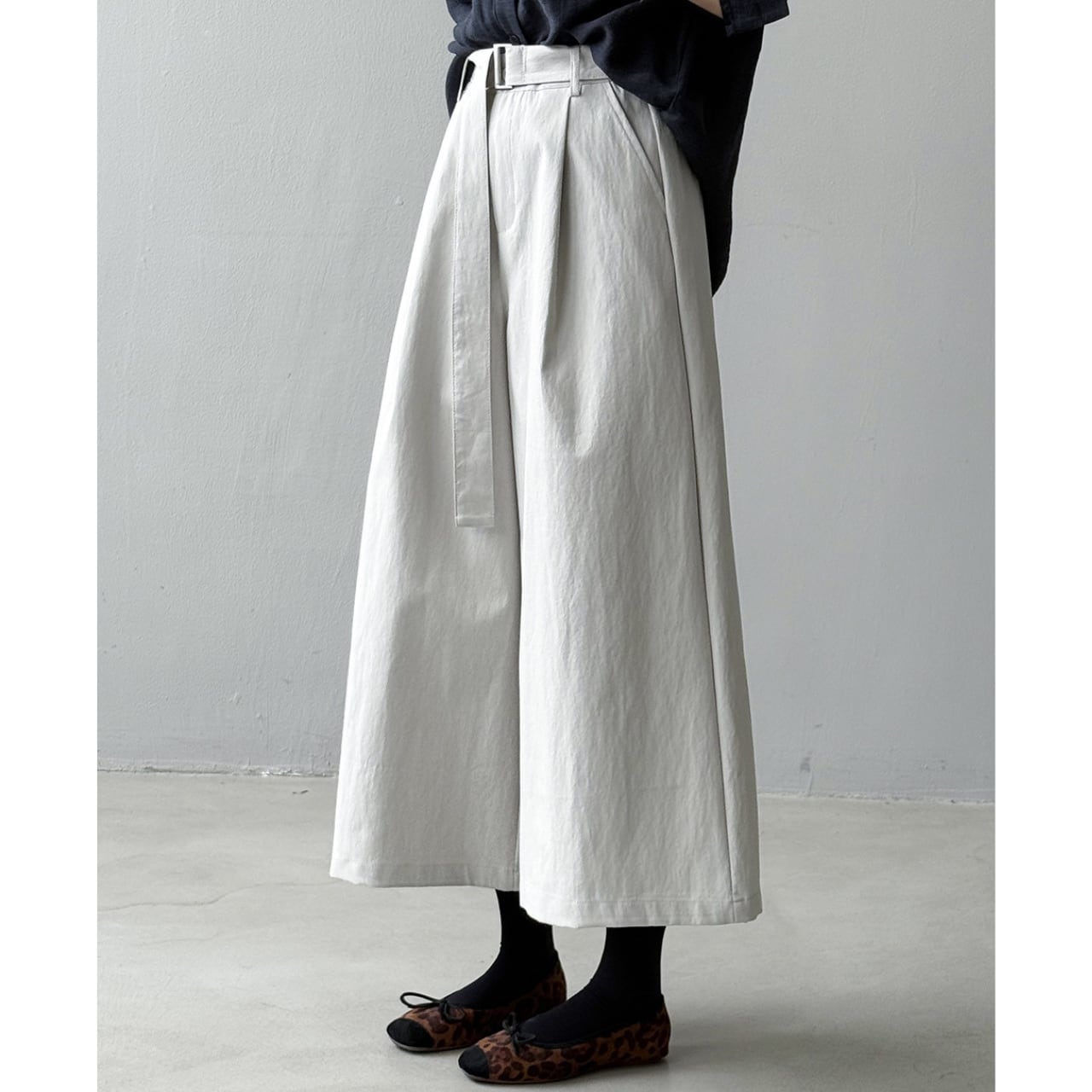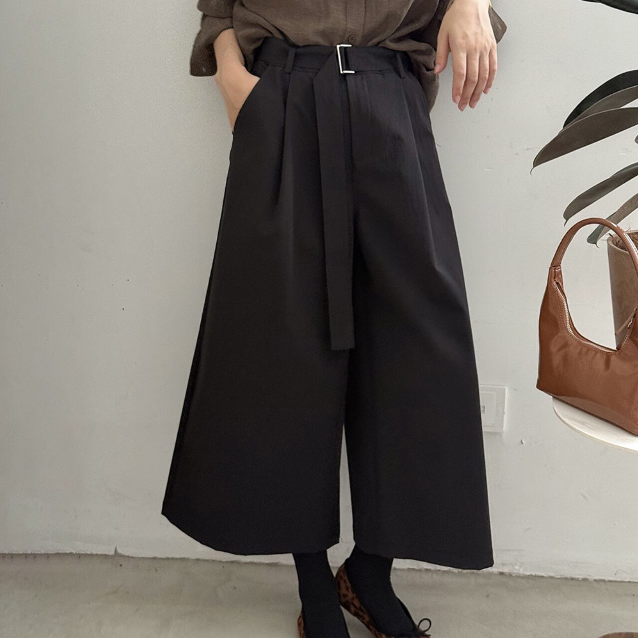ベルトでウエストを調整できるので、トップスに合わせてシルエットを変えられます。