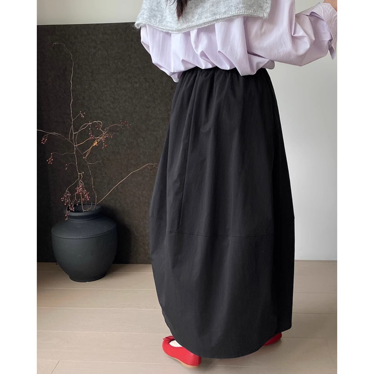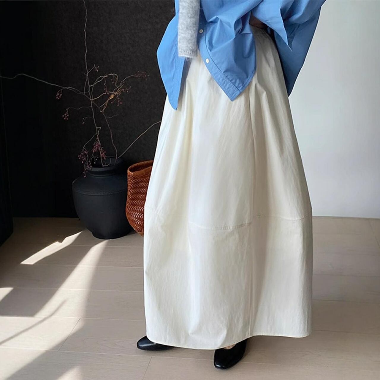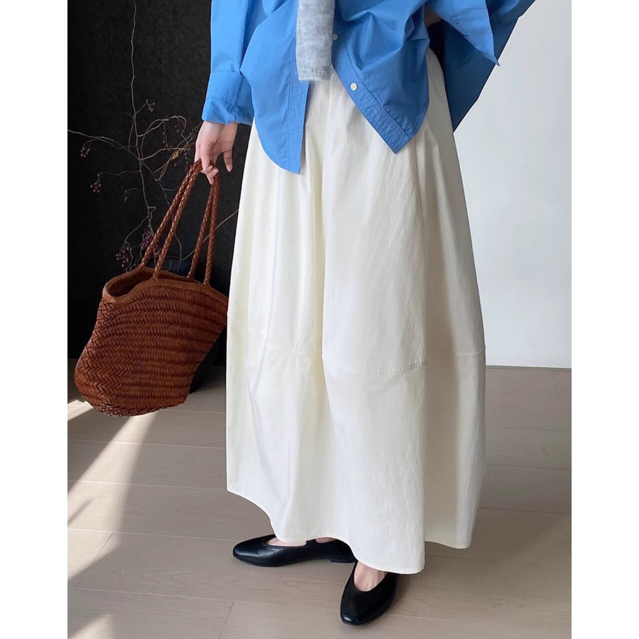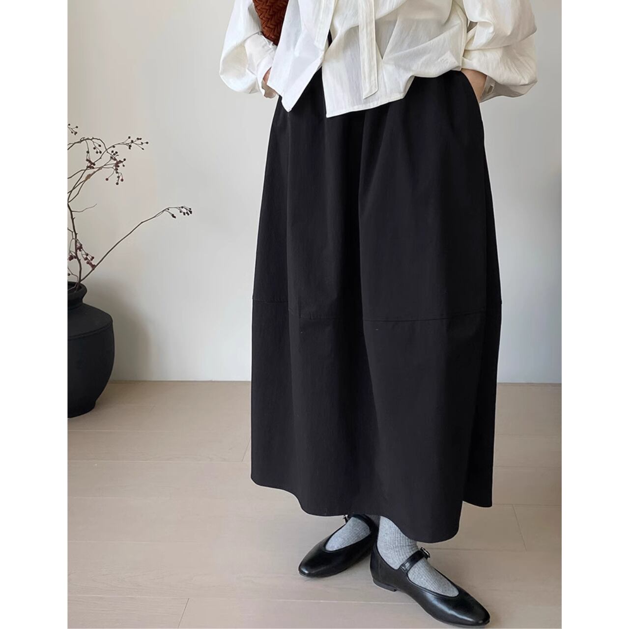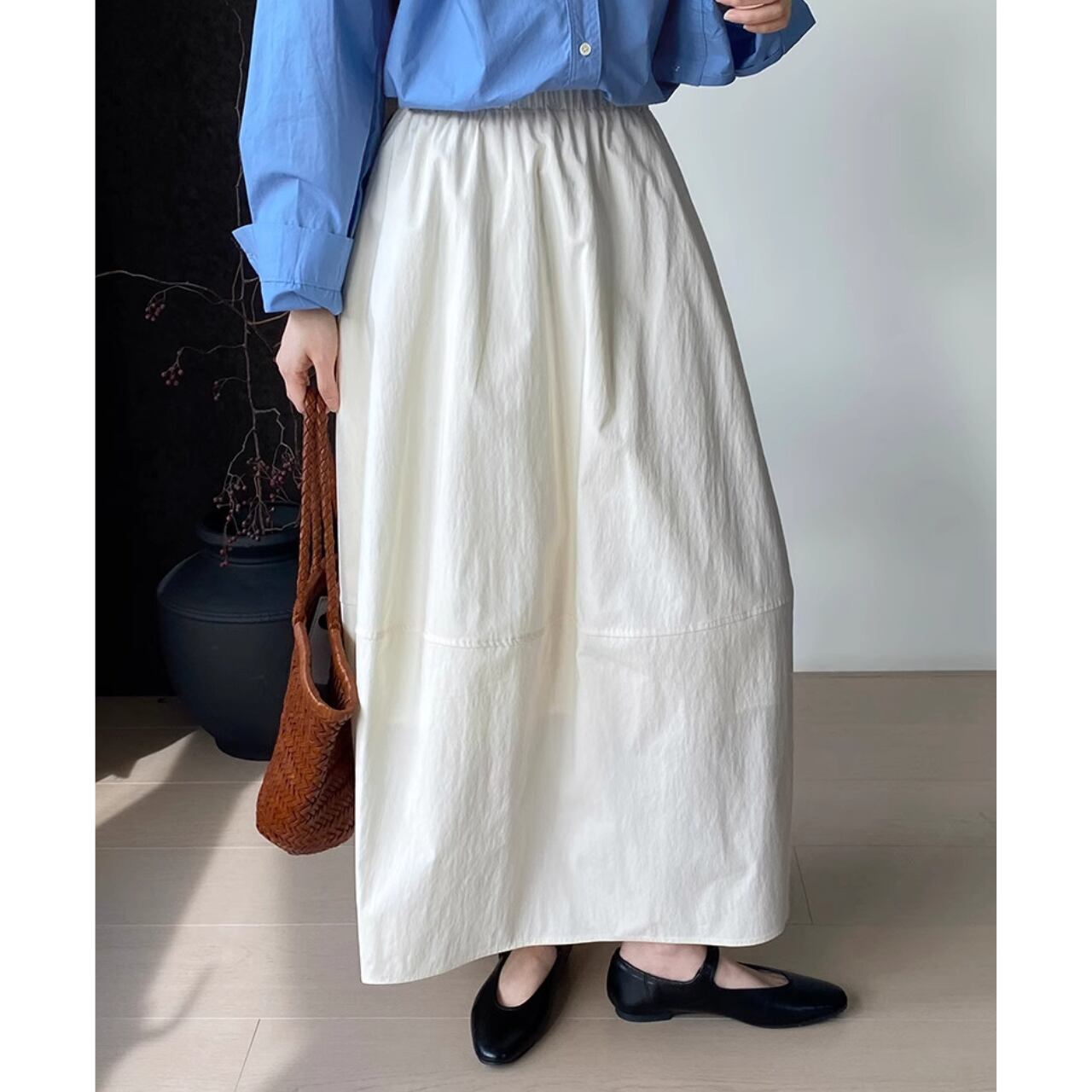シンプルなトップスに合わせるだけで、こなれ感のある着こなしが完成するコクーンスカート。