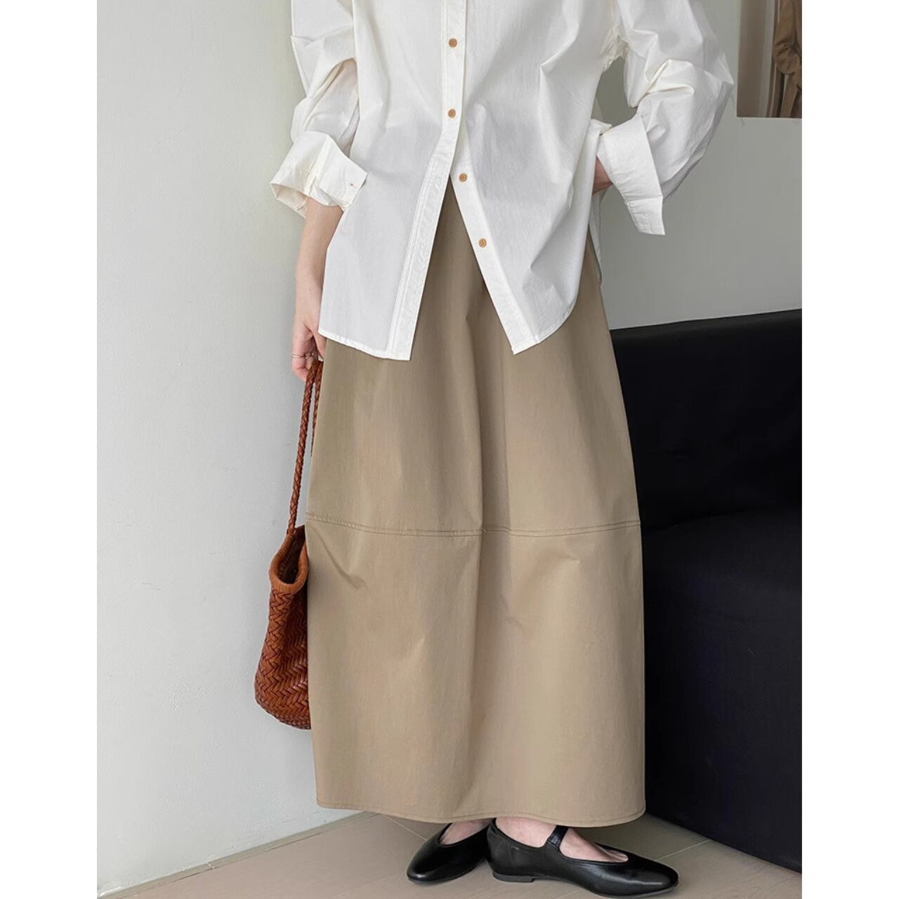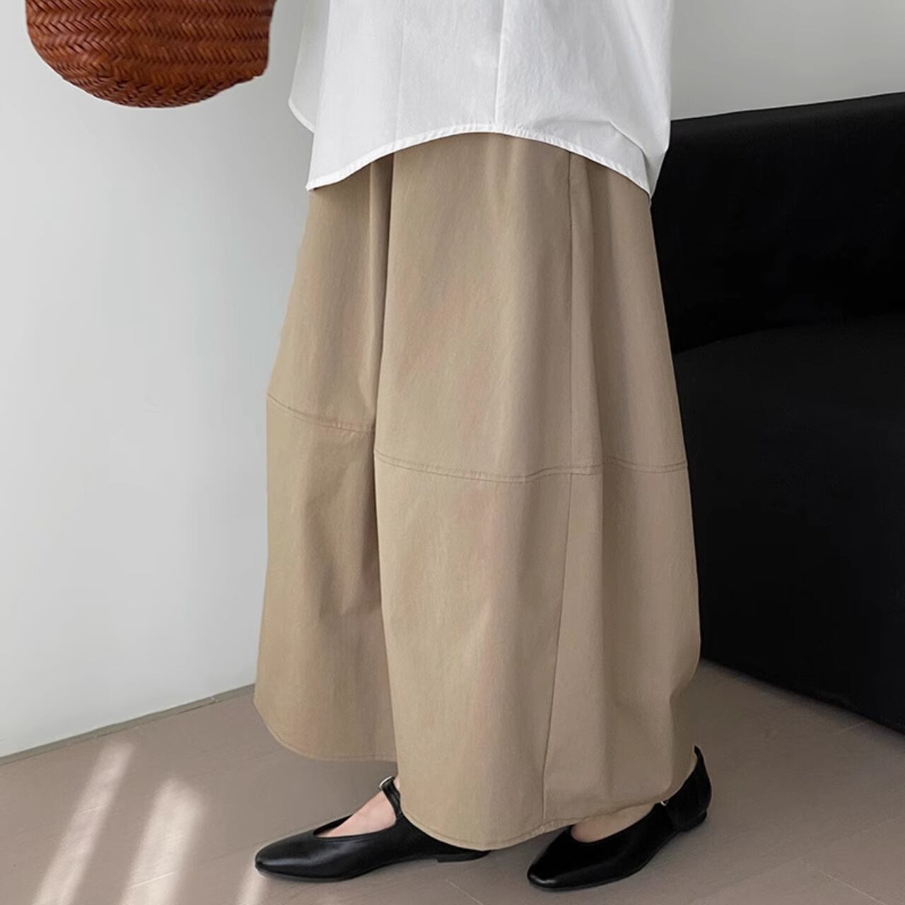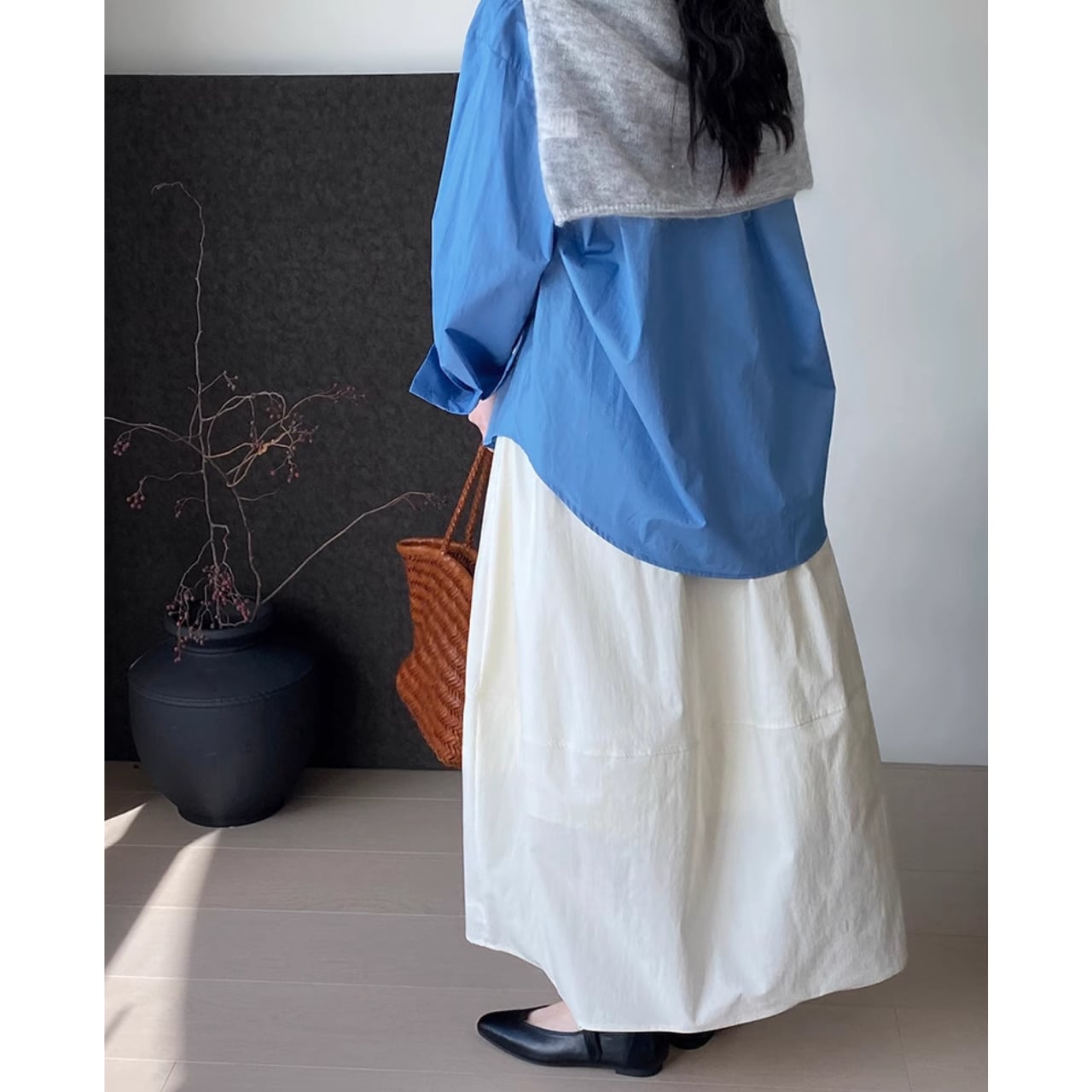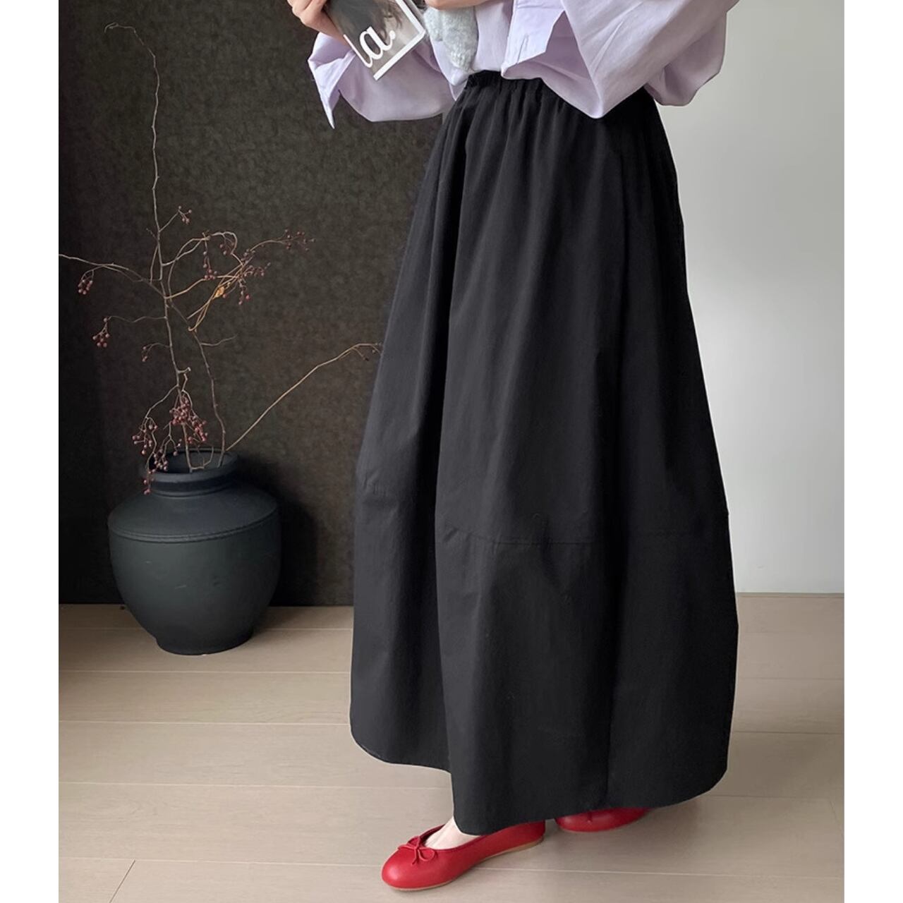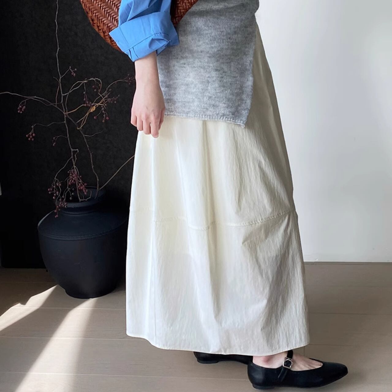 シンプルなトップスに合わせるだけで、こなれ感のある着こなしが完成するコクーンスカート。