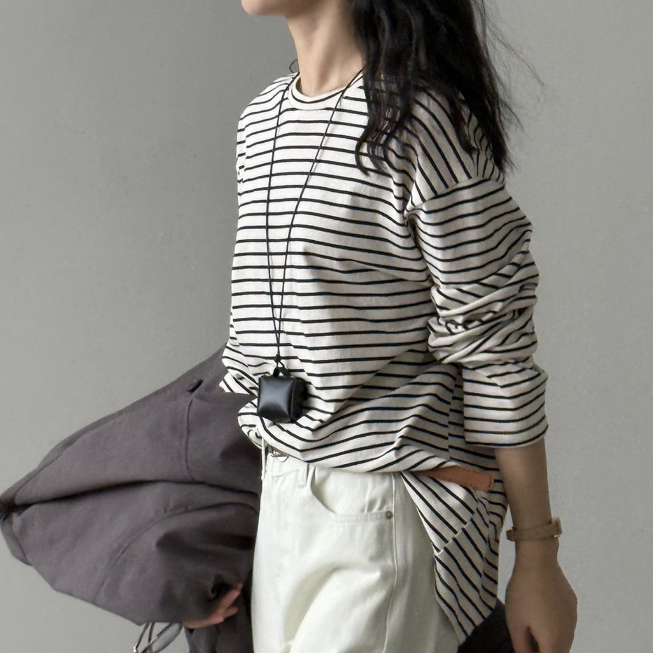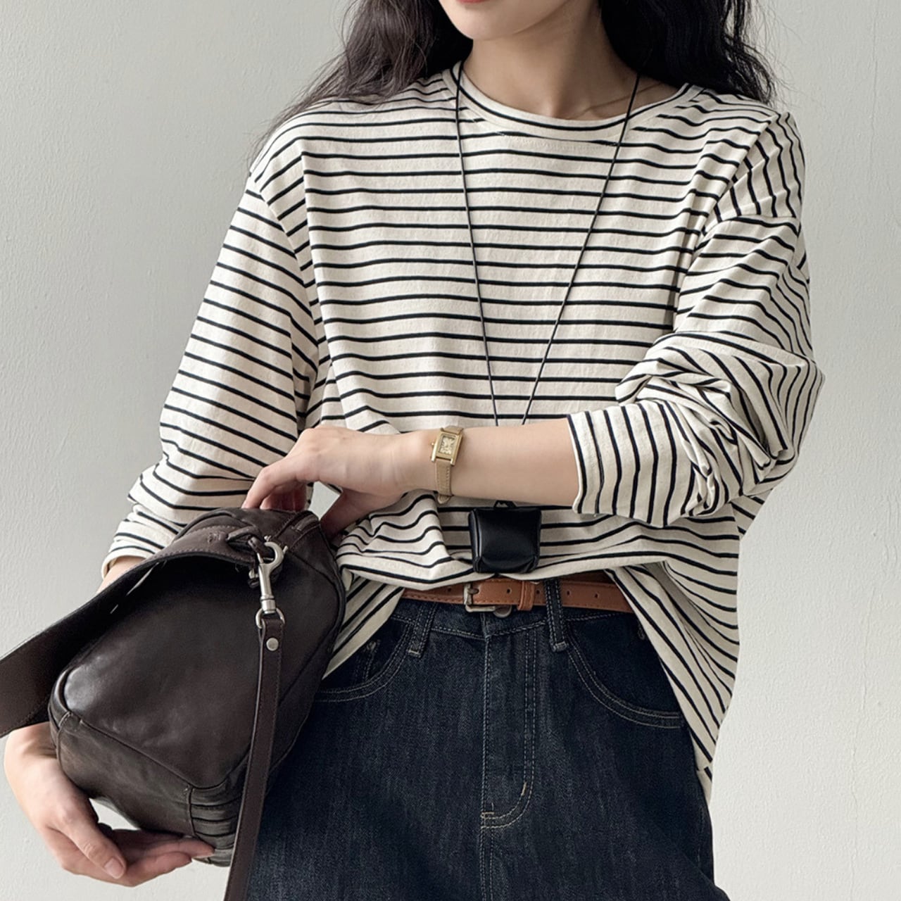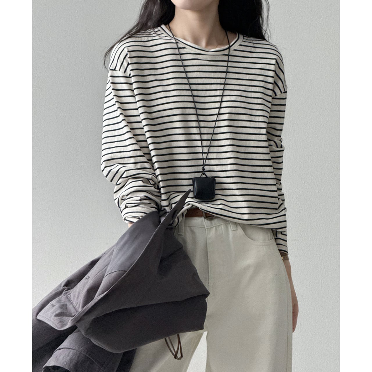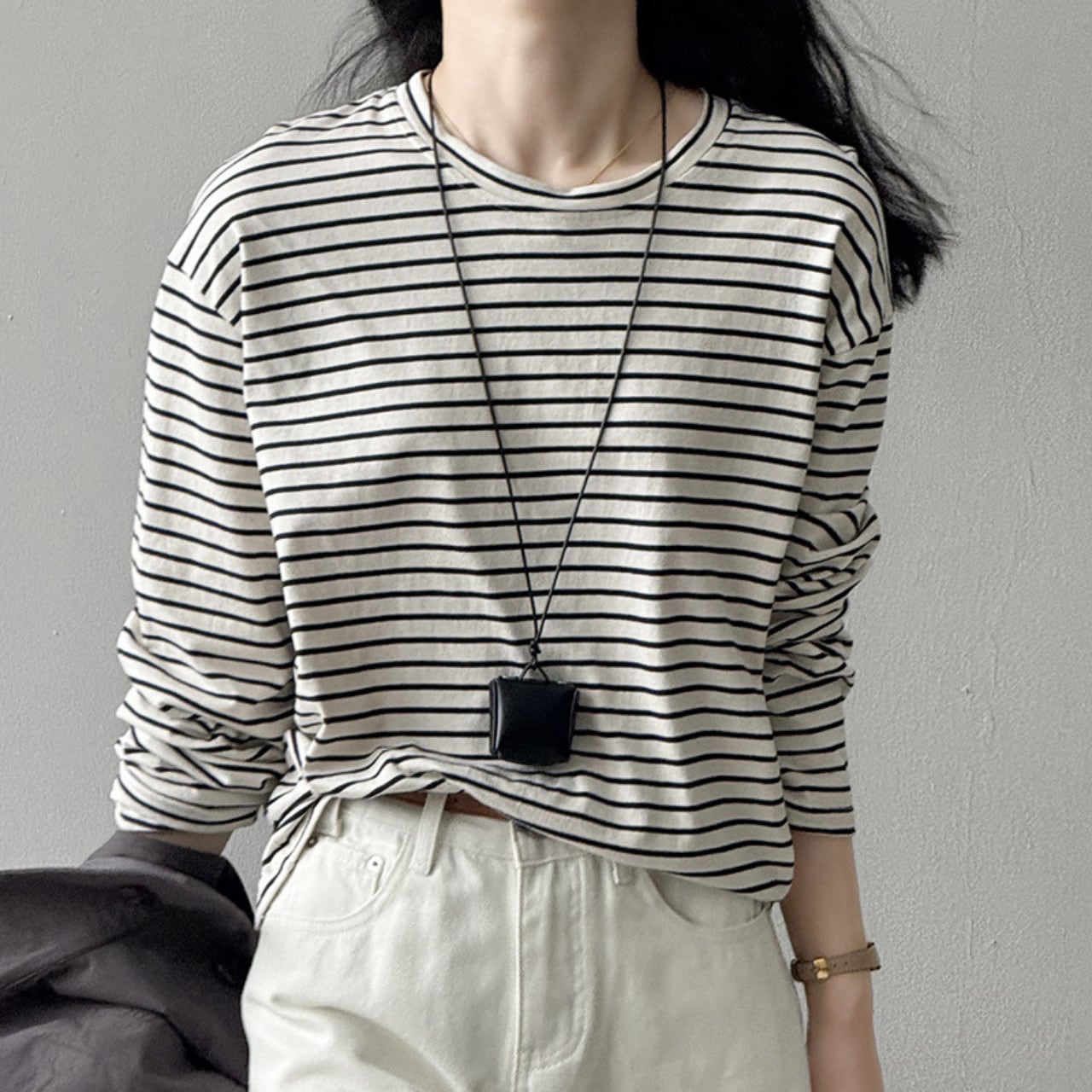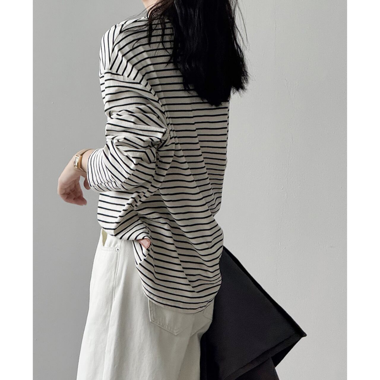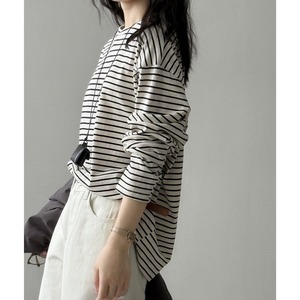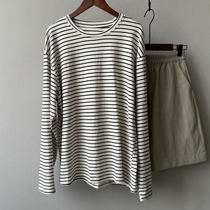 シンプルながらも存在感を放つ、ボーダー柄の長袖Tシャツ。