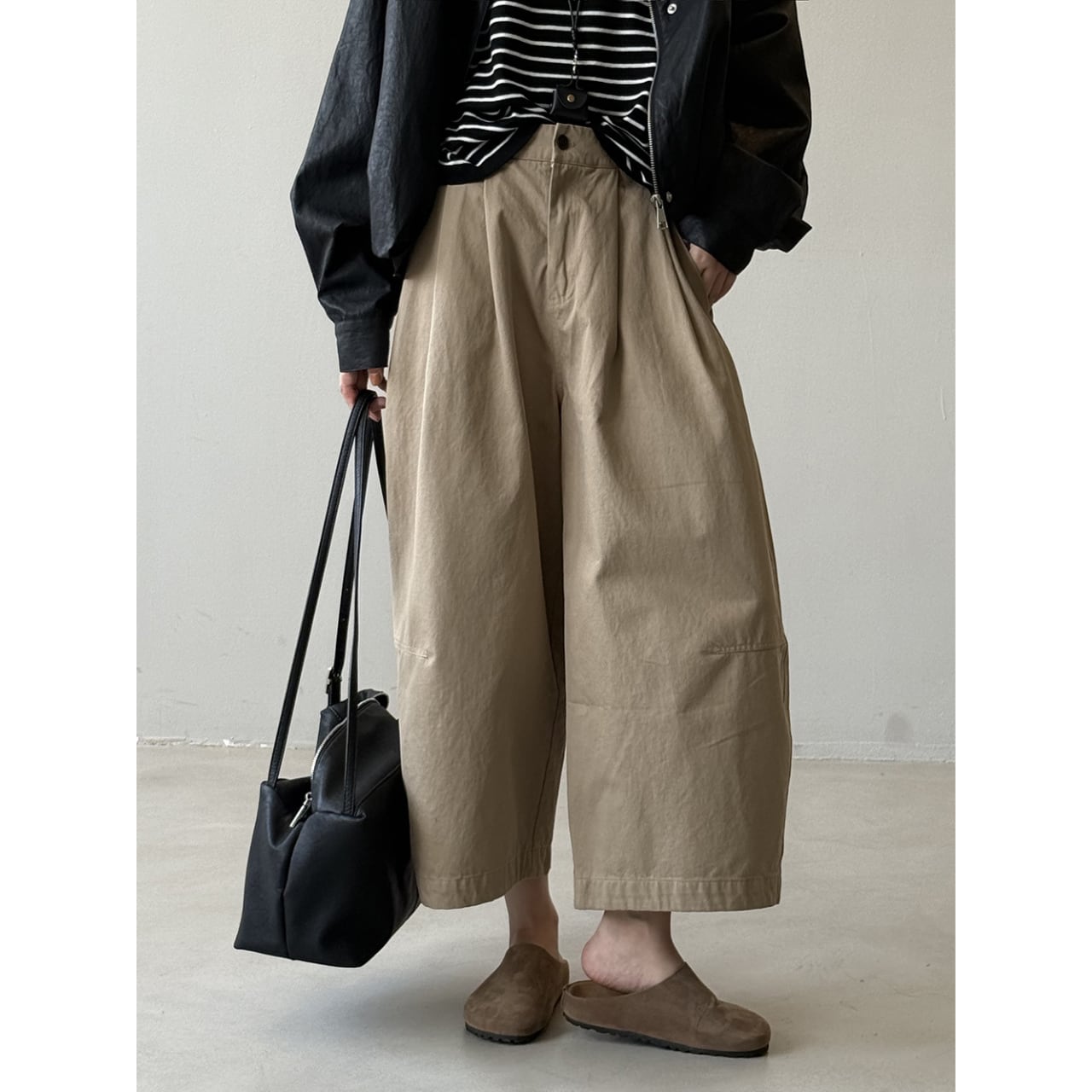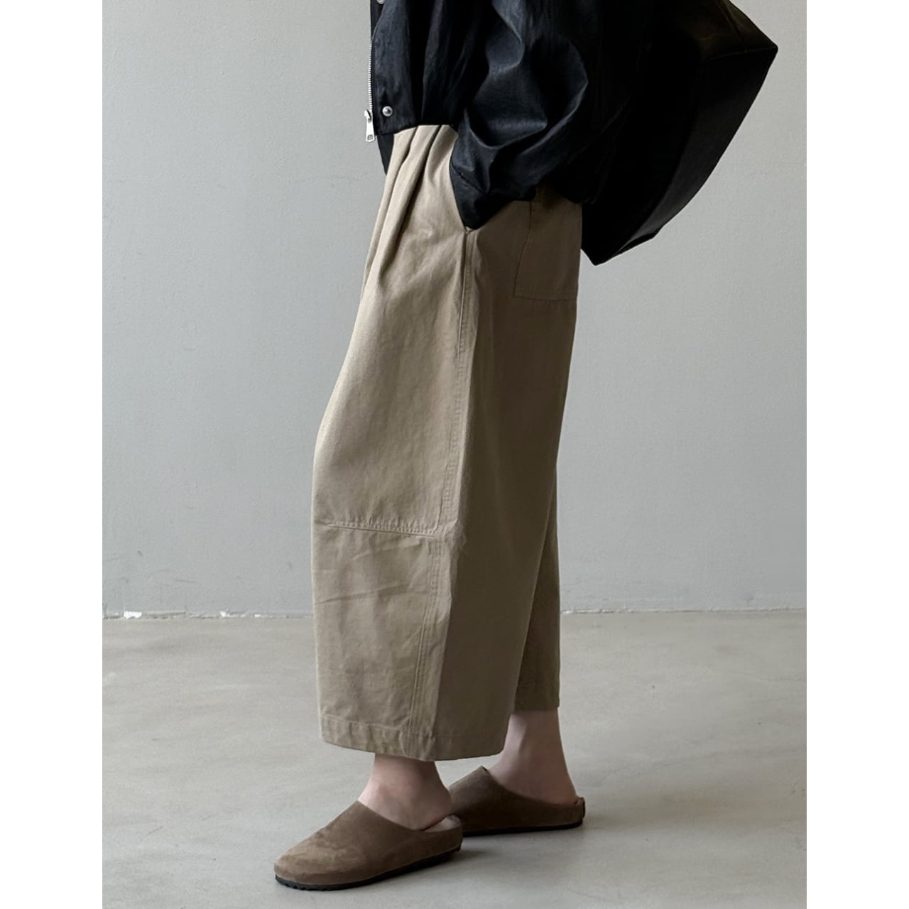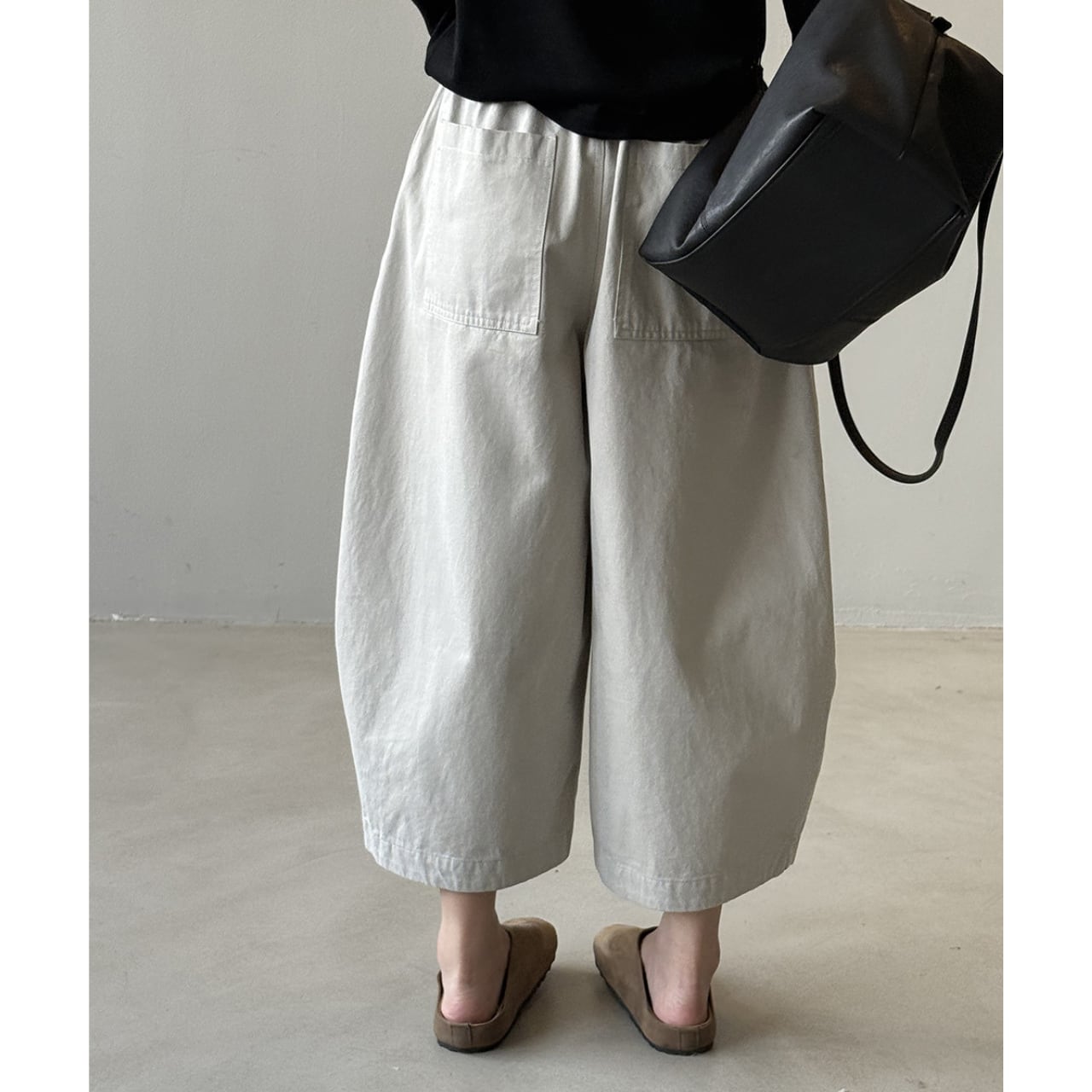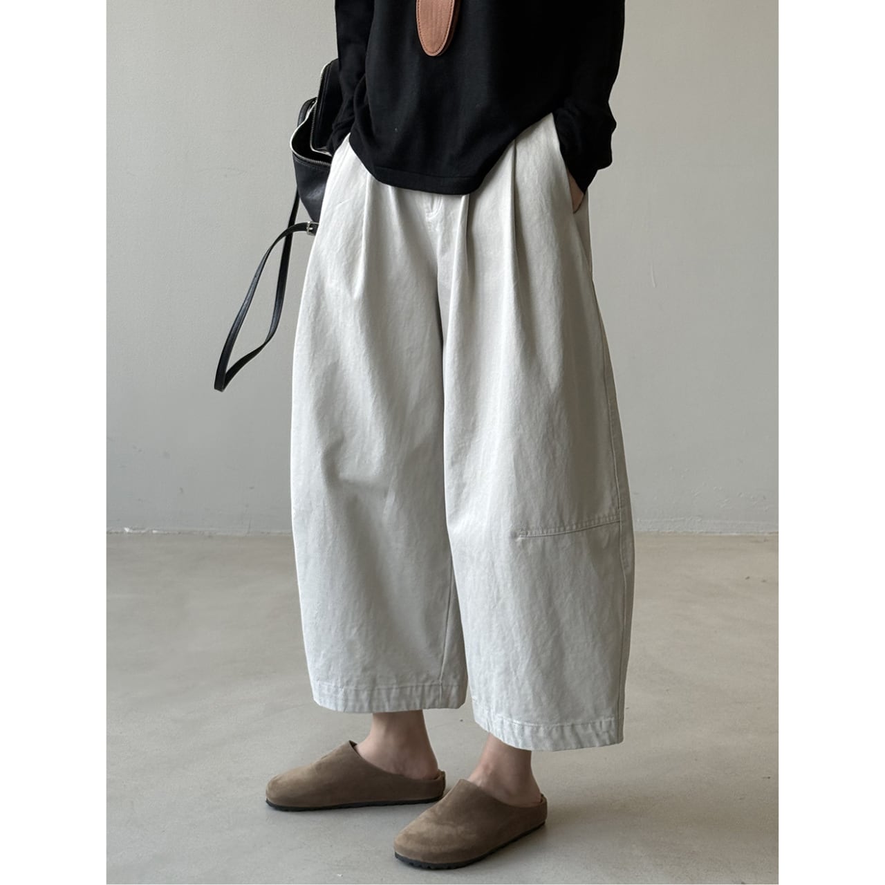 ゆったりとしたデザインで動きやすく、ストレスフリーな着用感のクロップド丈パンツ。トップスを選ばない着回しやすさが魅力で、様々なコーディネートにマッチします。普段使いに最適な、カジュアルで快適な一本です。