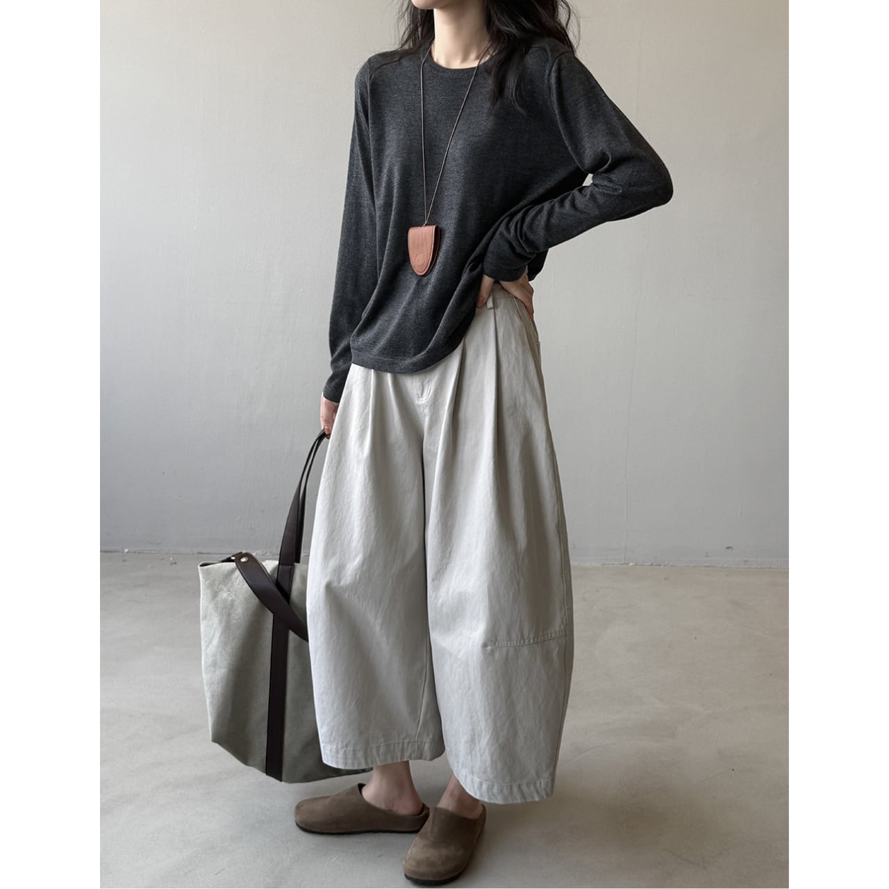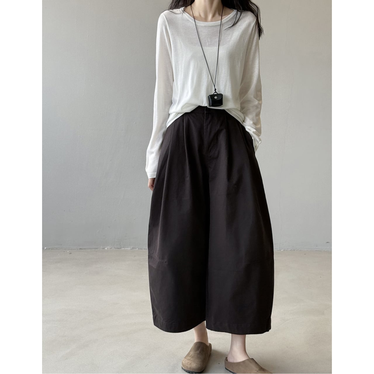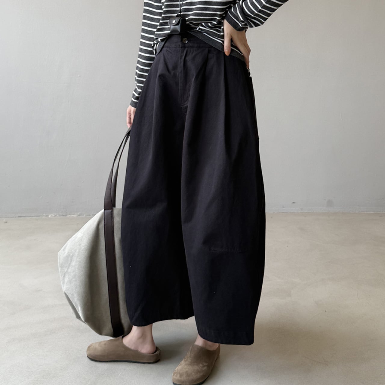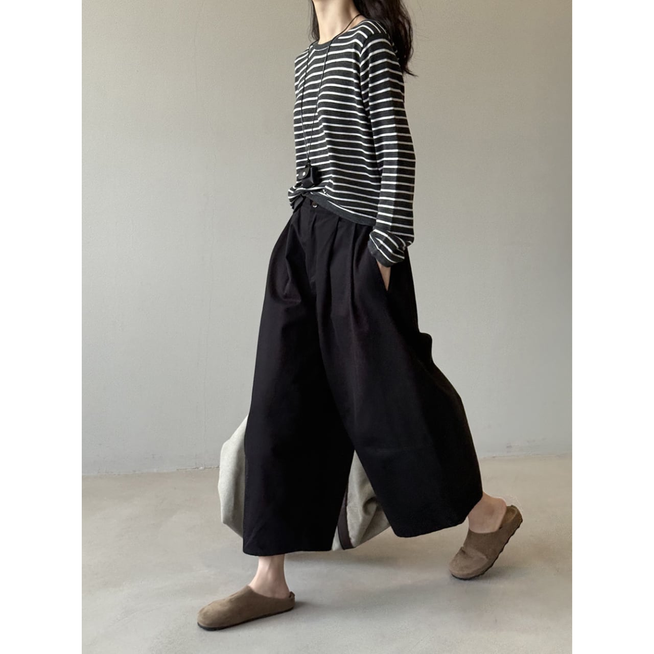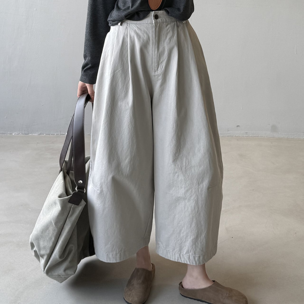 ゆったりとしたデザインで動きやすく、ストレスフリーな着用感のクロップド丈パンツ。トップスを選ばない着回しやすさが魅力で、様々なコーディネートにマッチします。普段使いに最適な、カジュアルで快適な一本です。