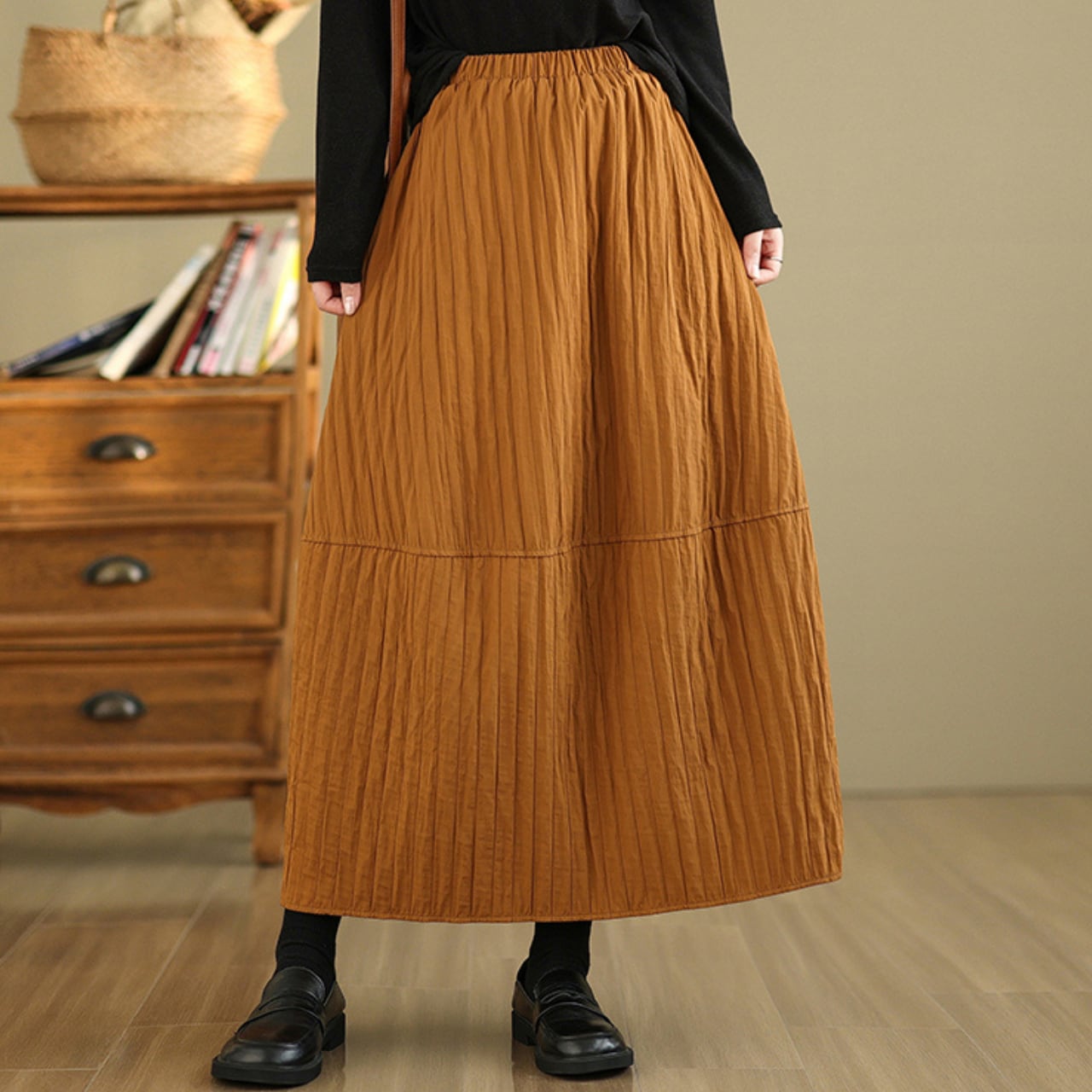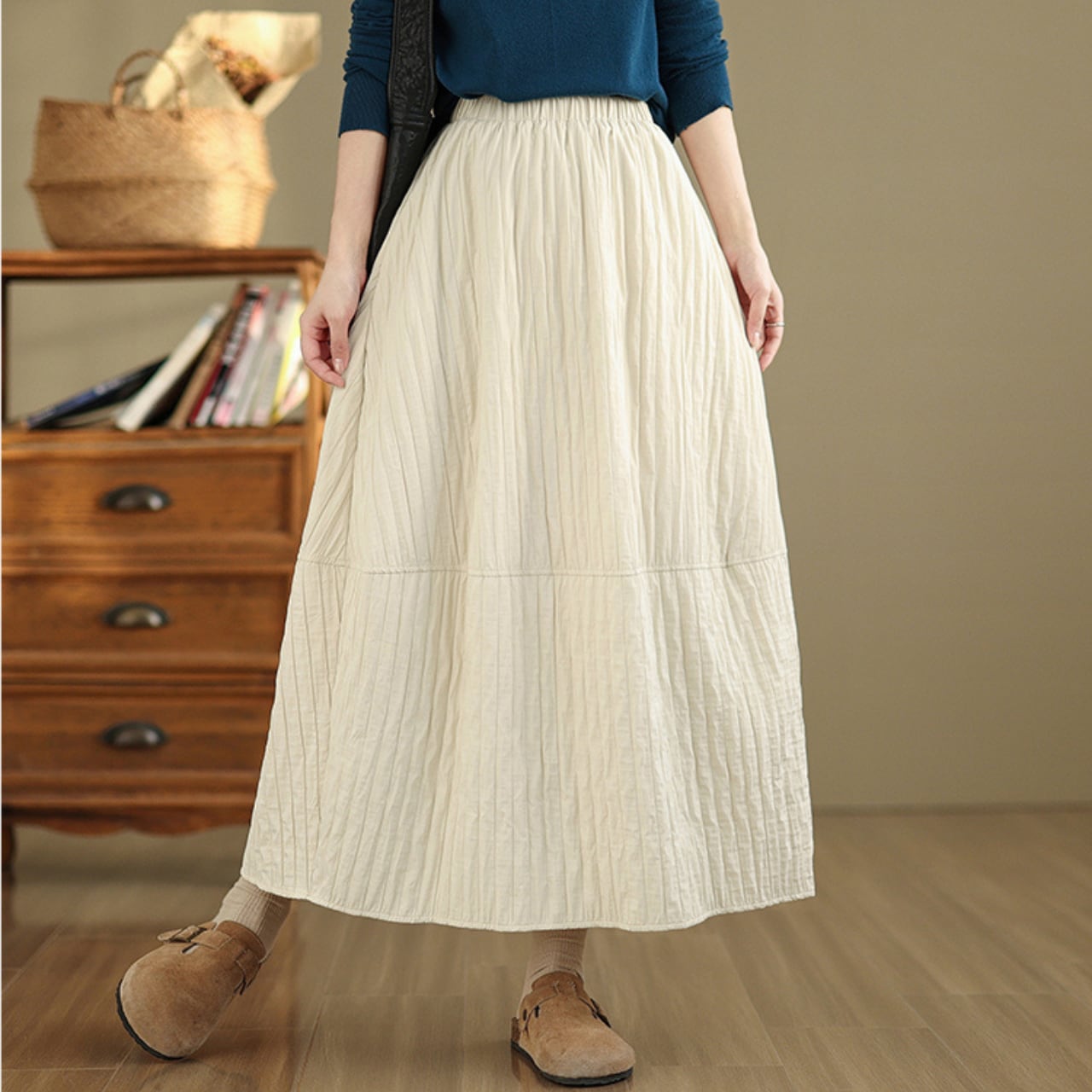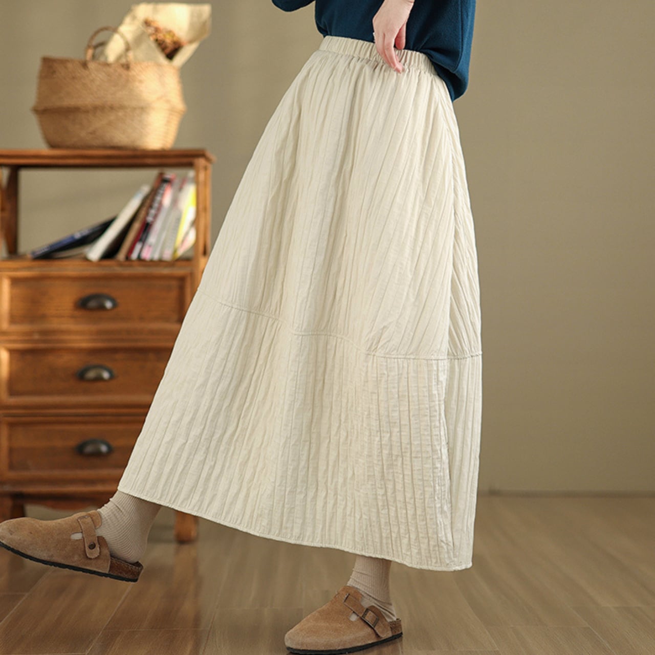 シンプルなトップスと合わせるだけで、こなれた雰囲気に仕上がります。