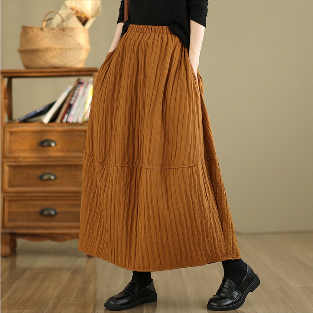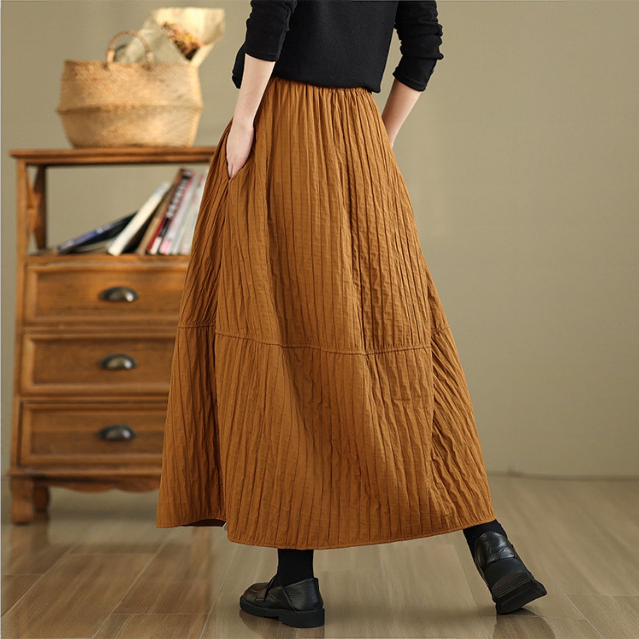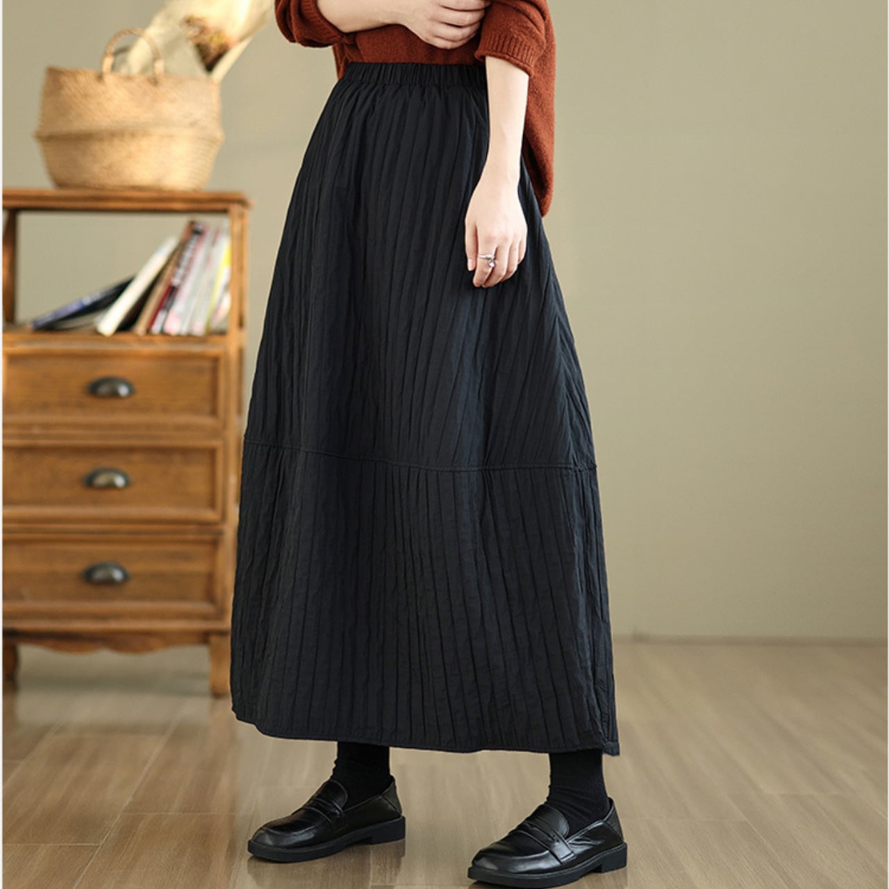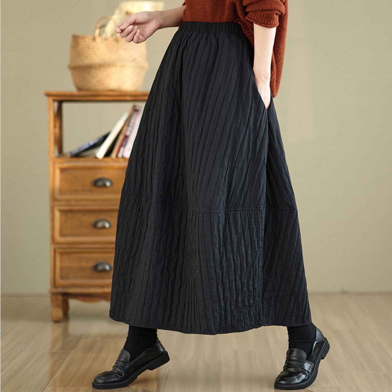 シンプルなトップスと合わせるだけで、こなれた雰囲気に仕上がります。