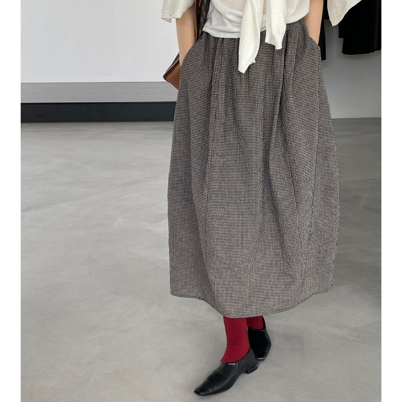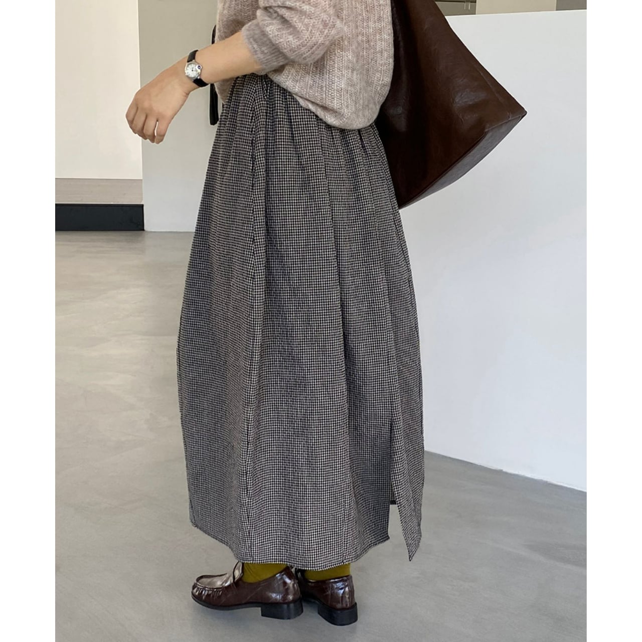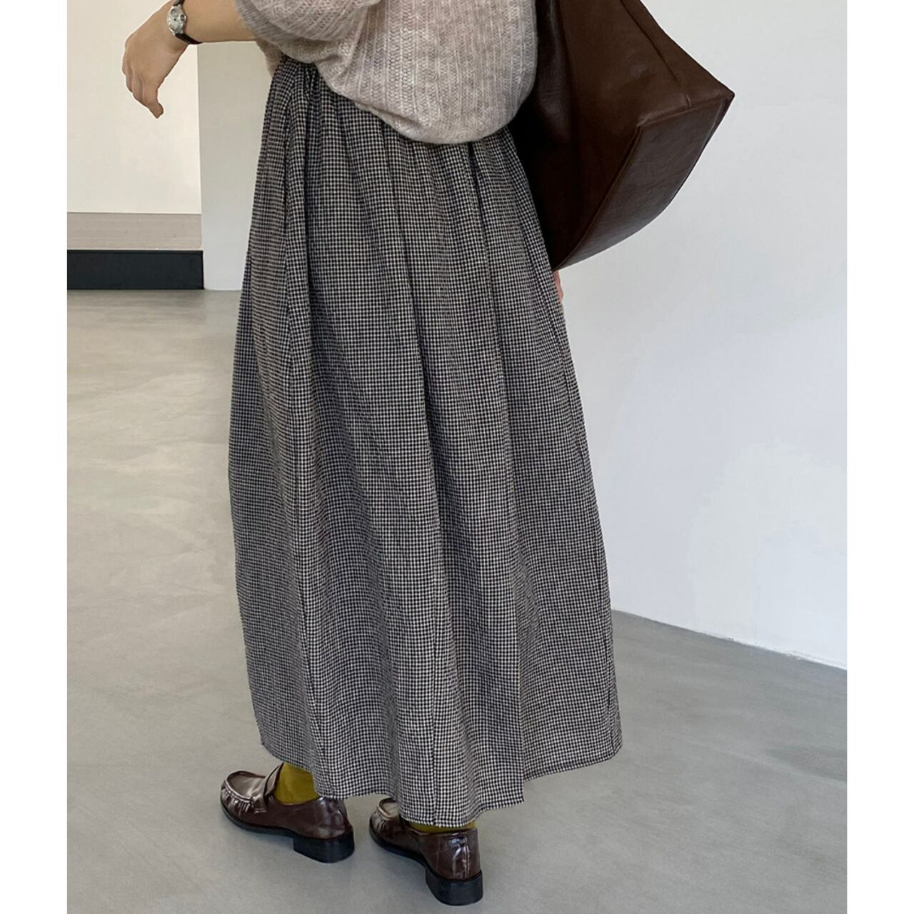 上品な丈感と、歩くたびに揺れるシルエットが女性らしさを演出するスカート。