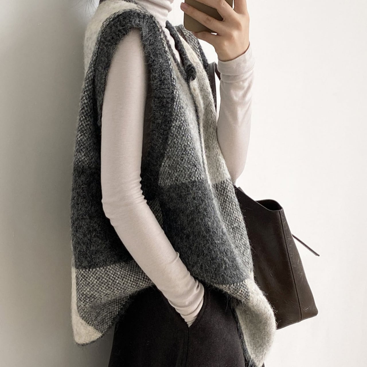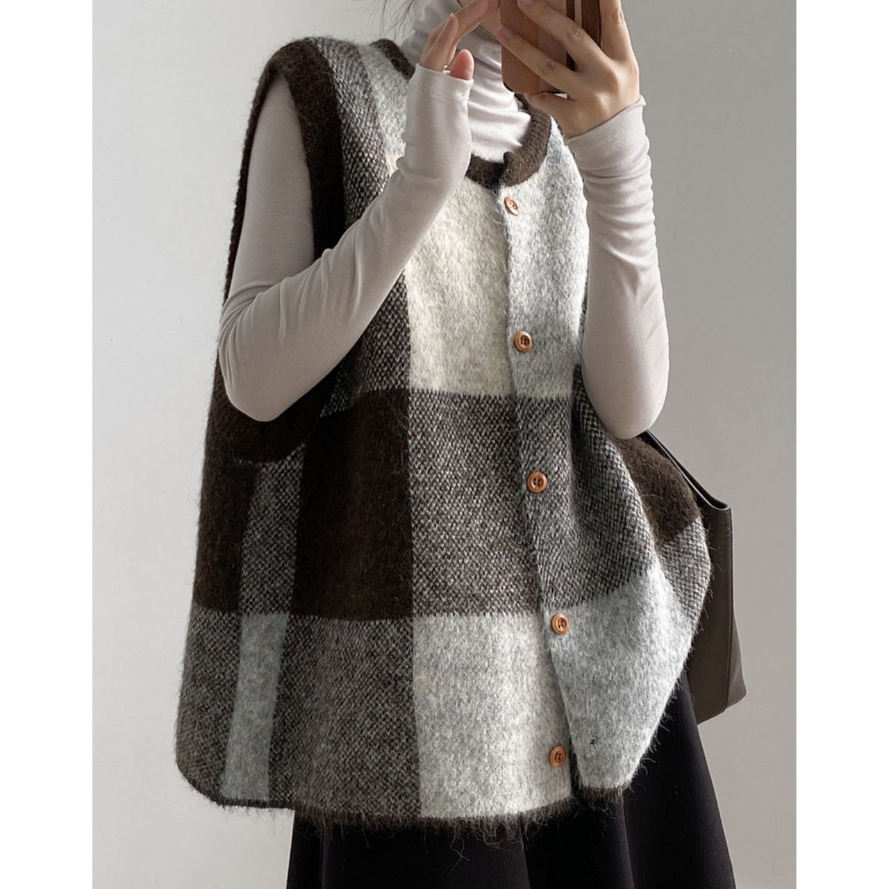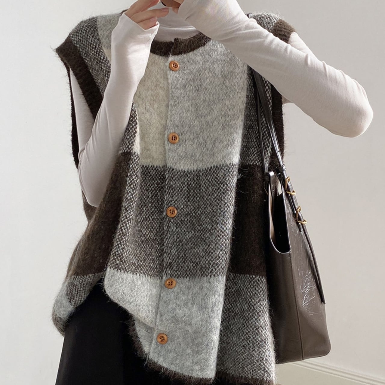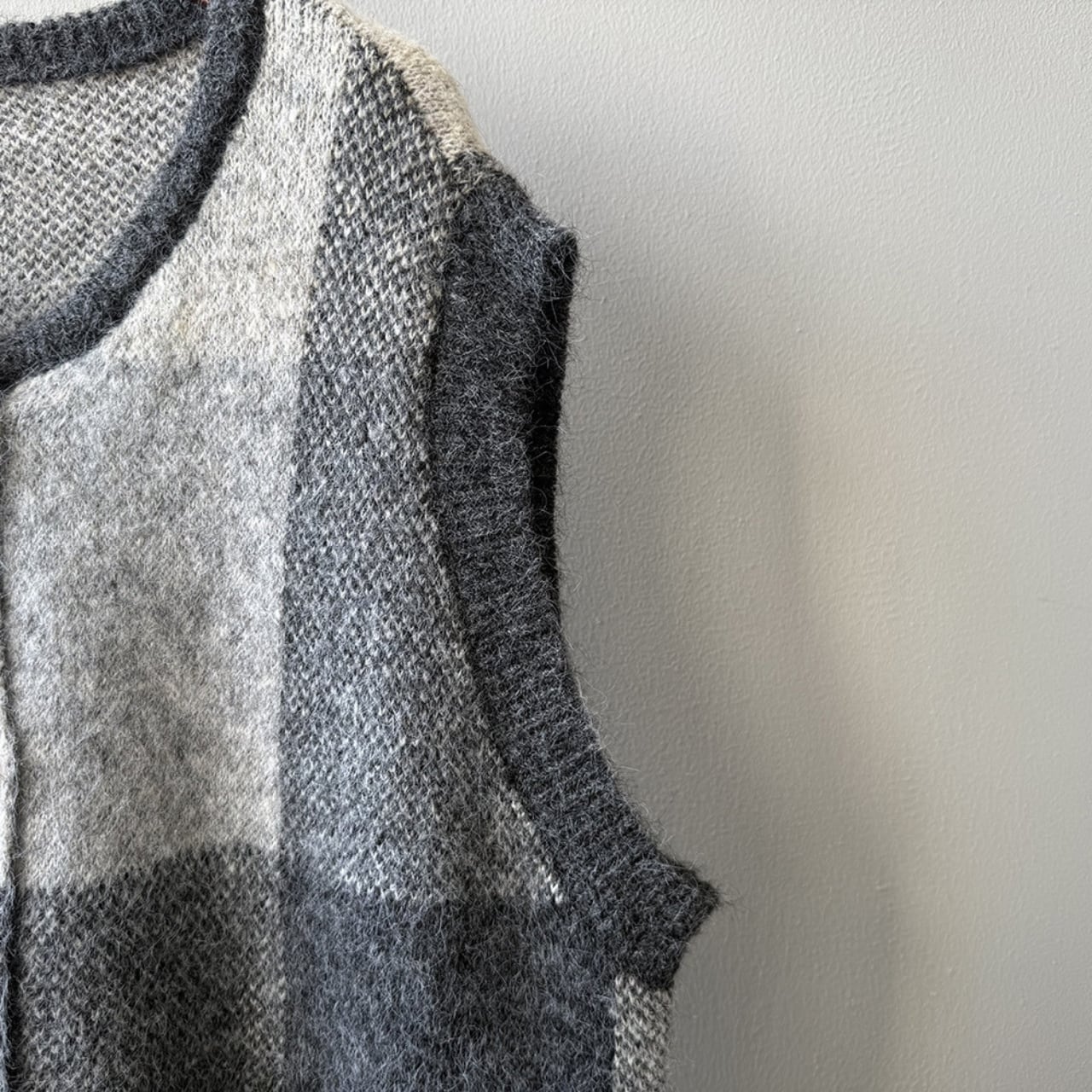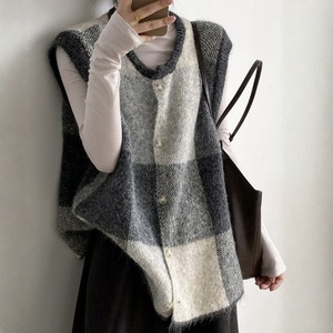 チェック柄が目を引く、ノースリーブニットベスト。