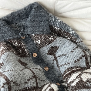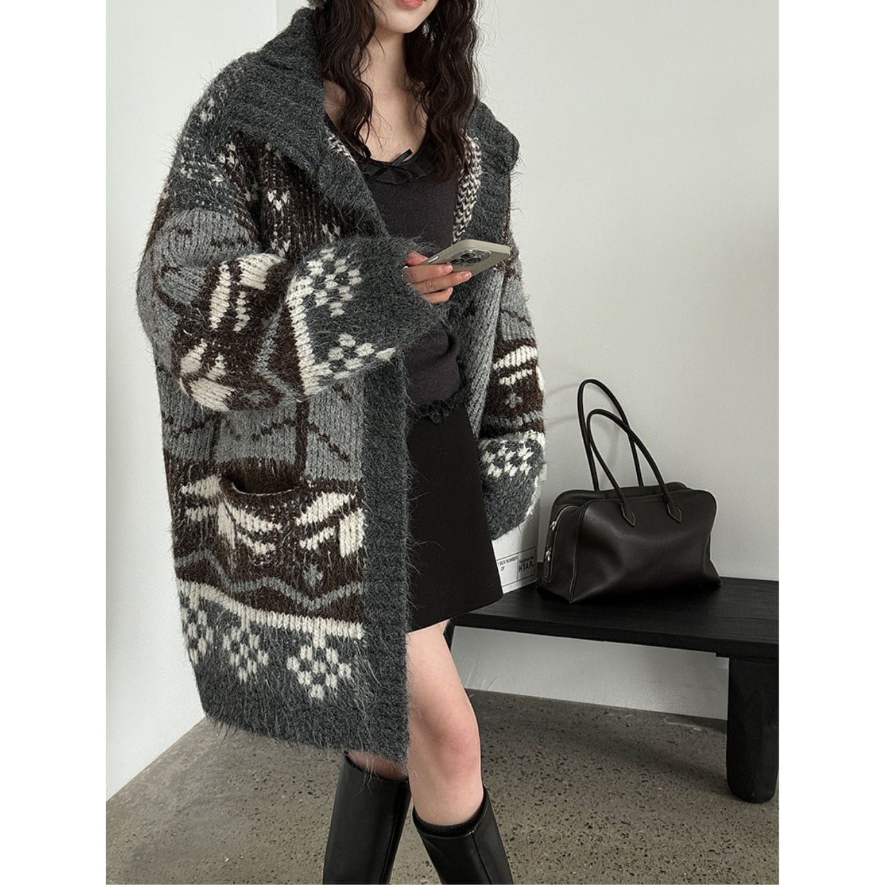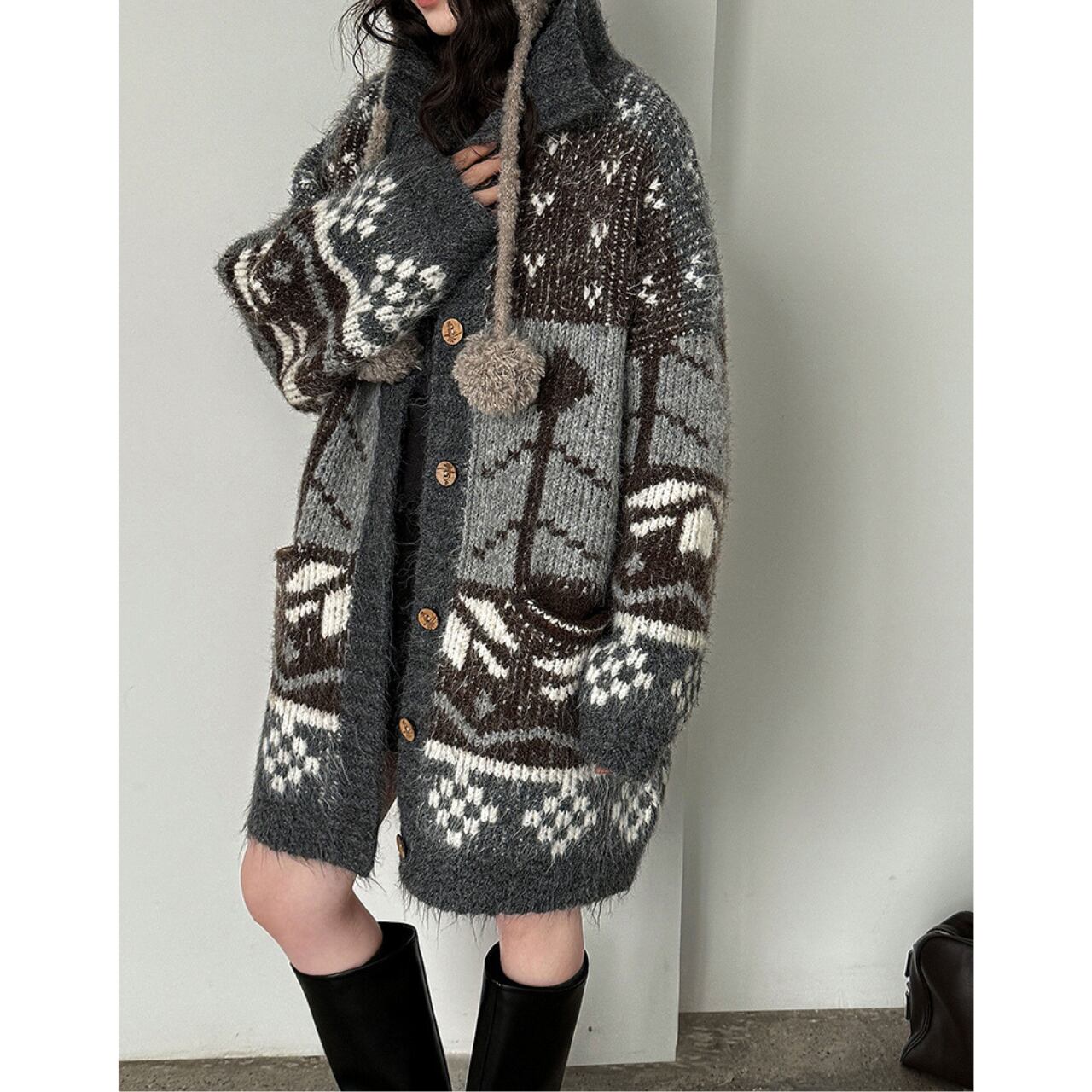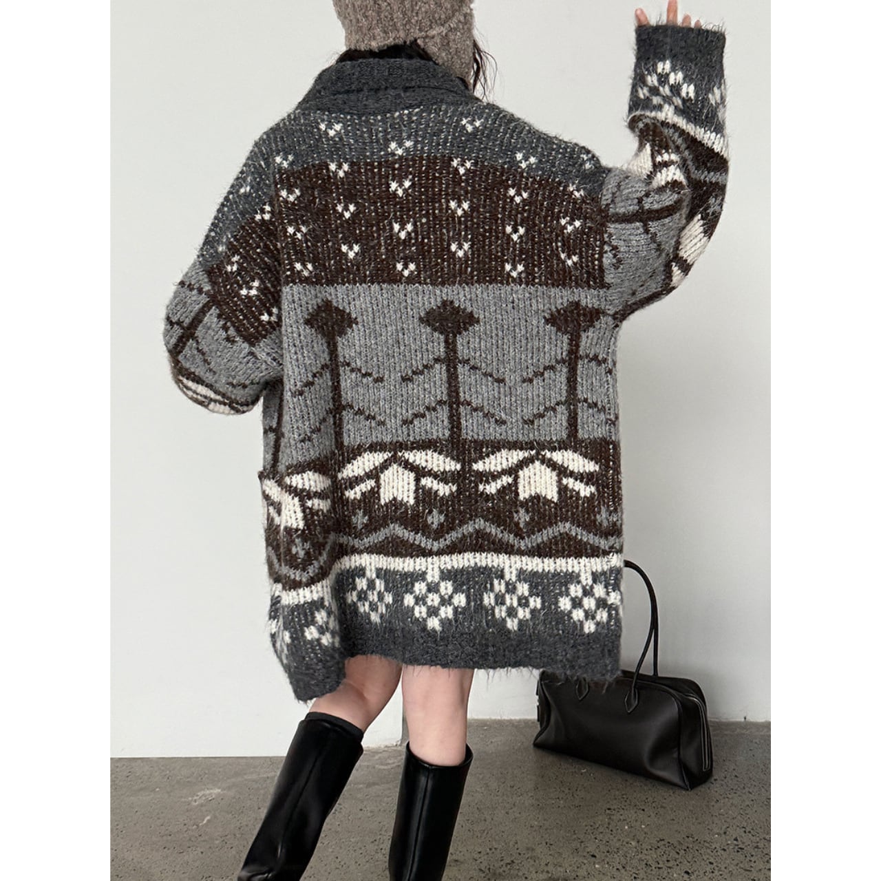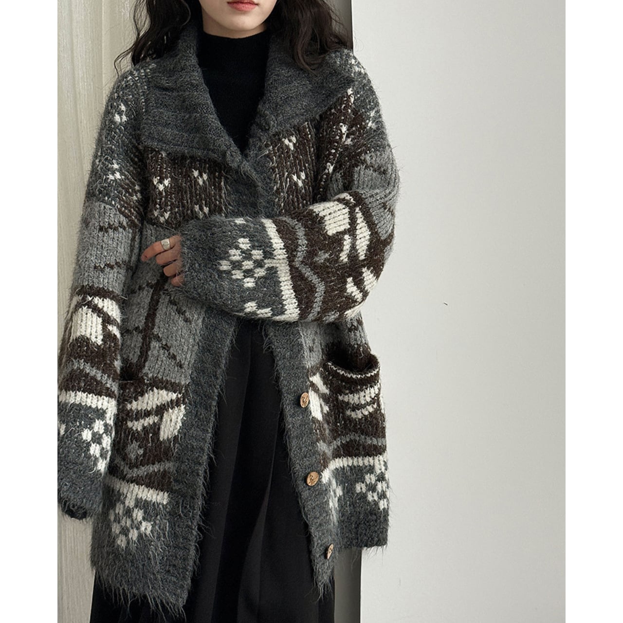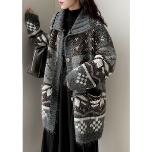 パッチポケットがアクセントになった、ロング丈のニットカーディガンです。
