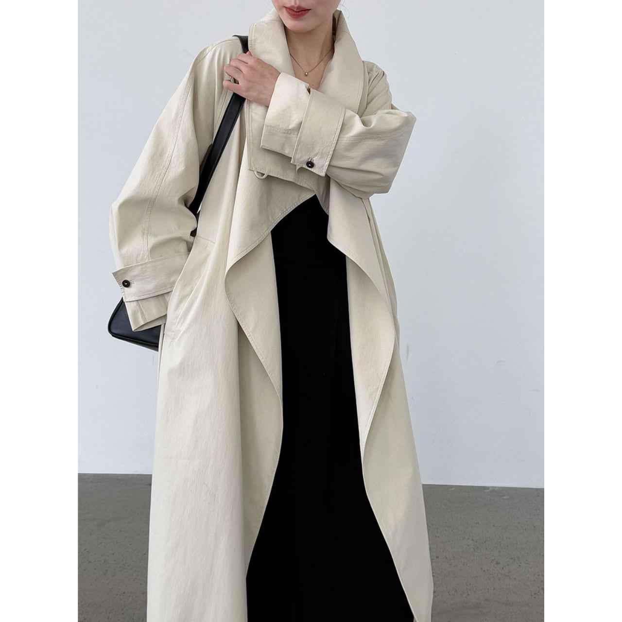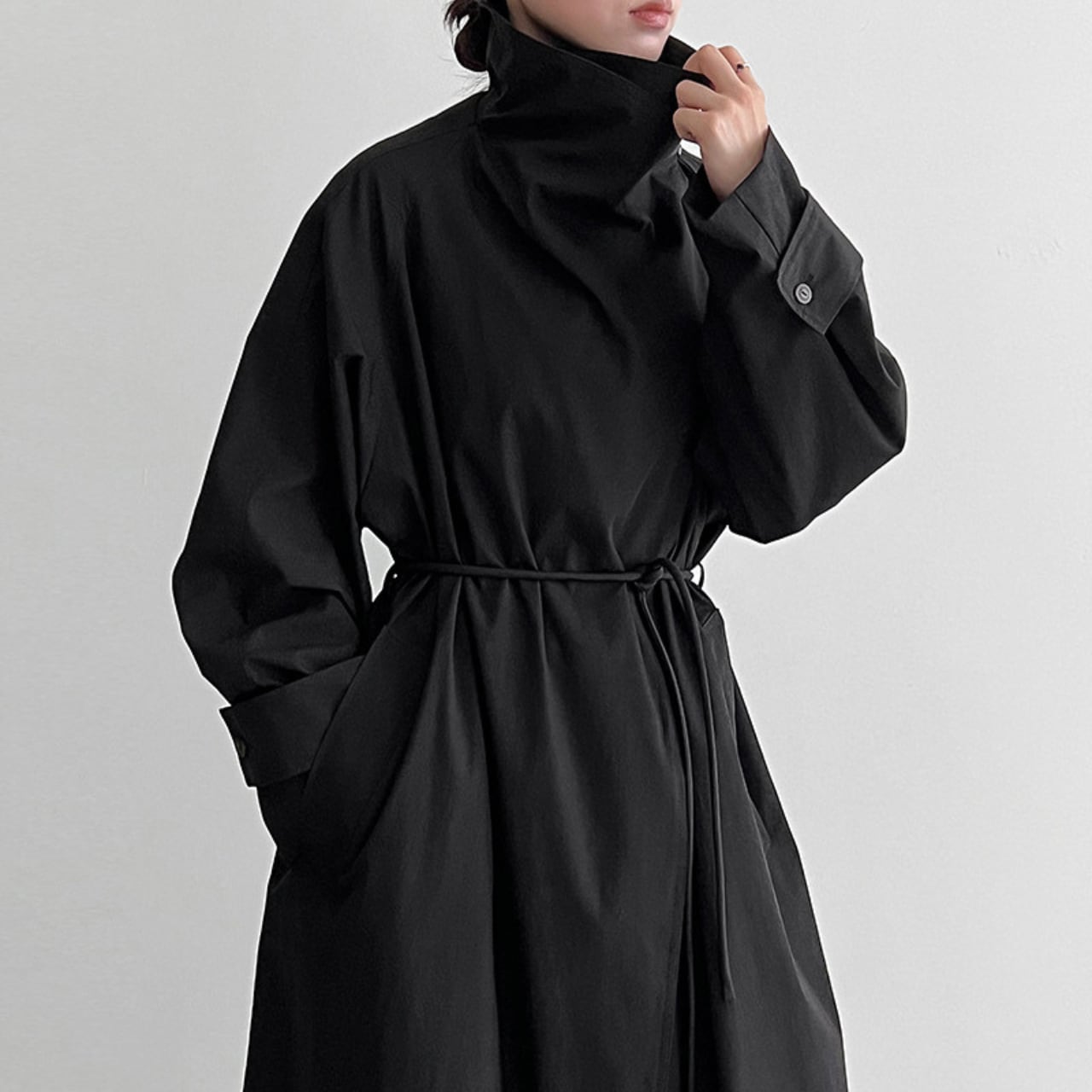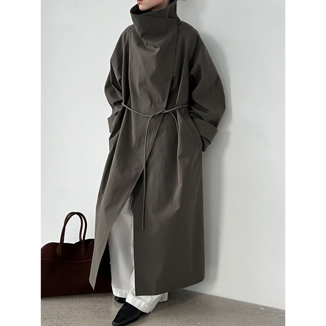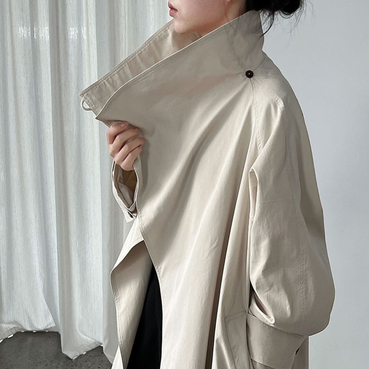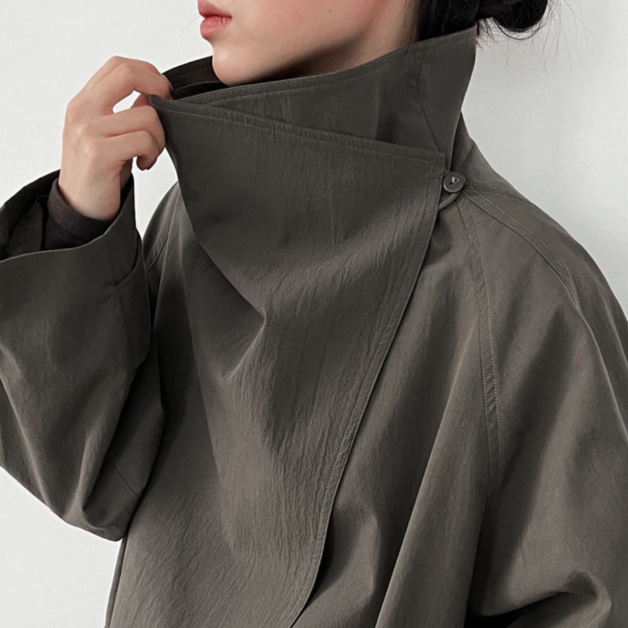 シンプルなデザインの中に、スタンドカラーがアクセントを加えるコート。