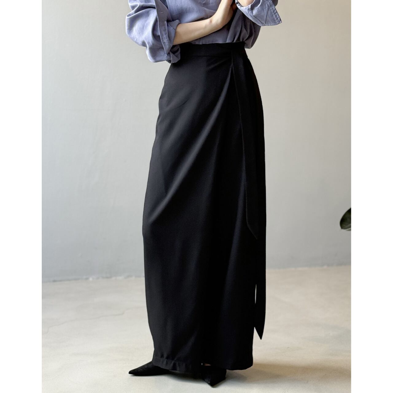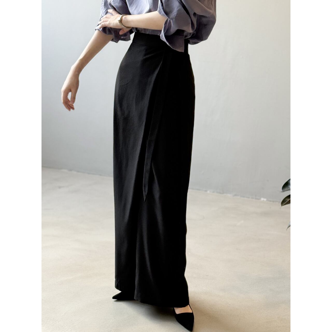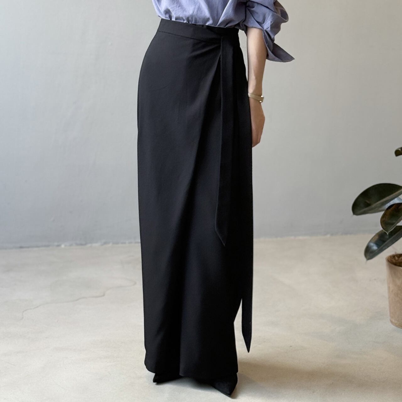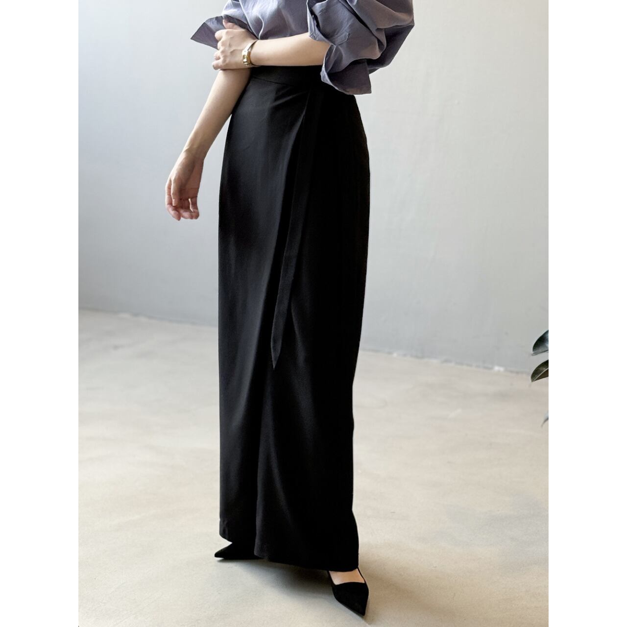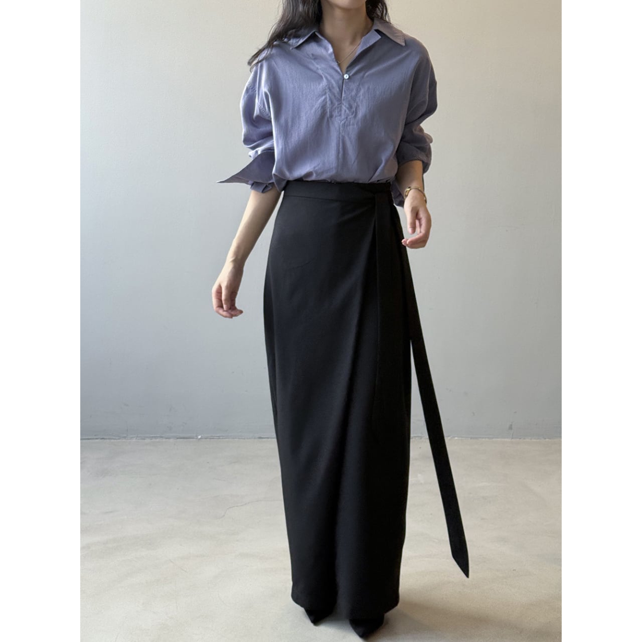 フルレングスで上品な印象を与えつつ、ゆったりとしたシルエットで動きやすさも確保。