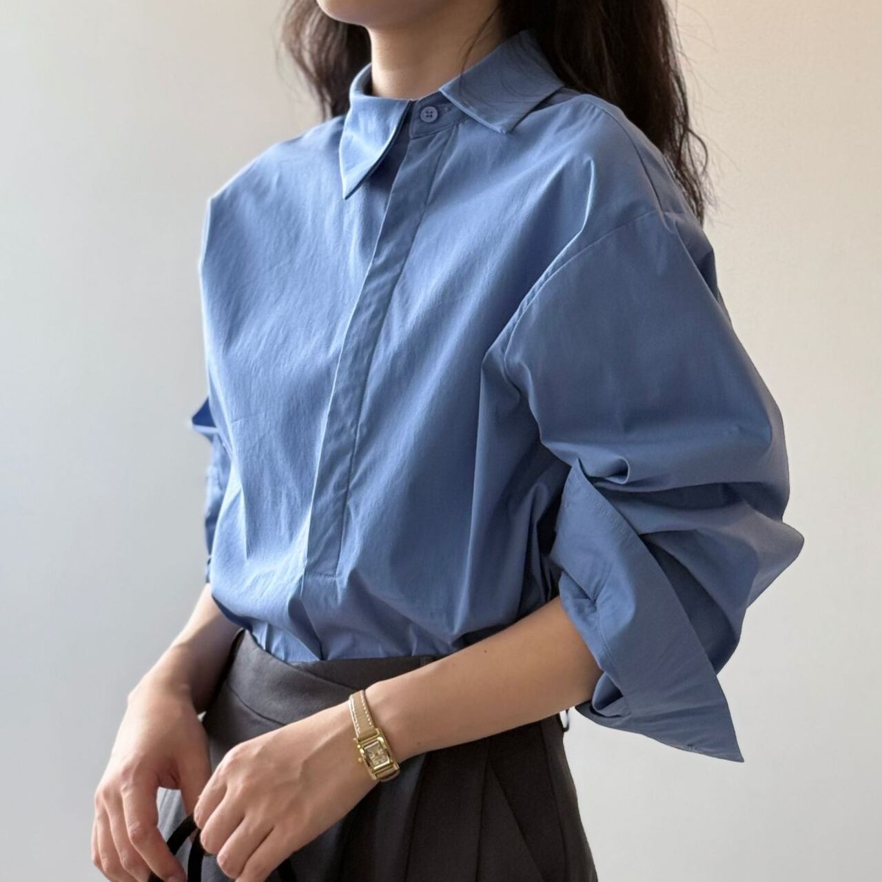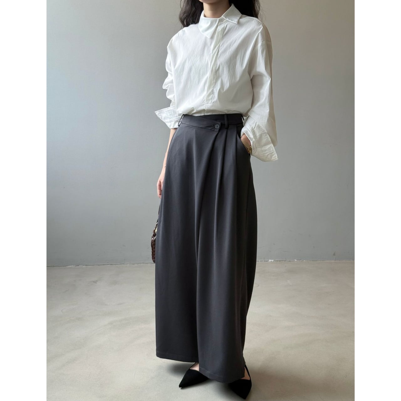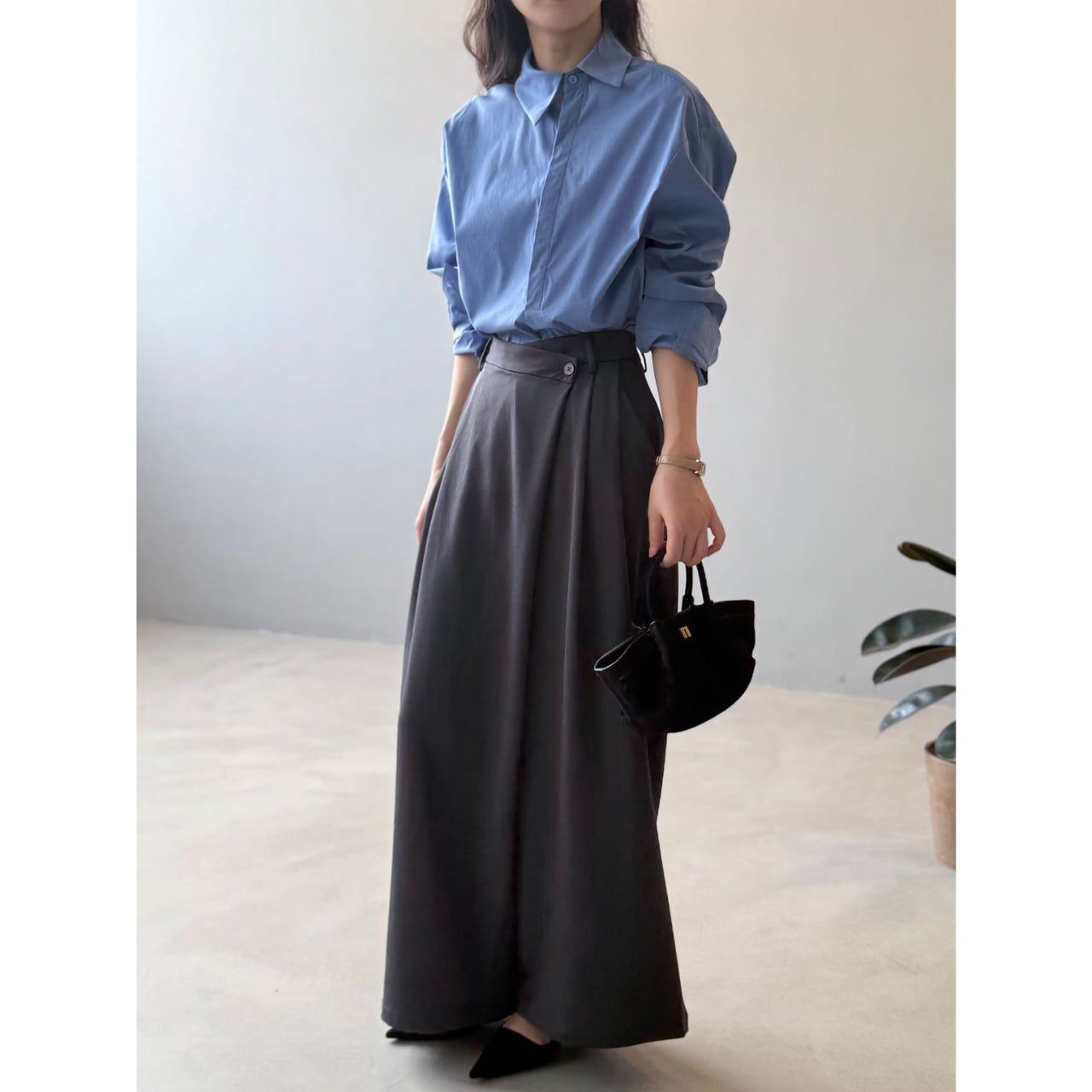 フロントボタンとアシンメトリーデザインが、着こなしにアクセントを加えます。