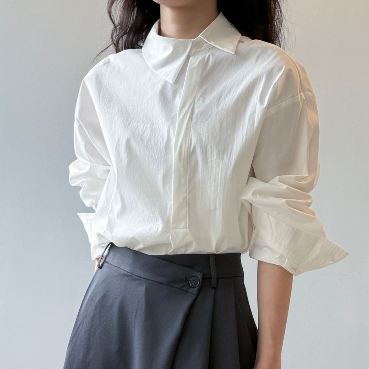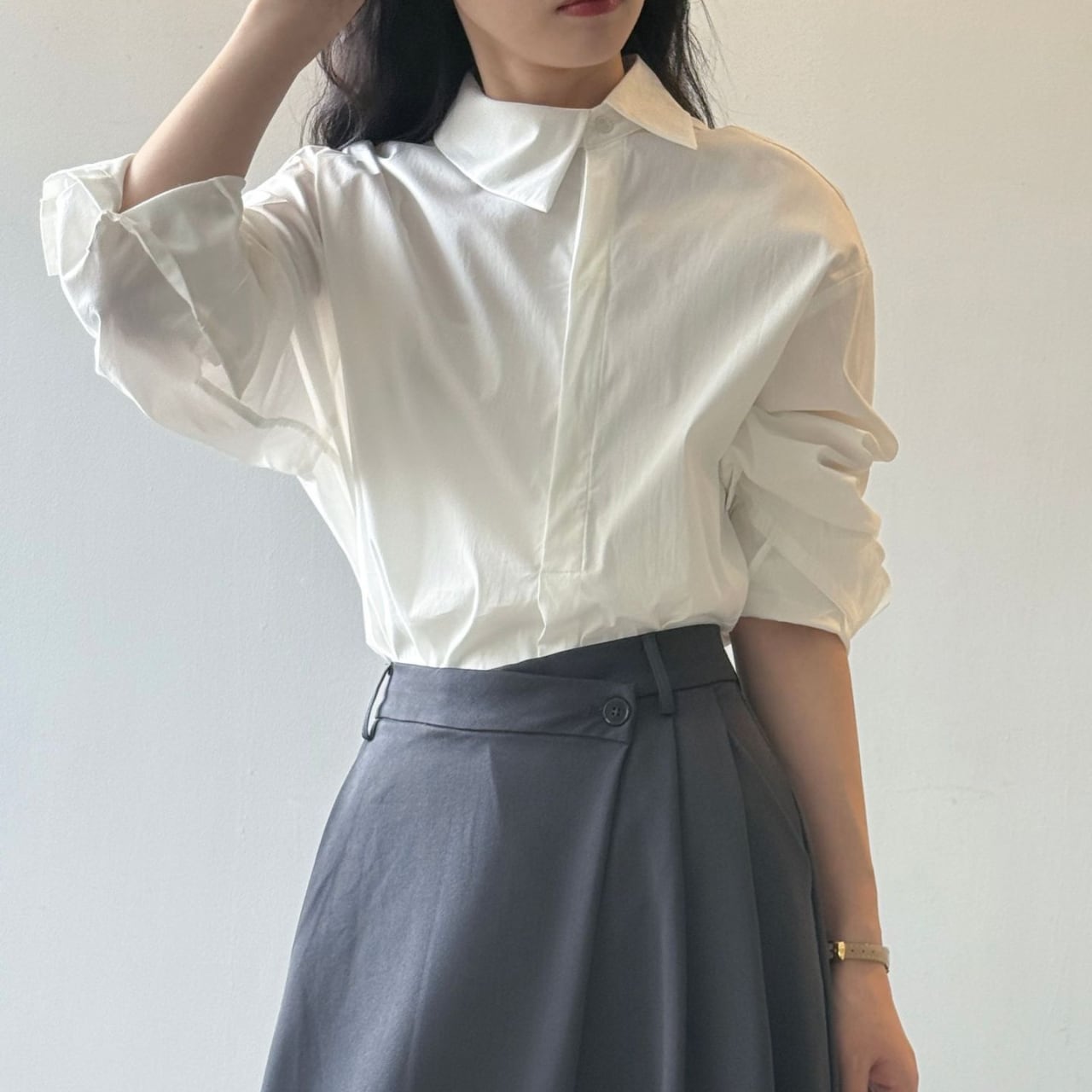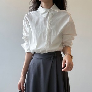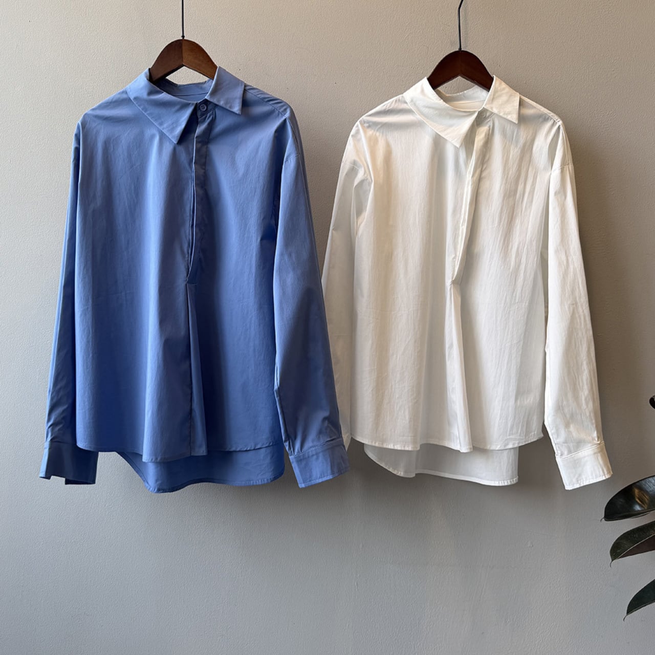 フロントボタンとアシンメトリーデザインが、着こなしにアクセントを加えます。