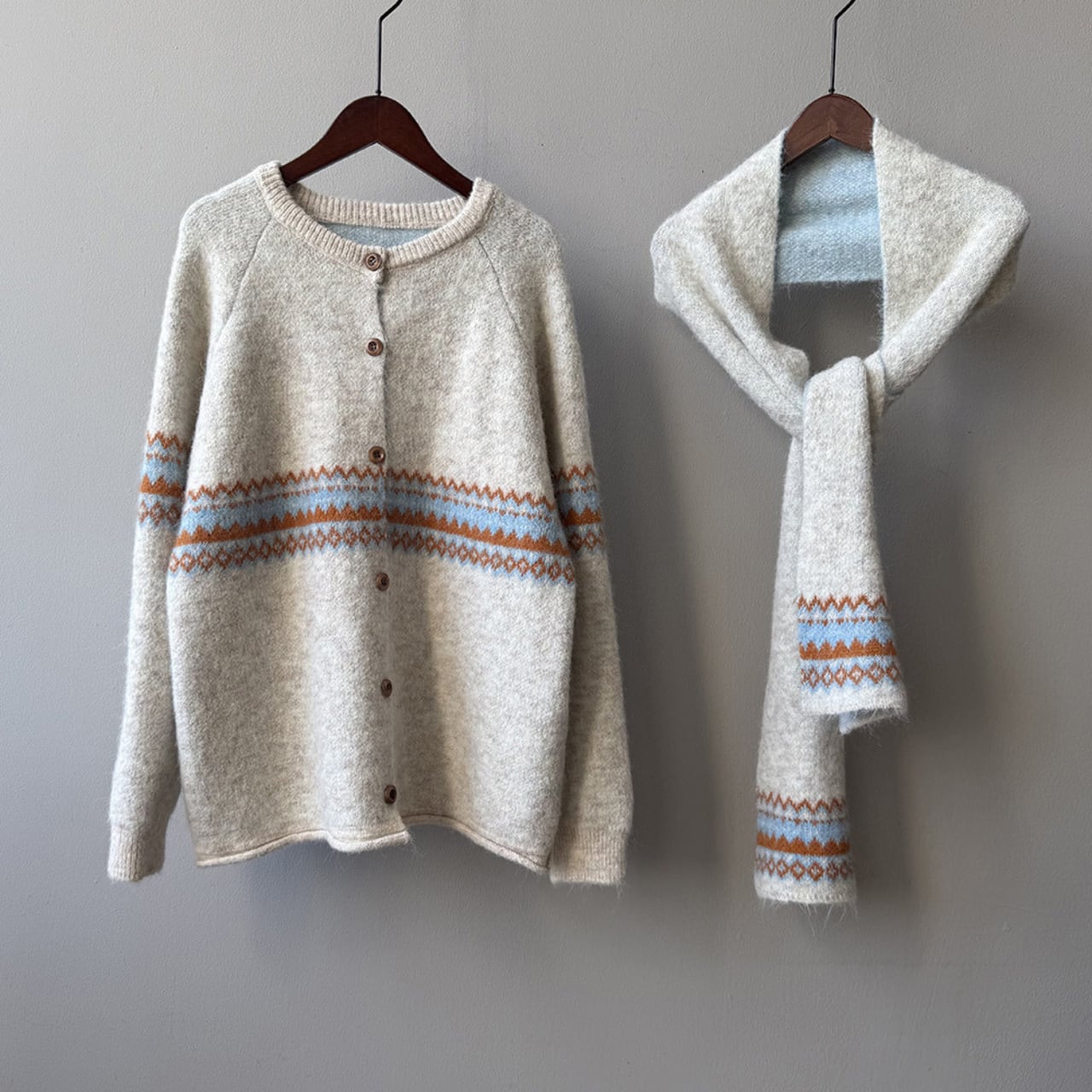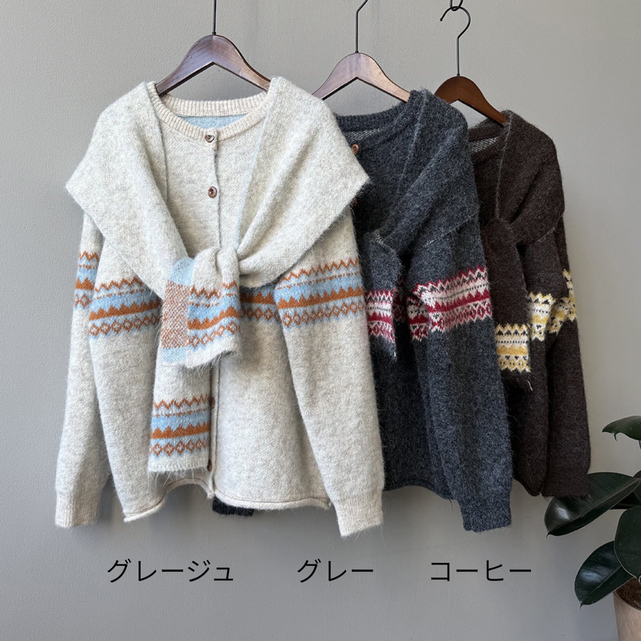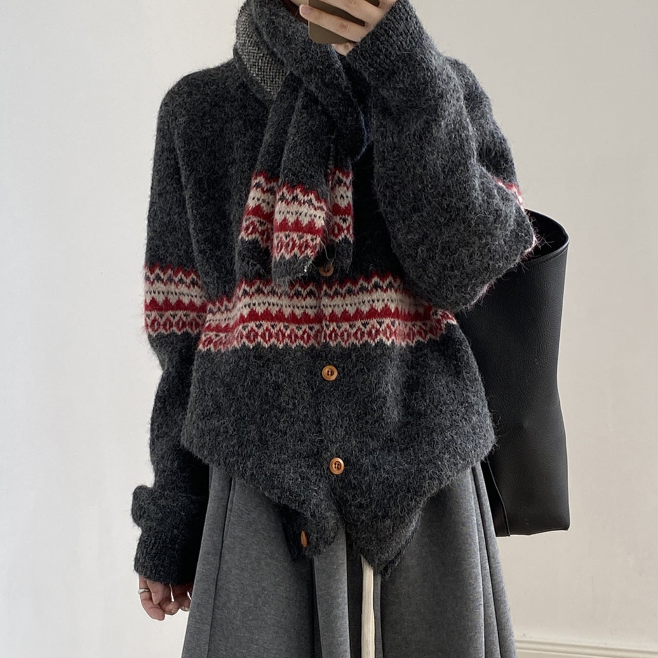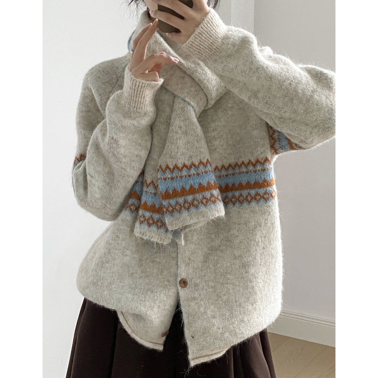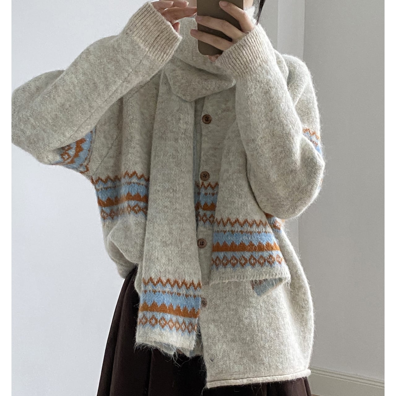 おそろいの柄入りマフラーがセットのニットカーディガン。