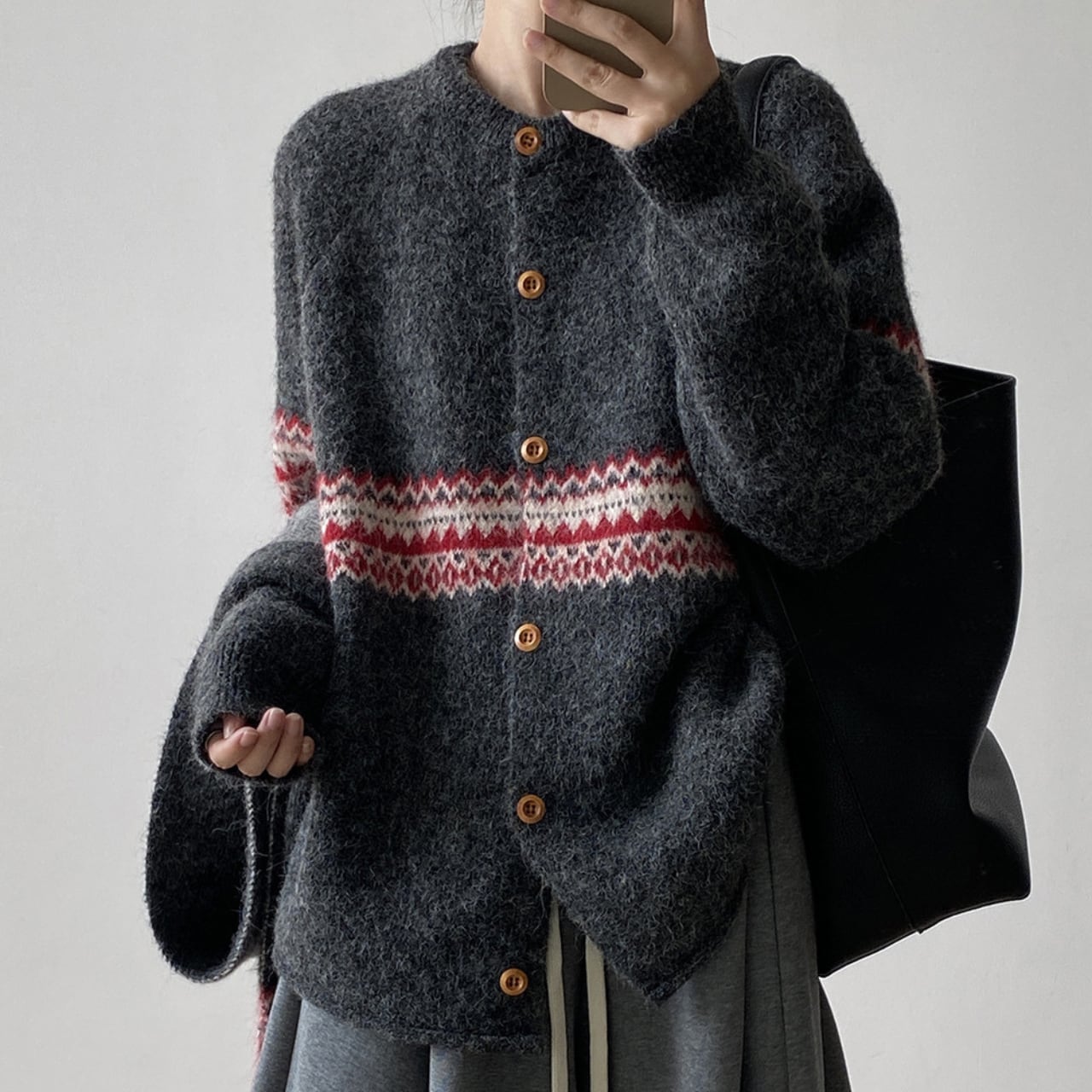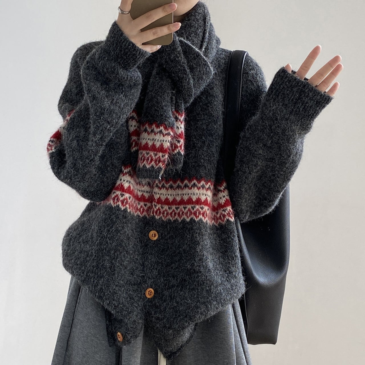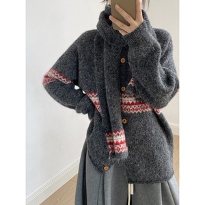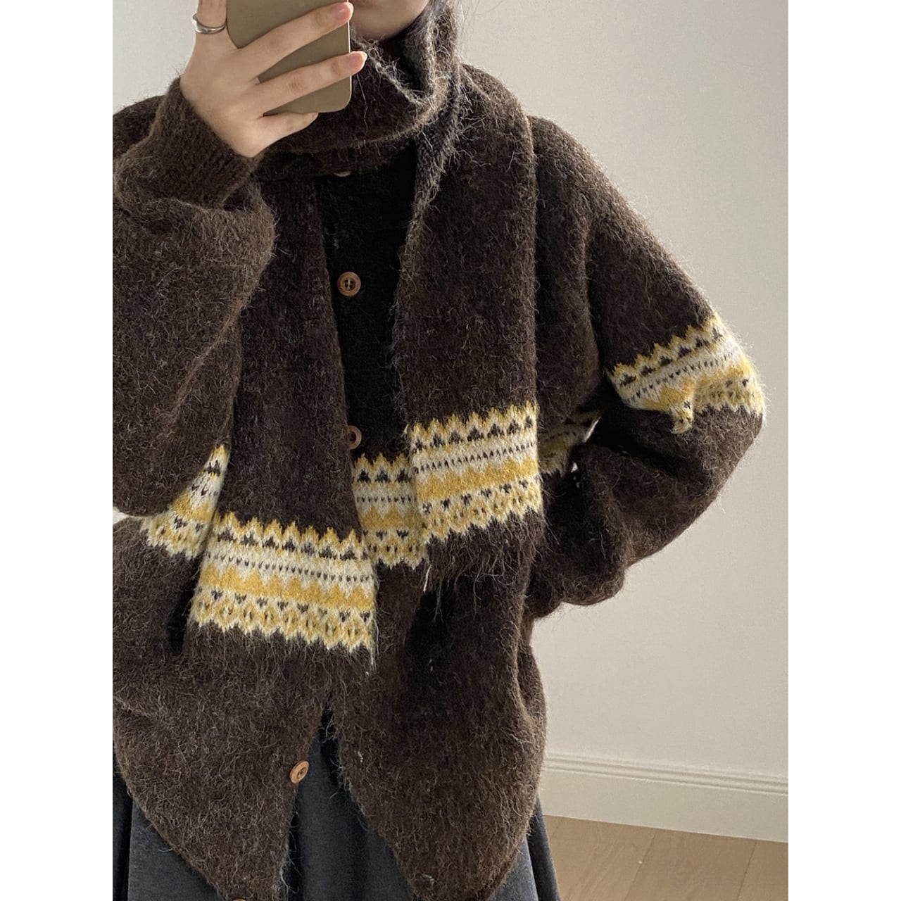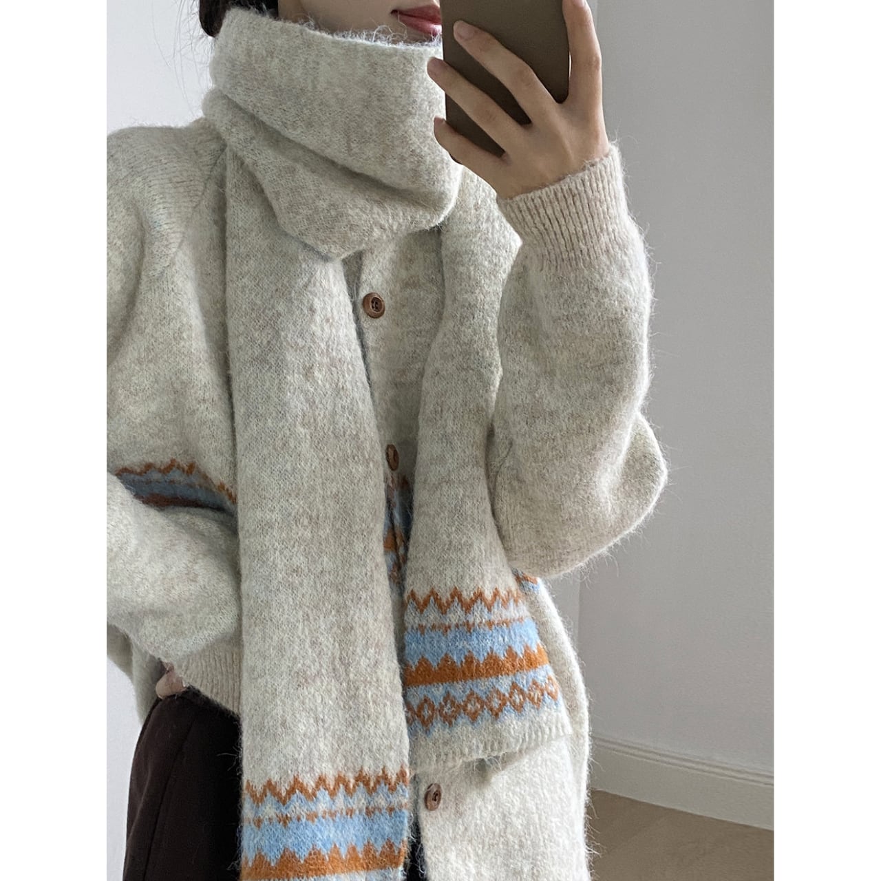 おそろいの柄入りマフラーがセットのニットカーディガン。