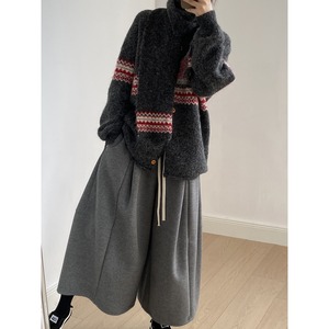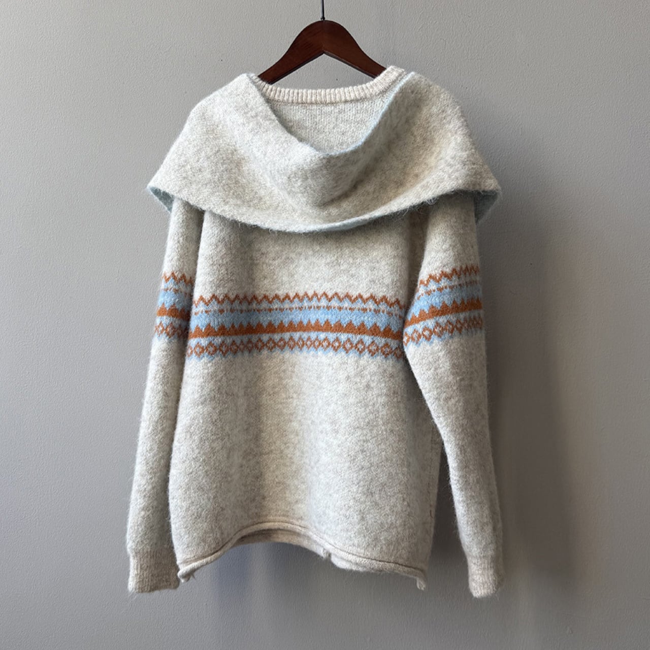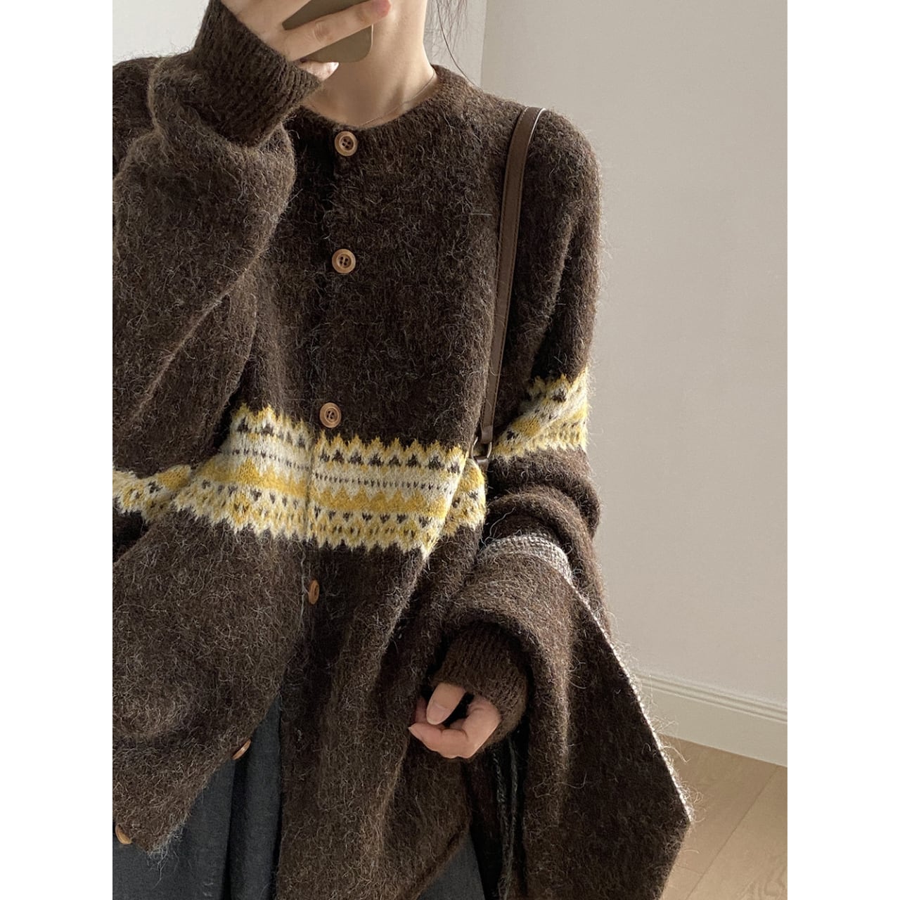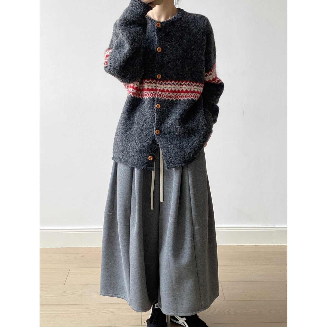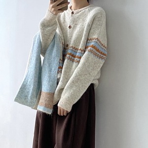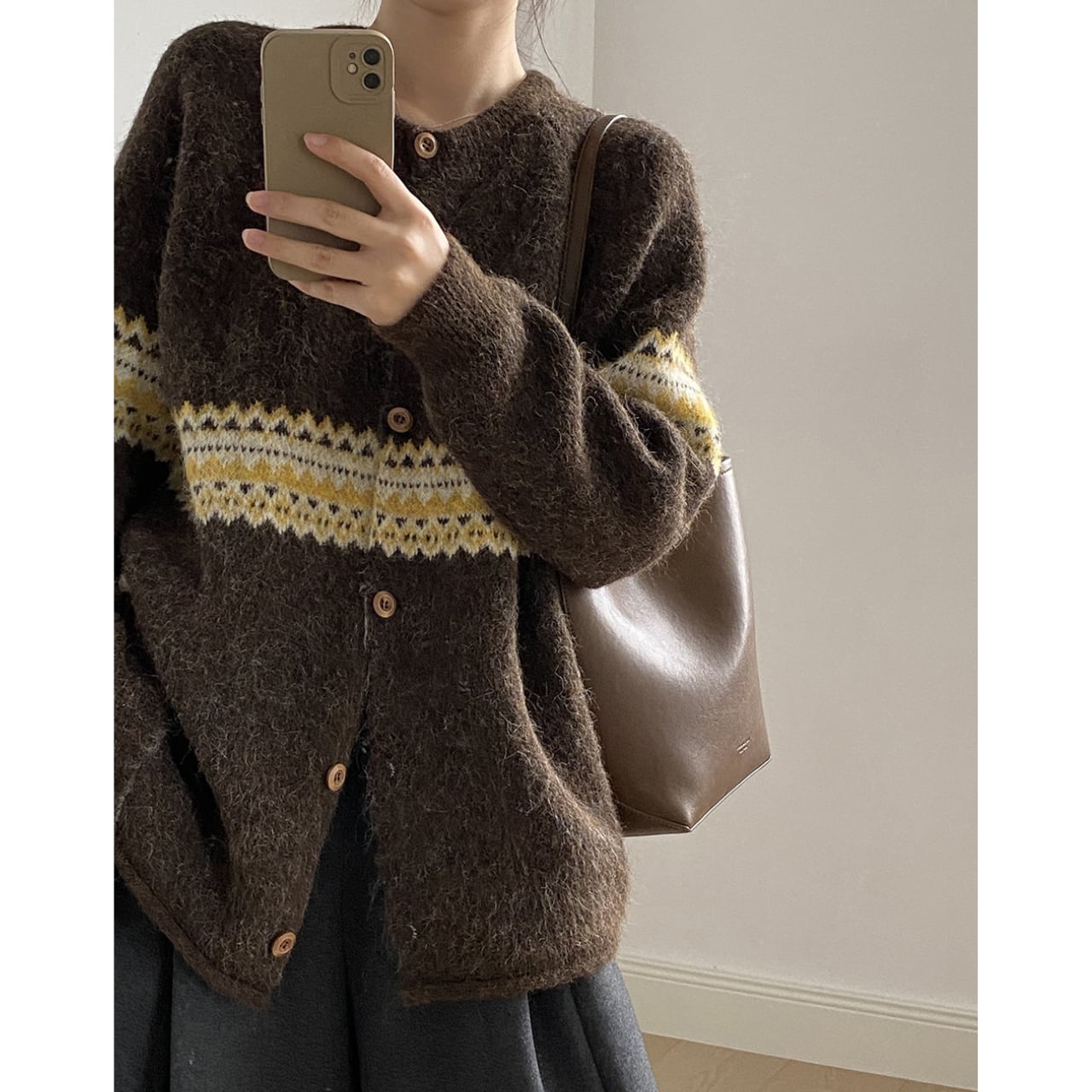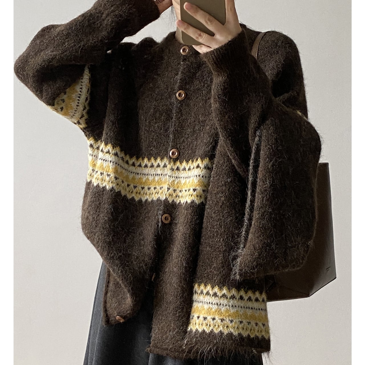 おそろいの柄入りマフラーがセットのニットカーディガン。