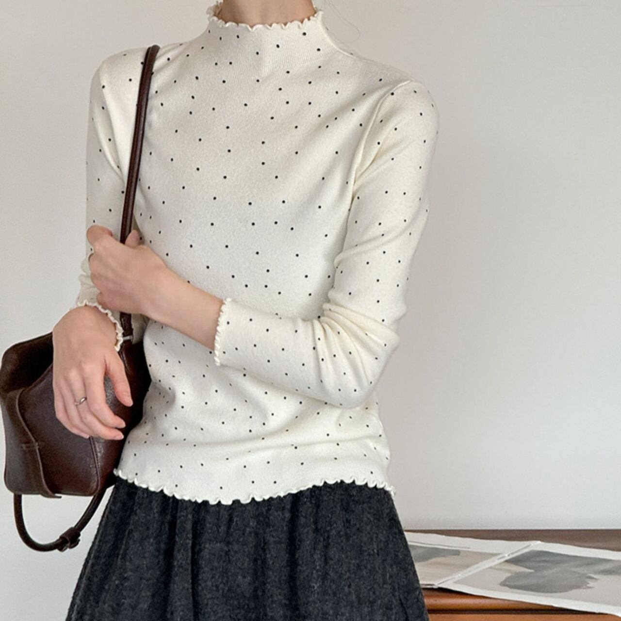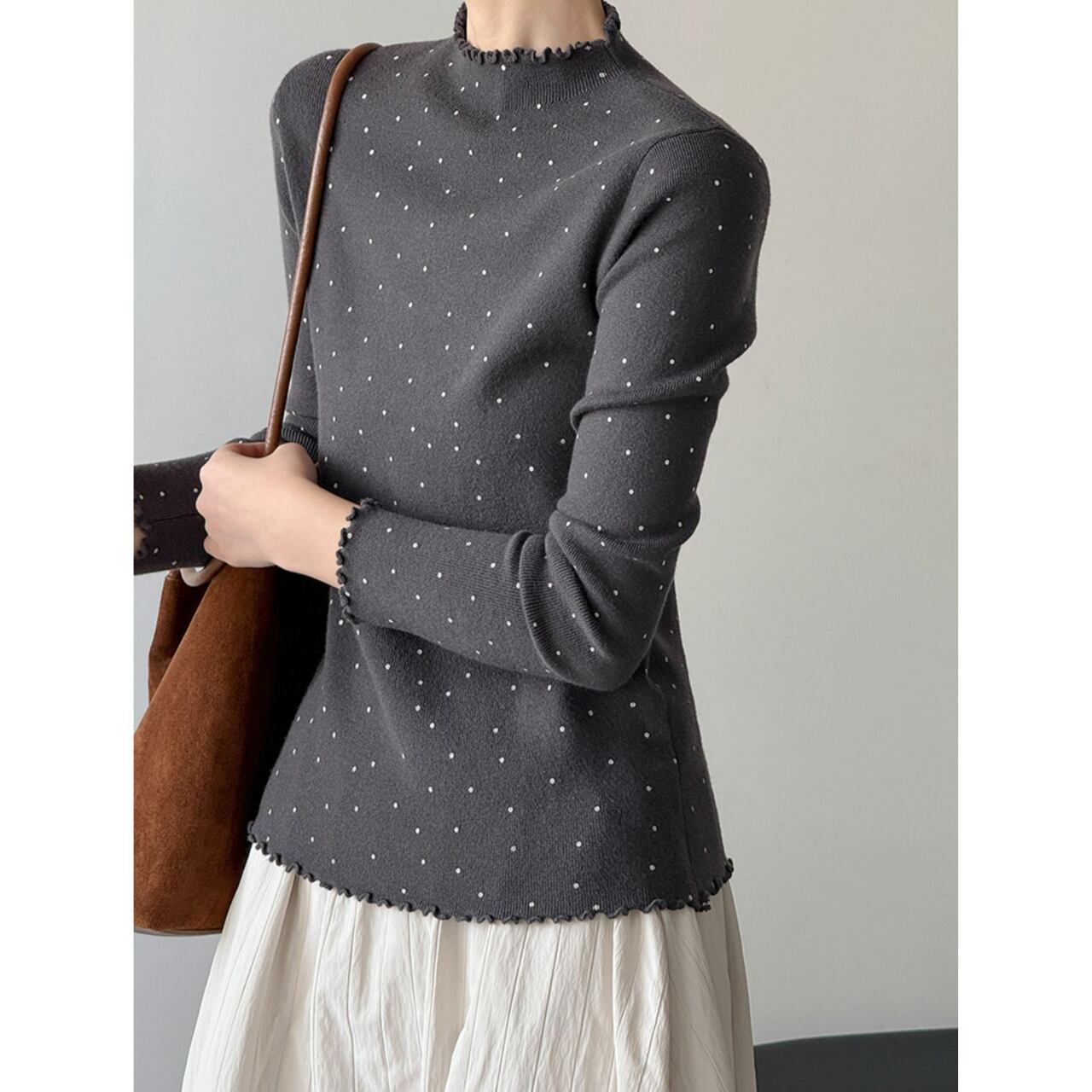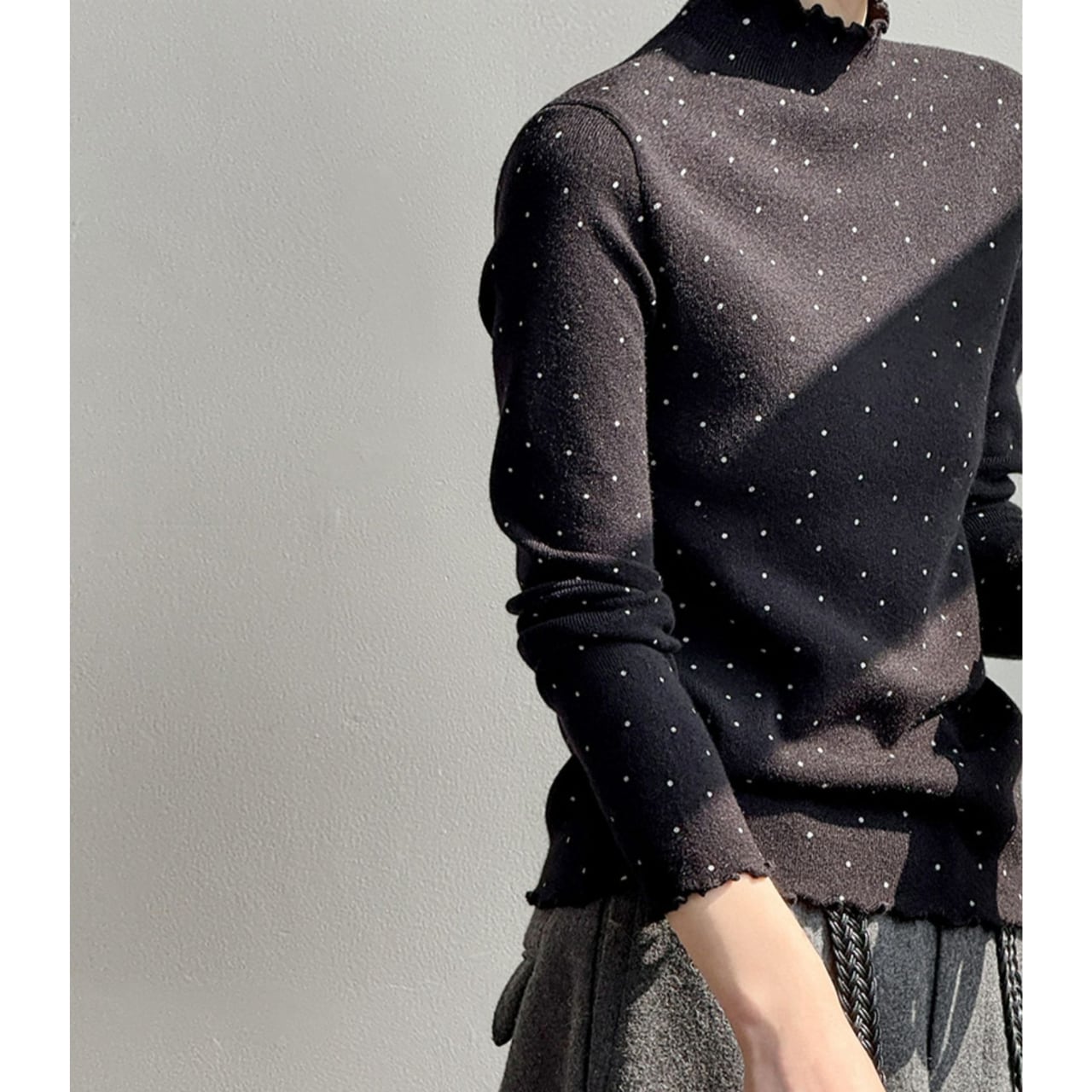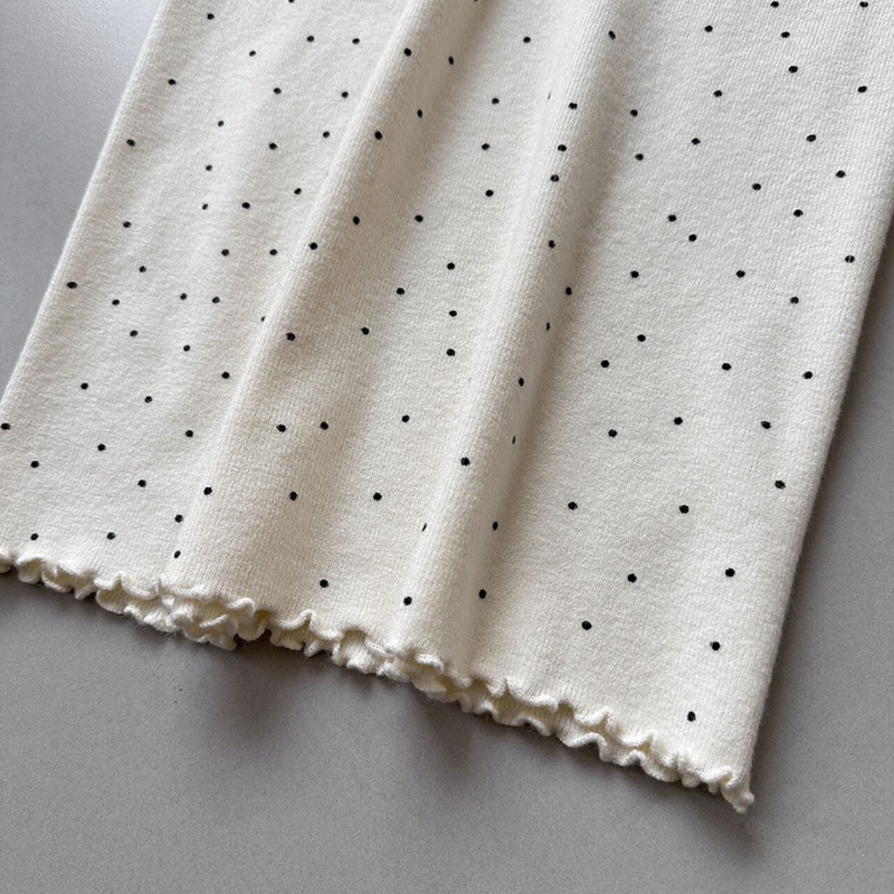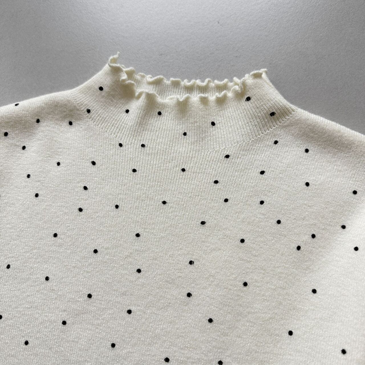 メロウフリルが特徴的なドット柄ニット。