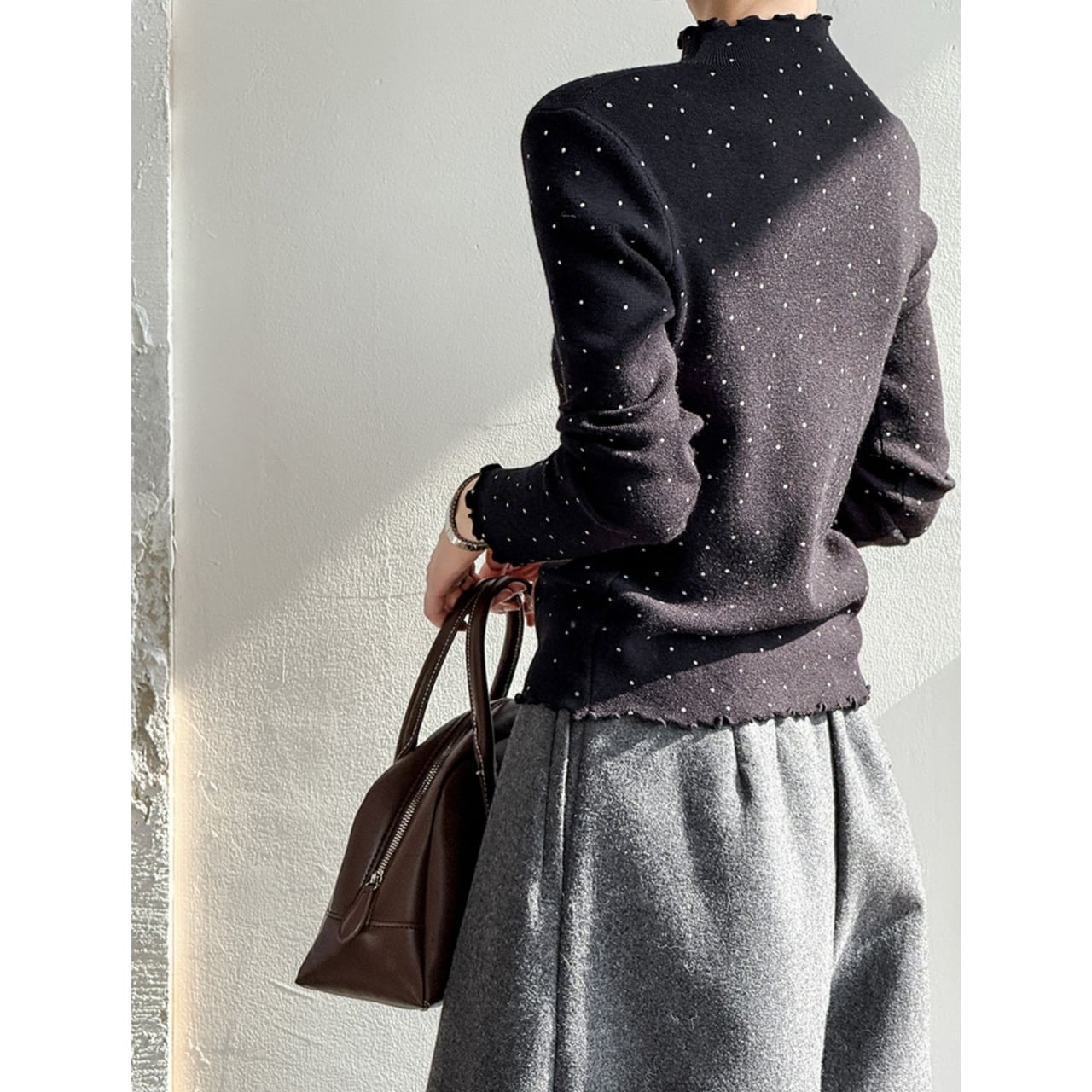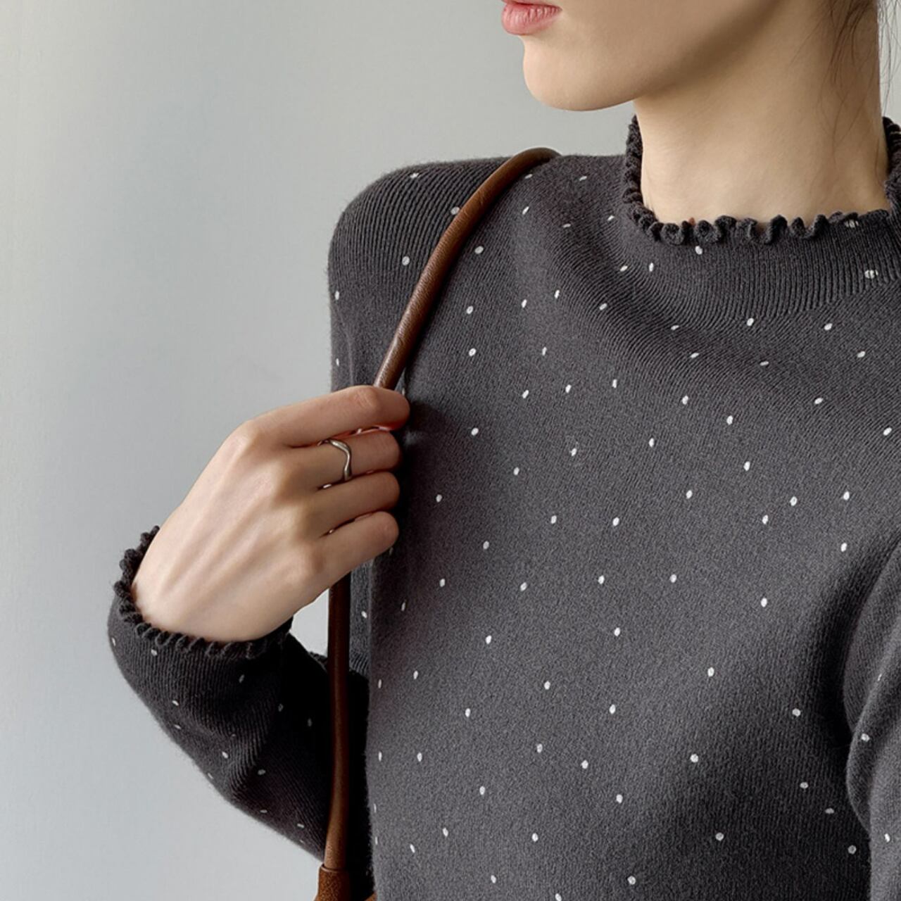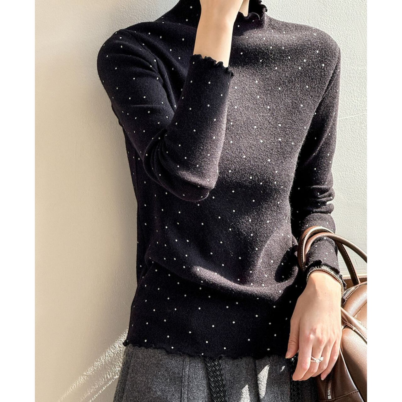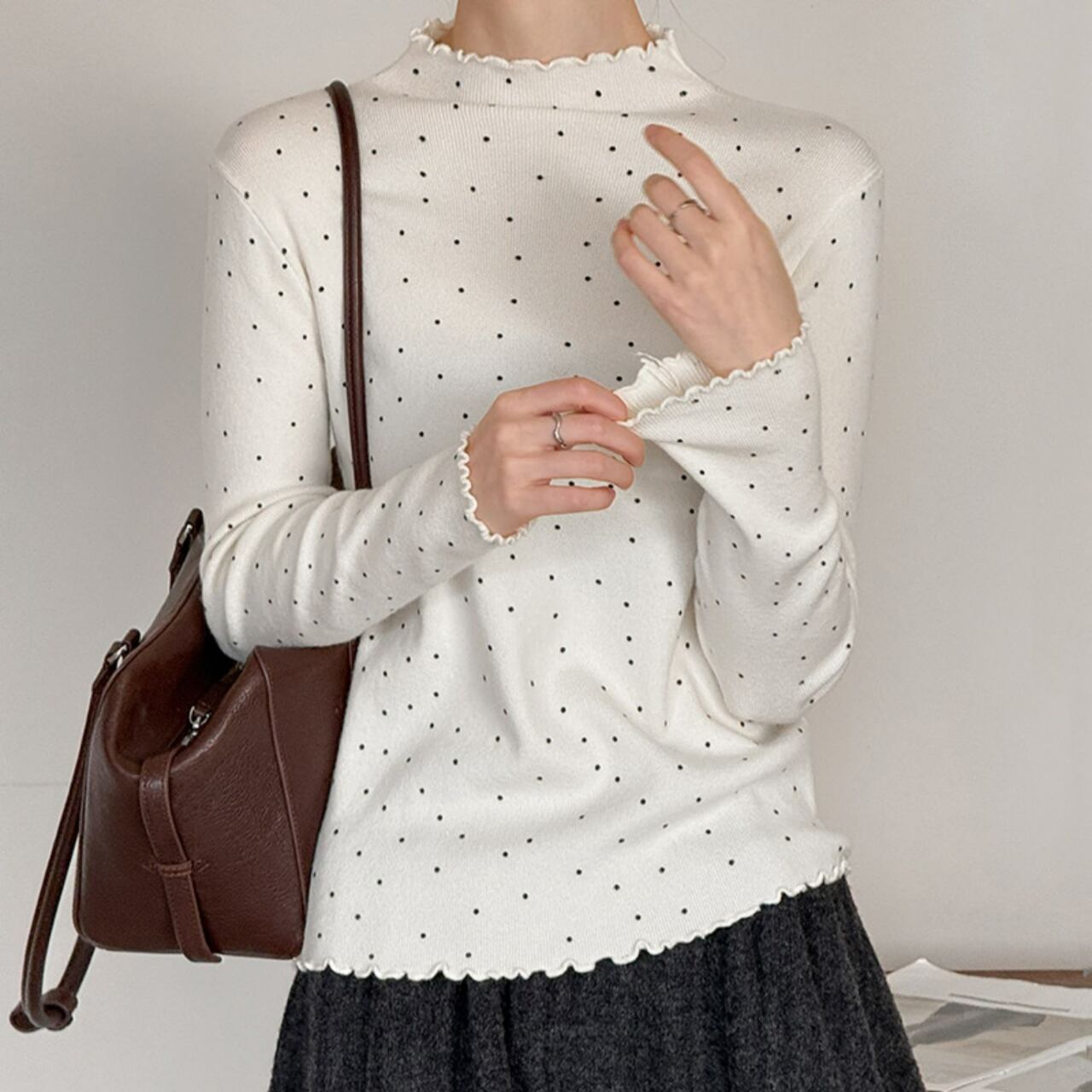 メロウフリルが特徴的なドット柄ニット。