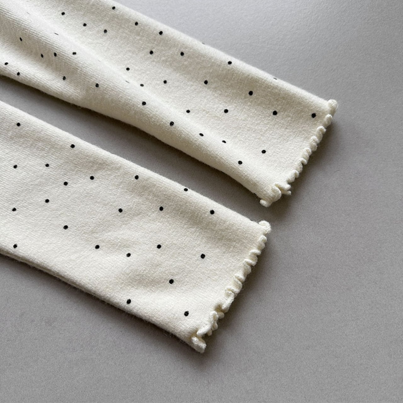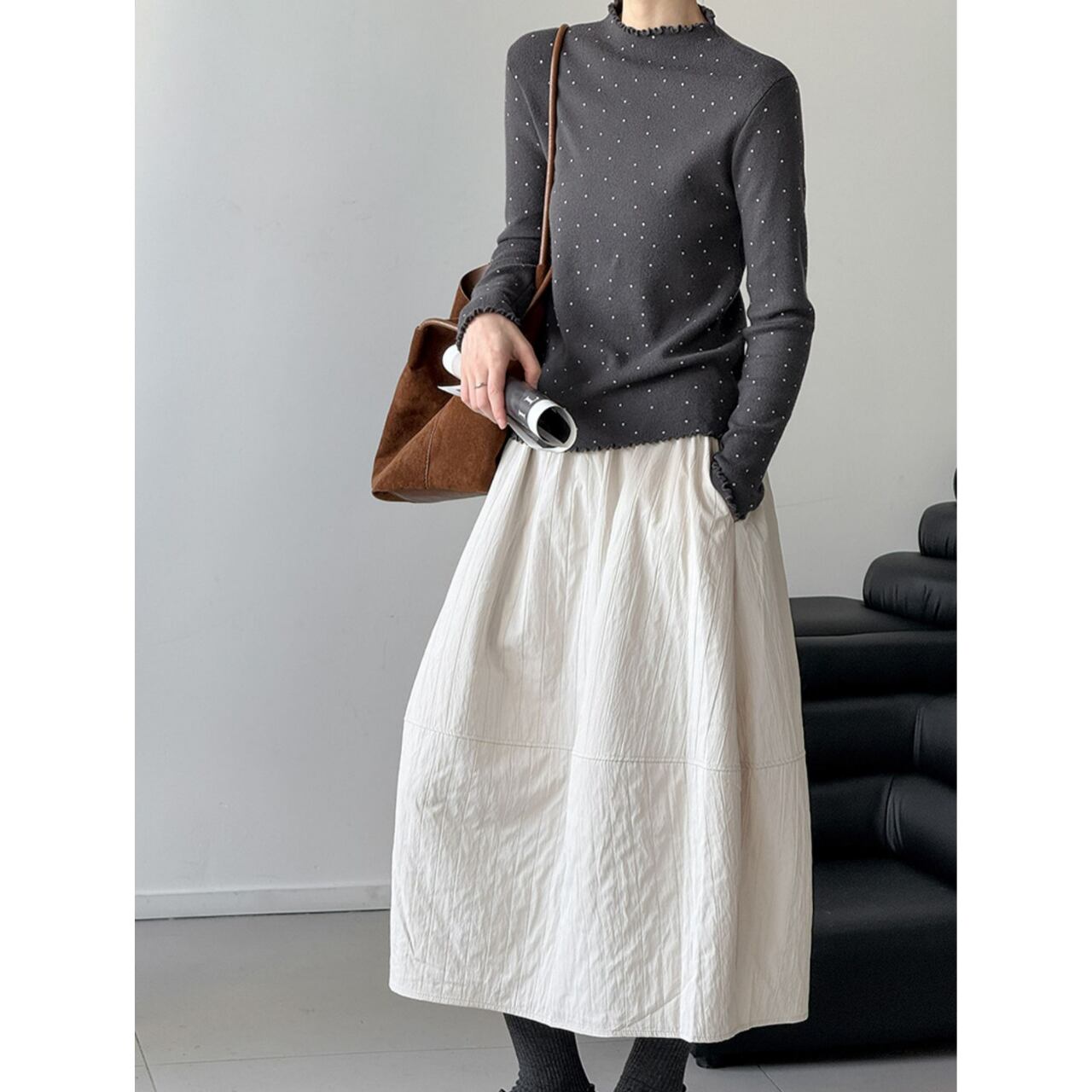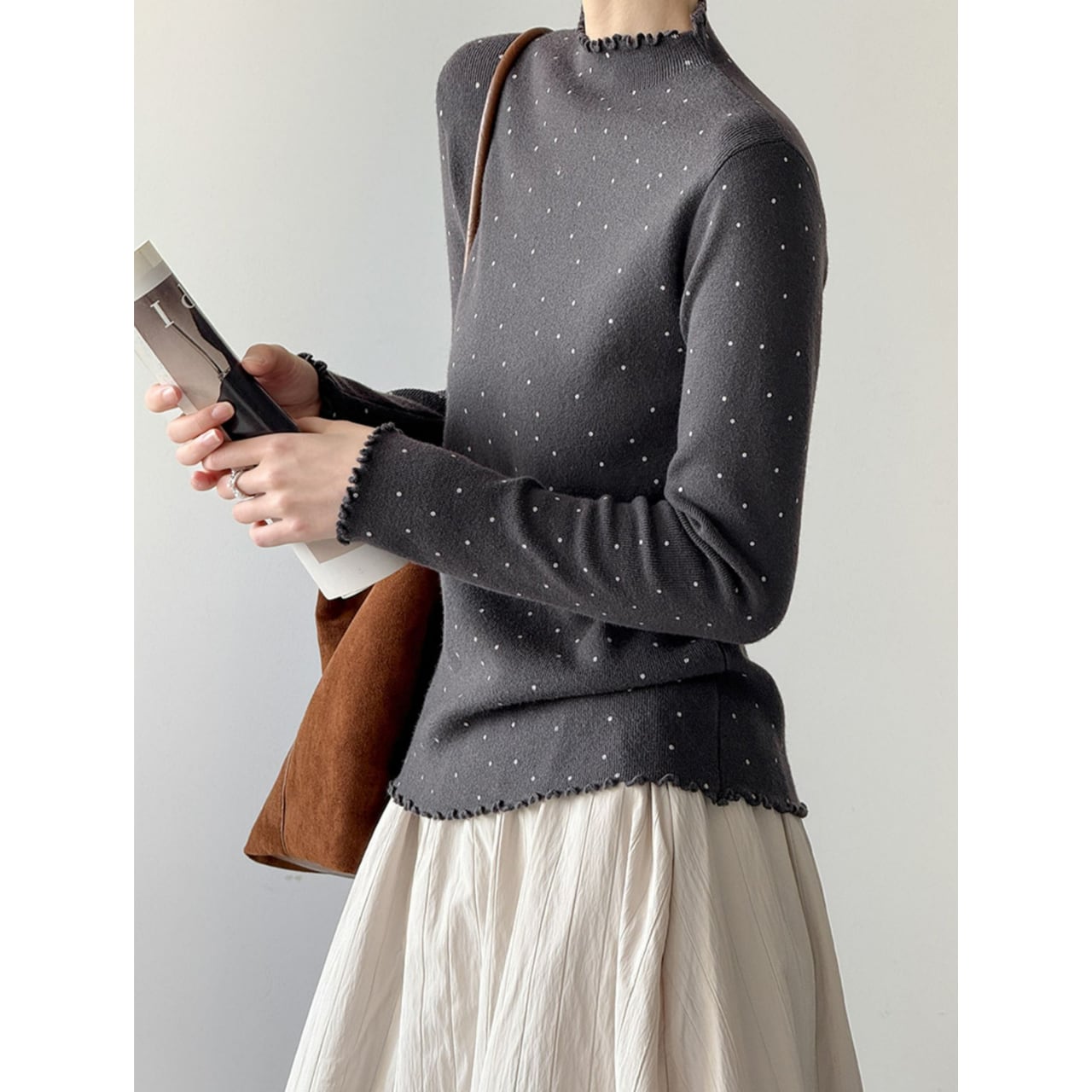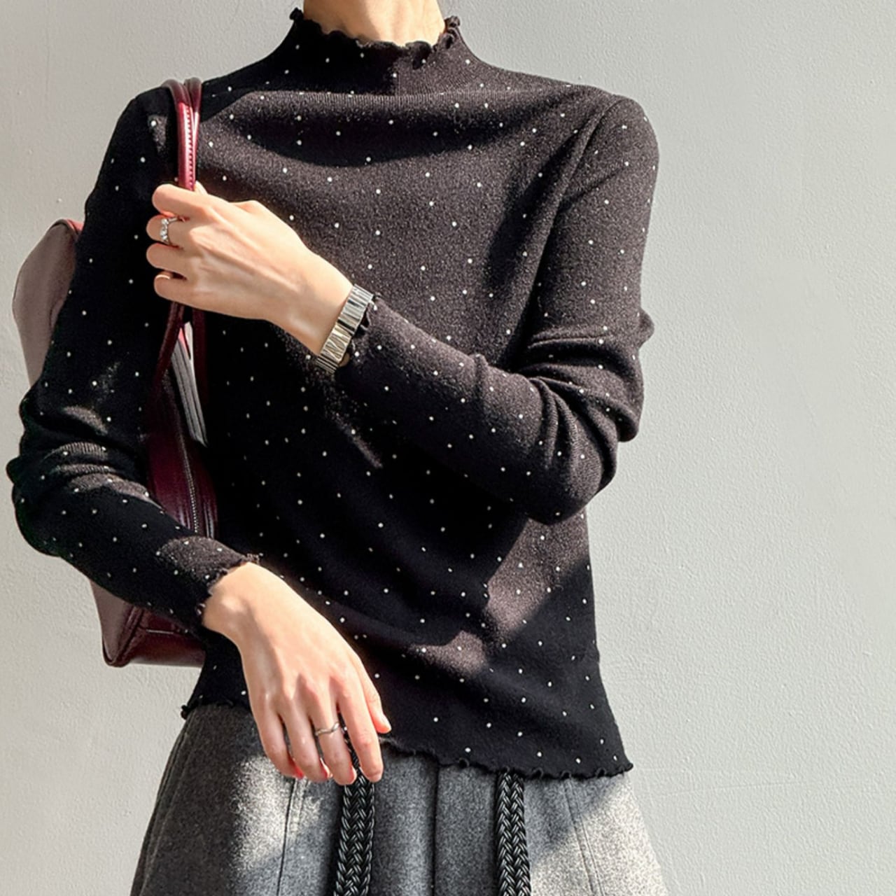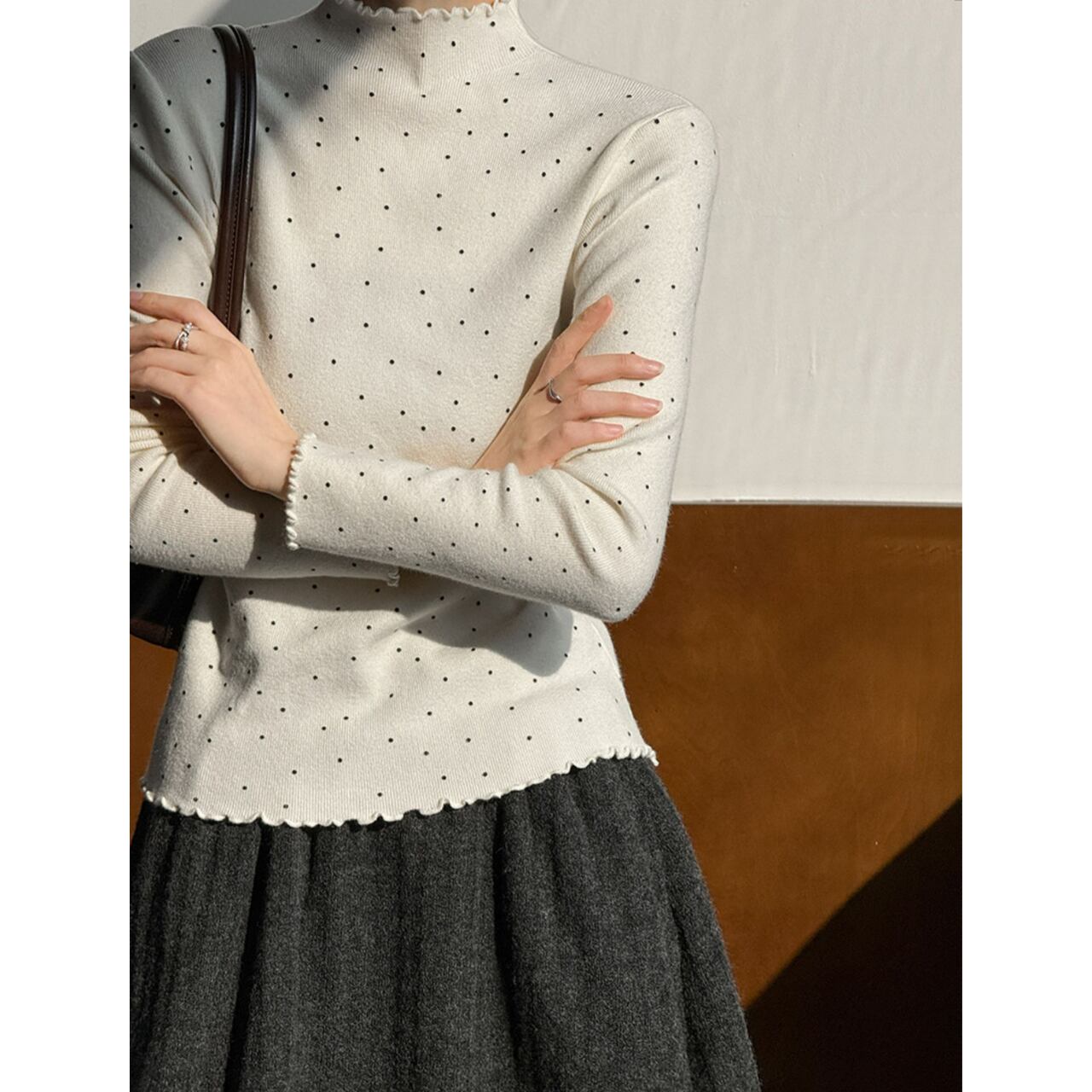 メロウフリルが特徴的なドット柄ニット。
