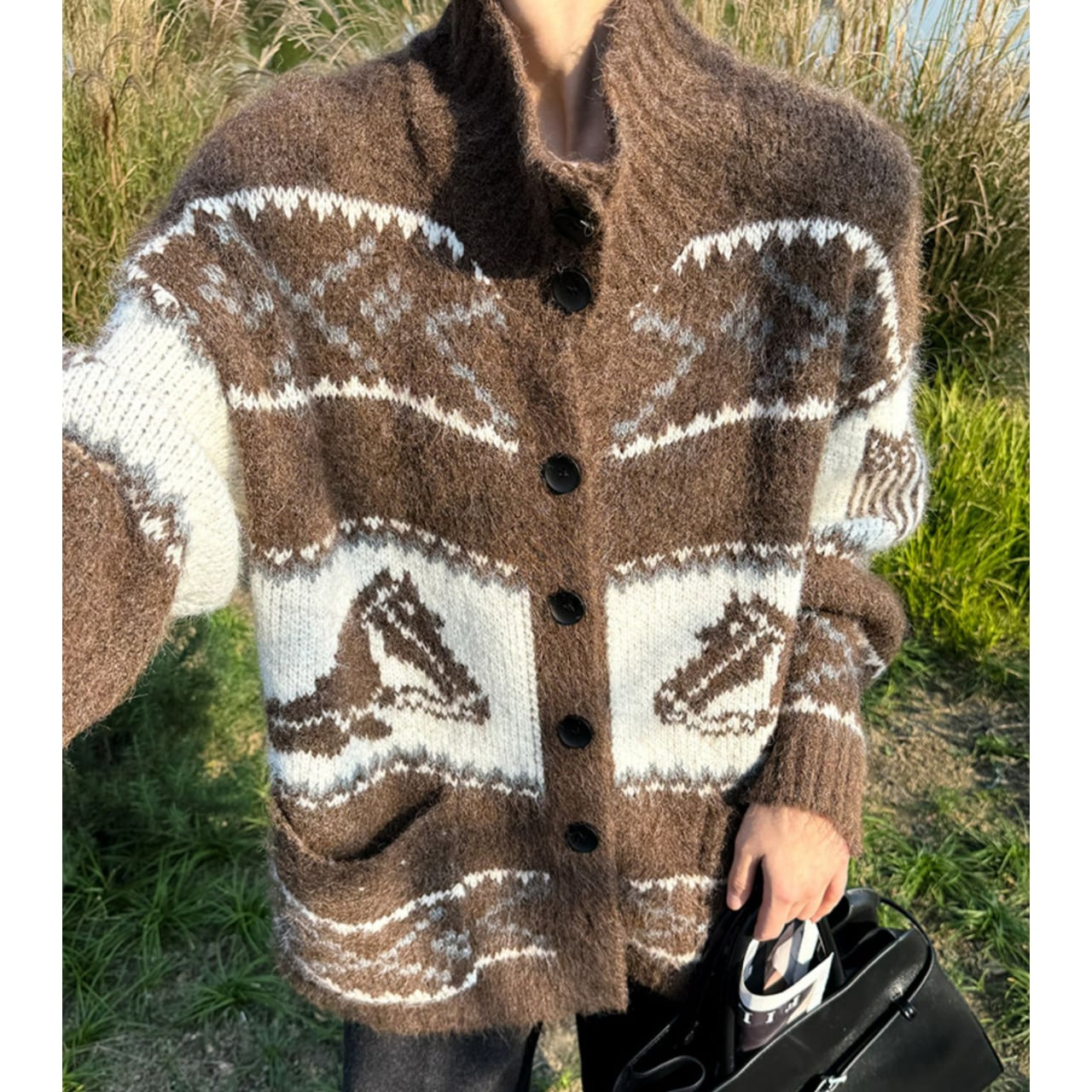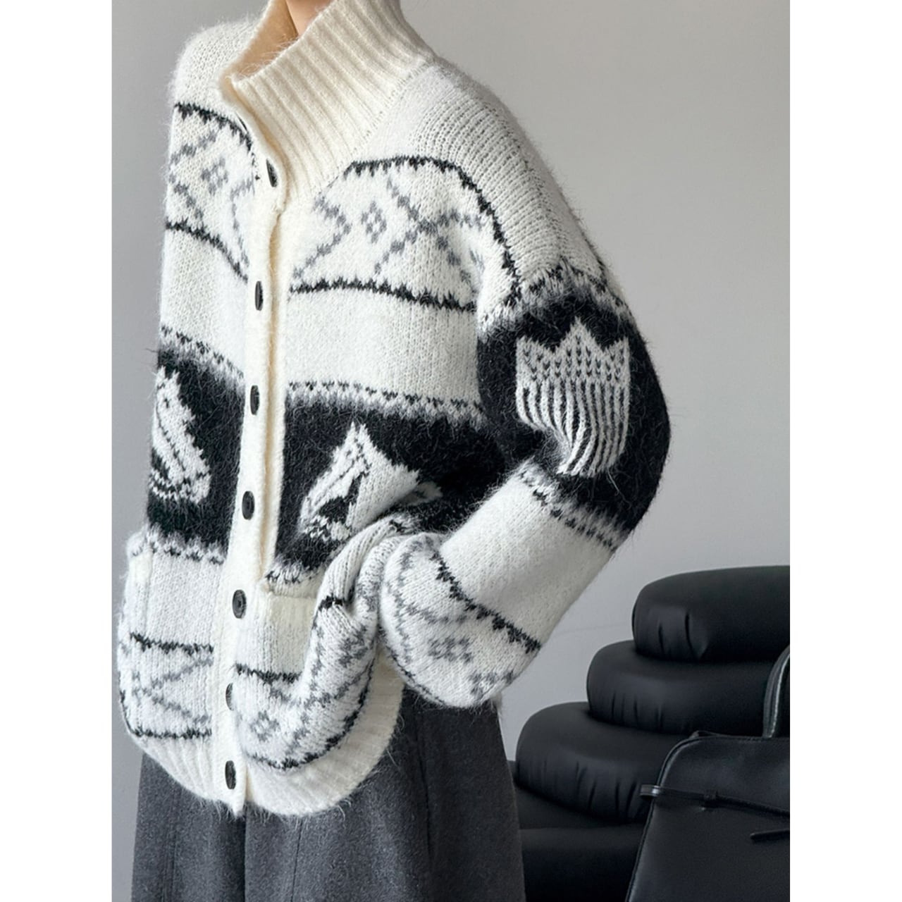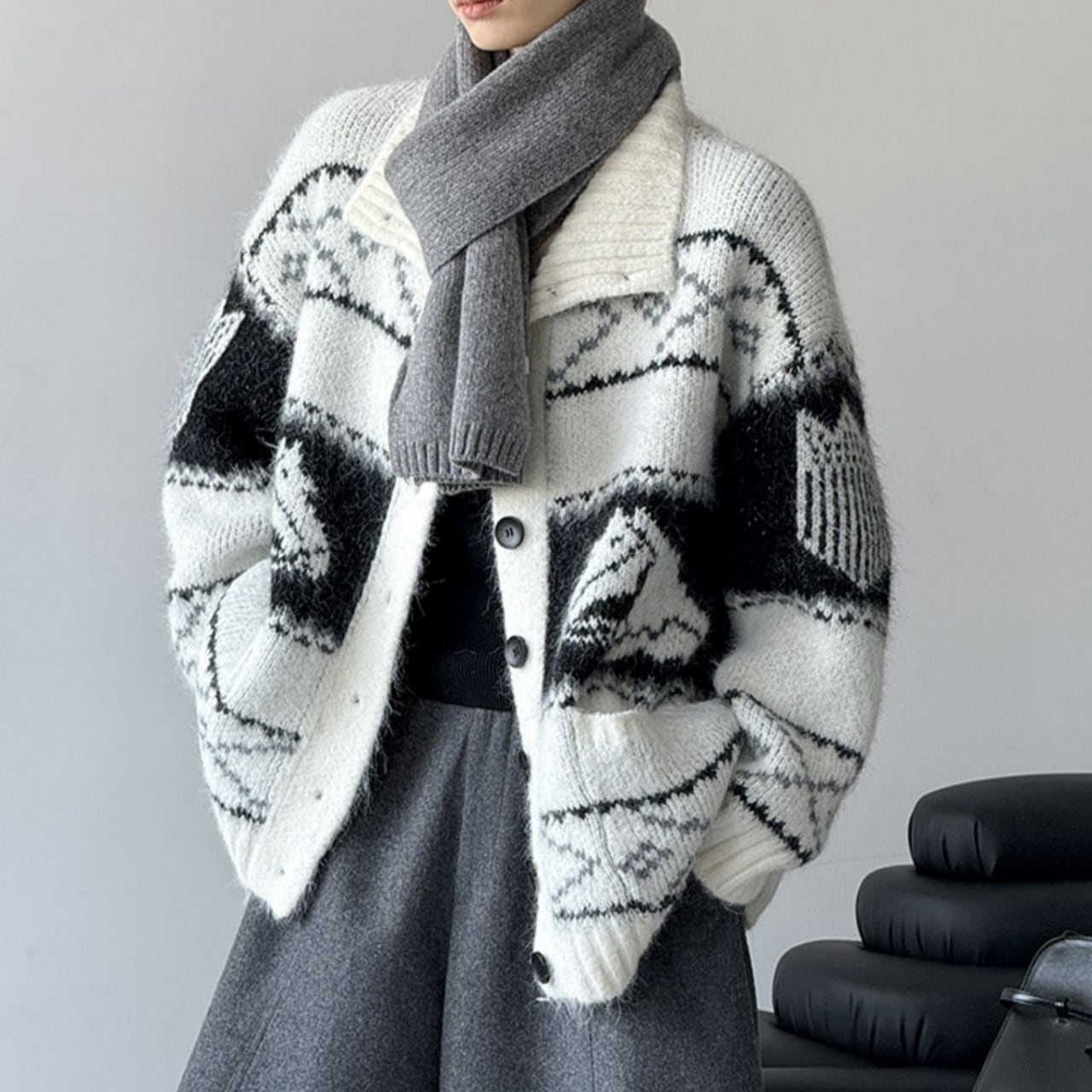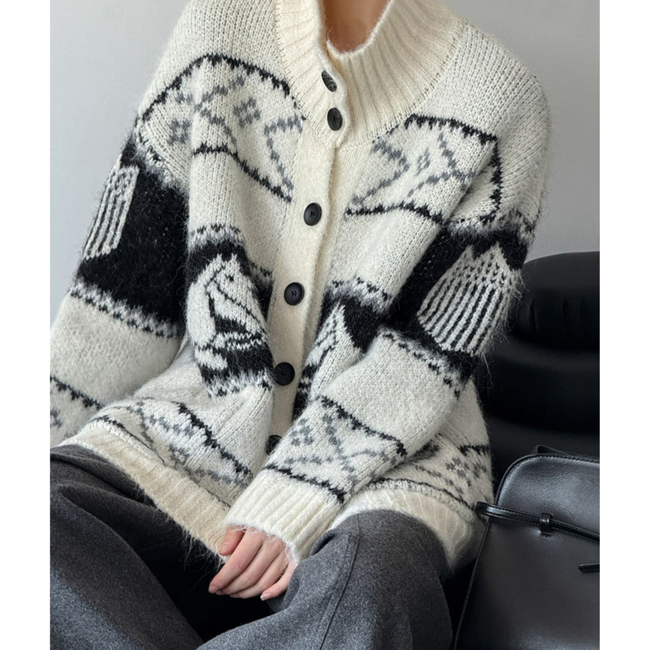 特徴的なパターンが目を引くニットカーディガンは、コーディネートの主役になる一枚。