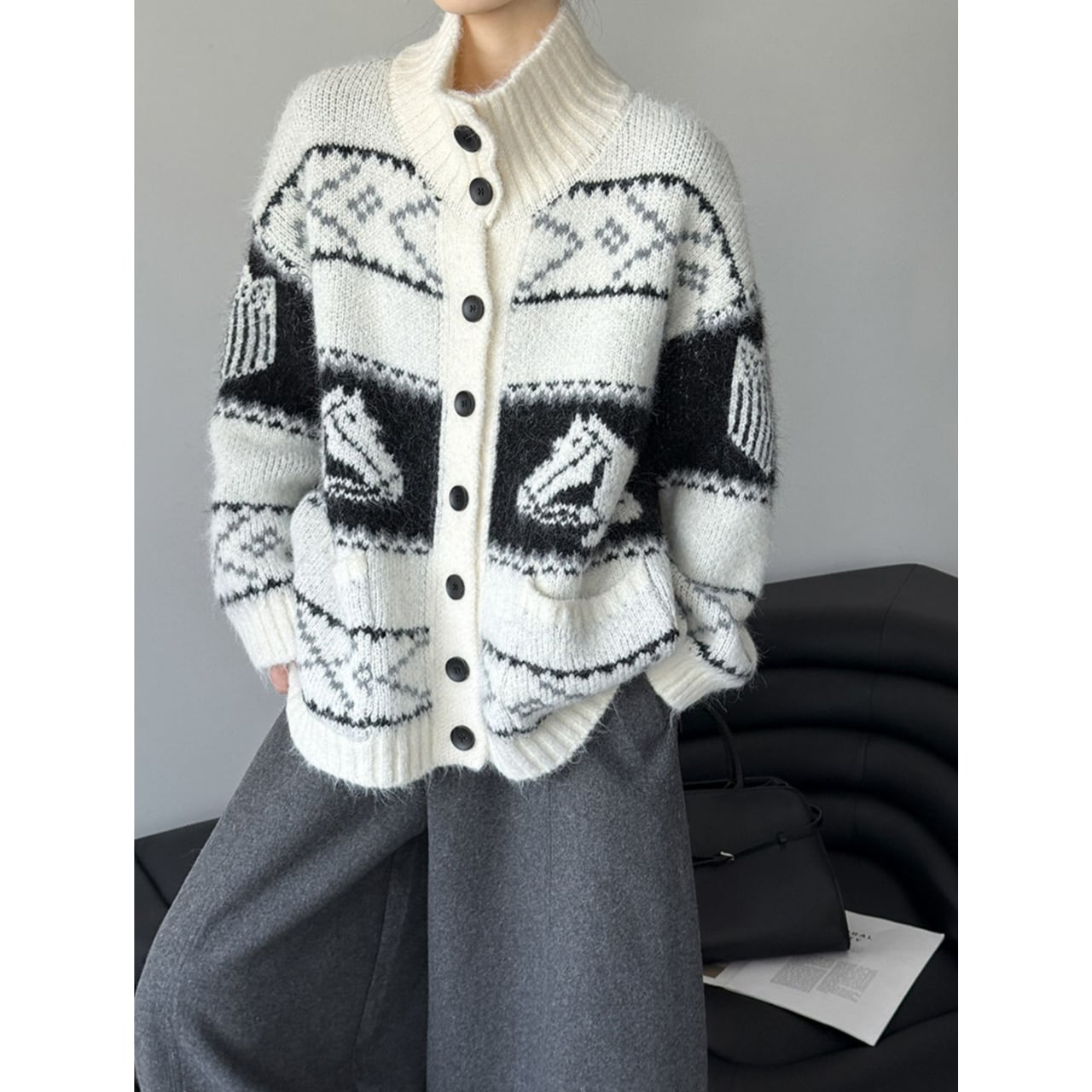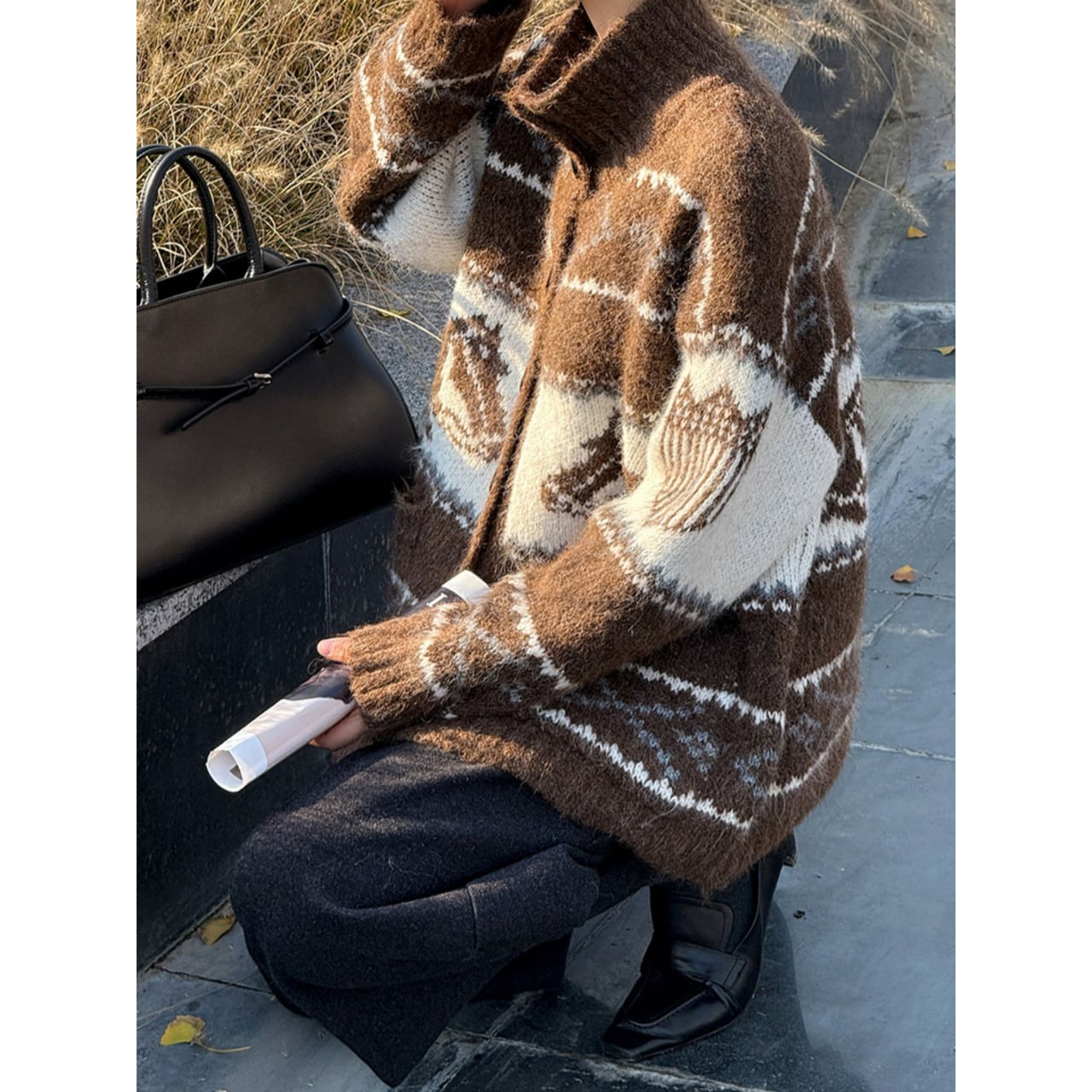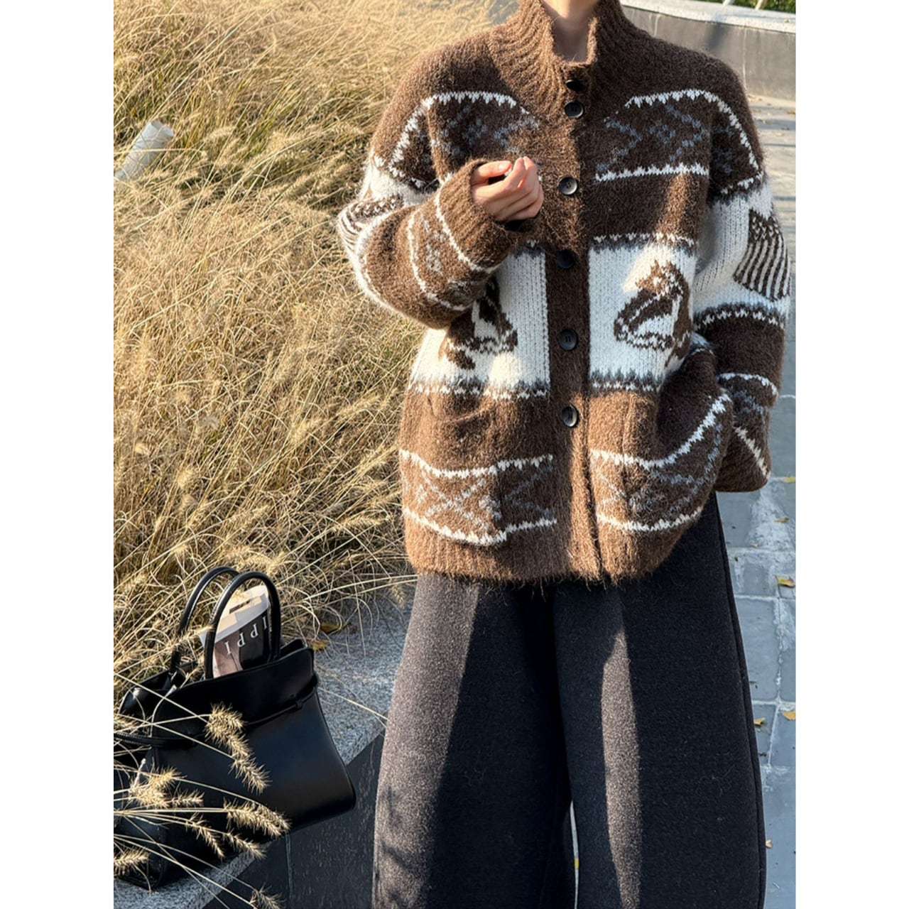 特徴的なパターンが目を引くニットカーディガンは、コーディネートの主役になる一枚。