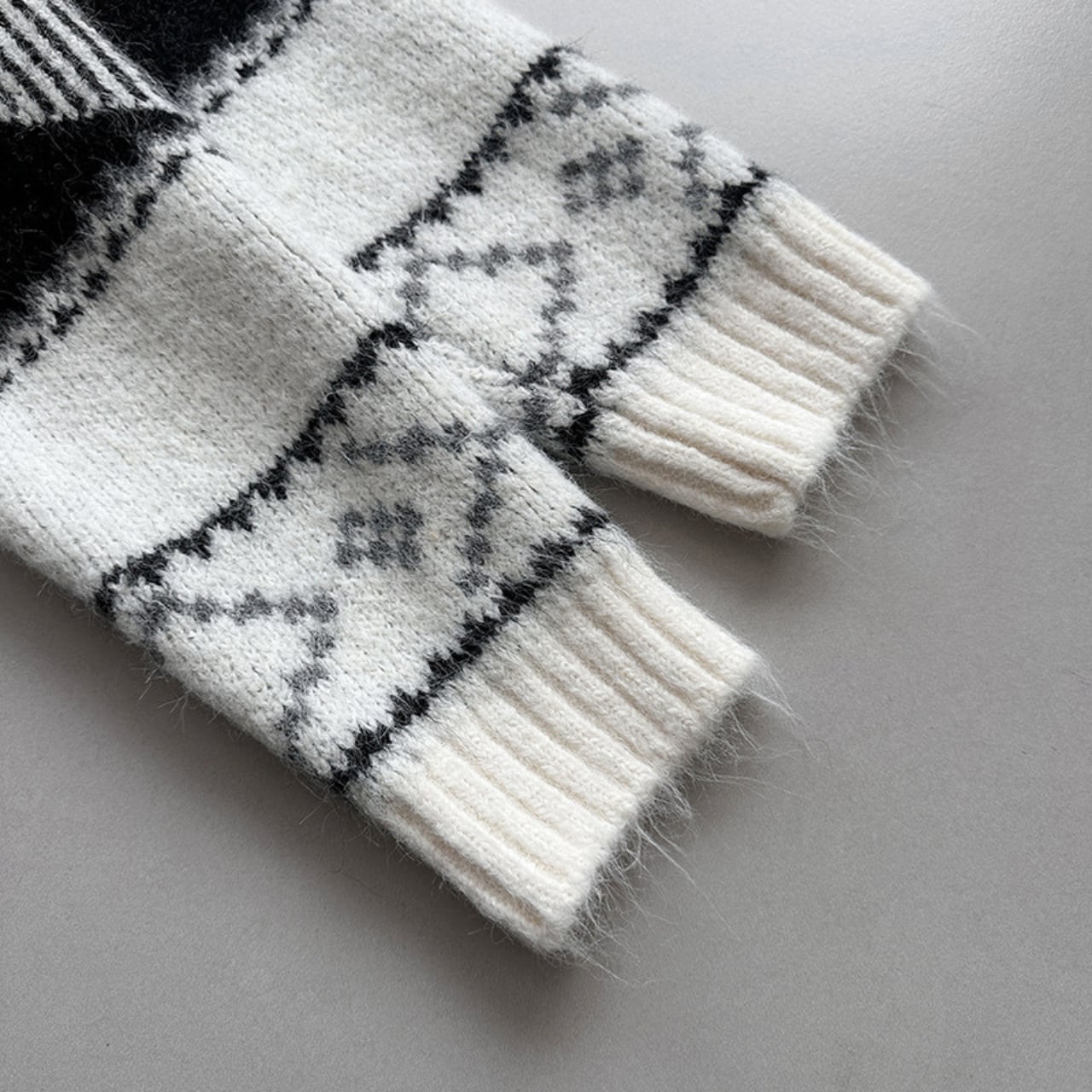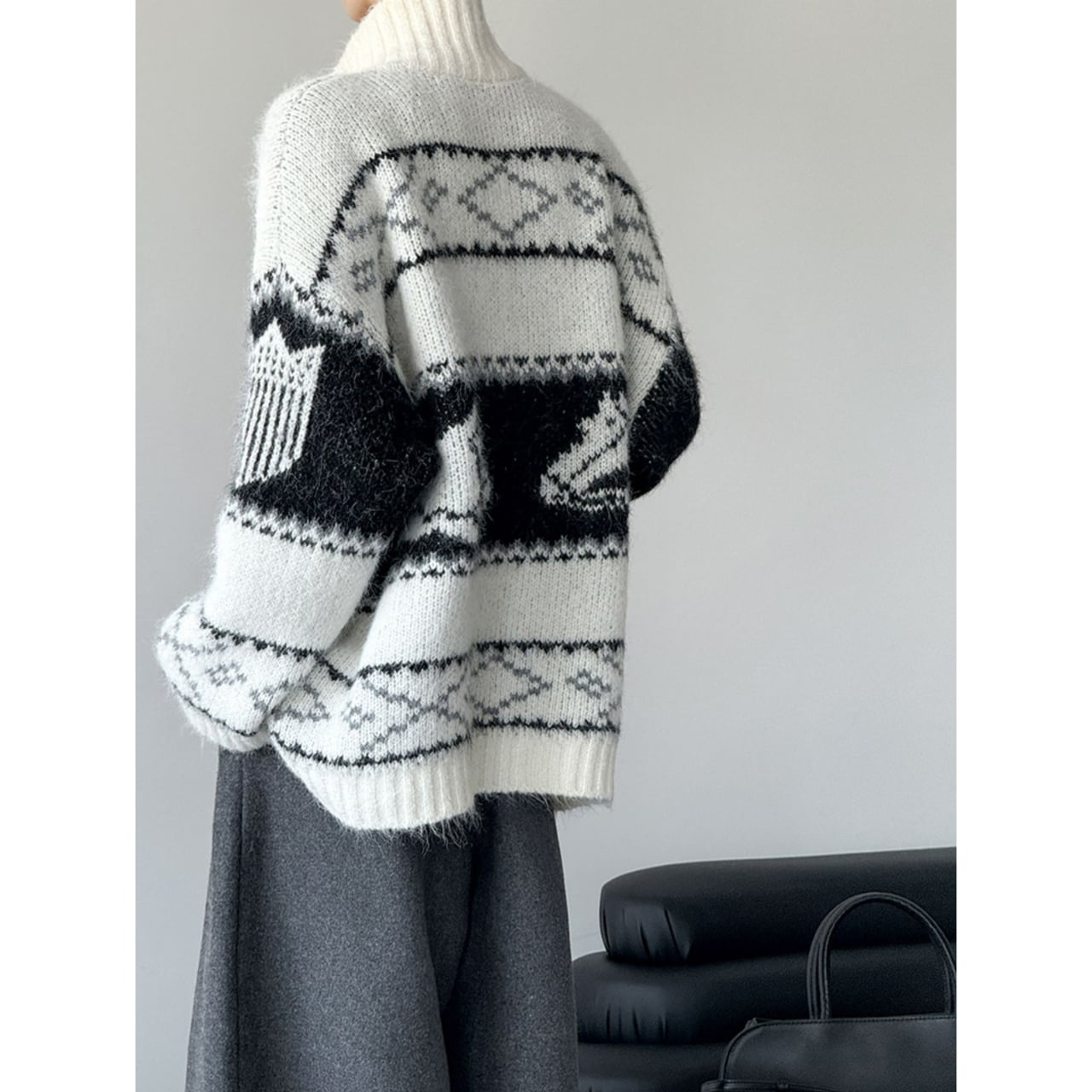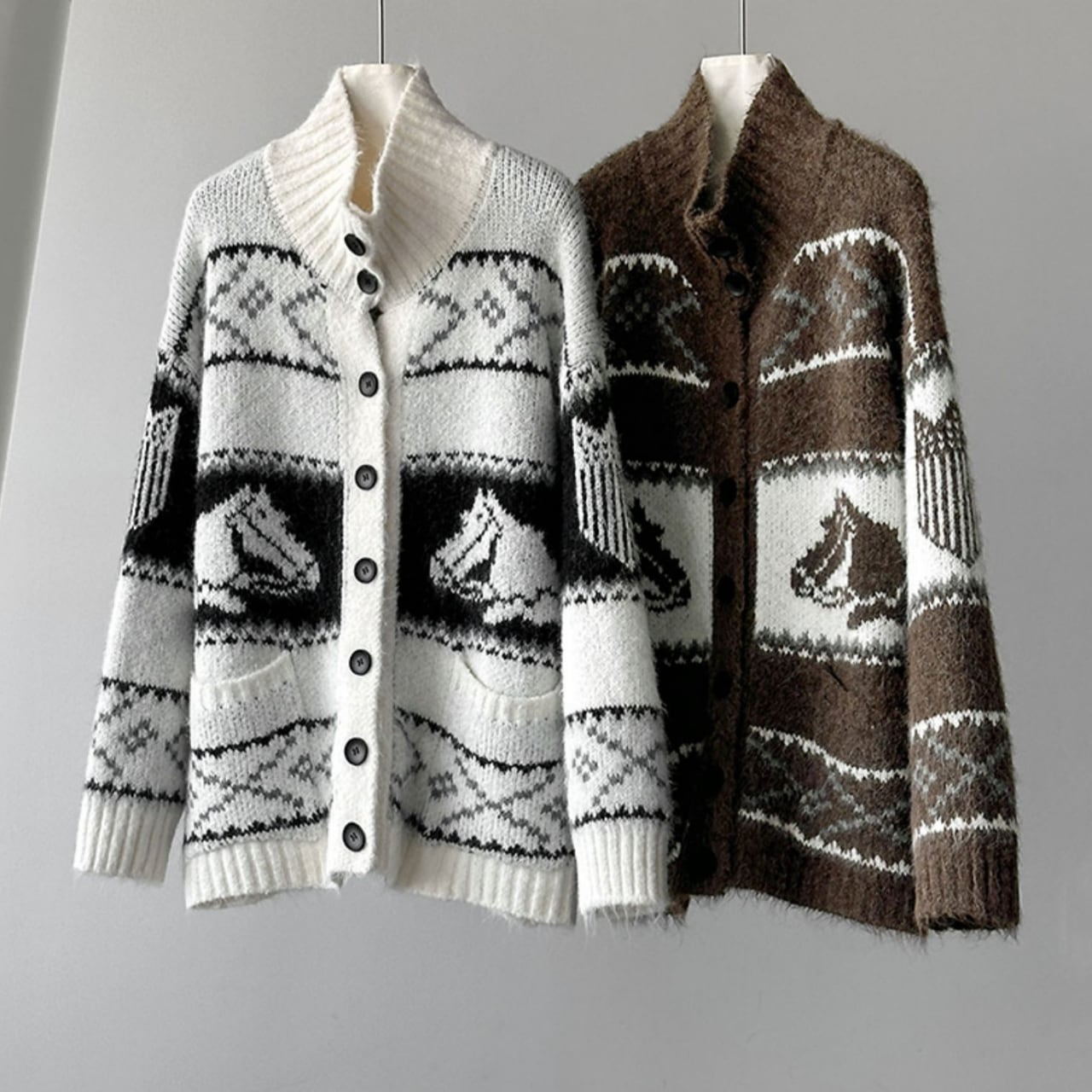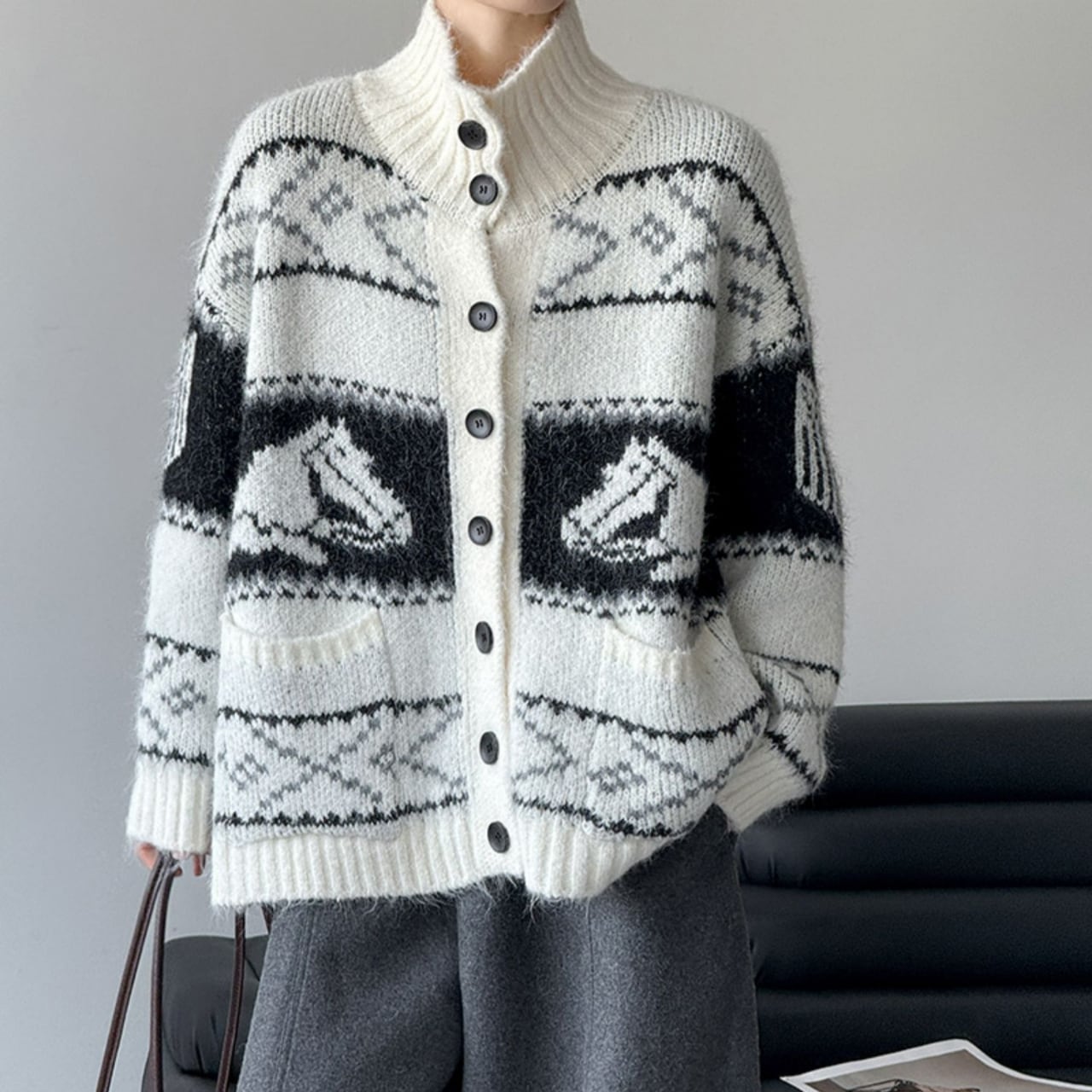特徴的なパターンが目を引くニットカーディガンは、コーディネートの主役になる一枚。
