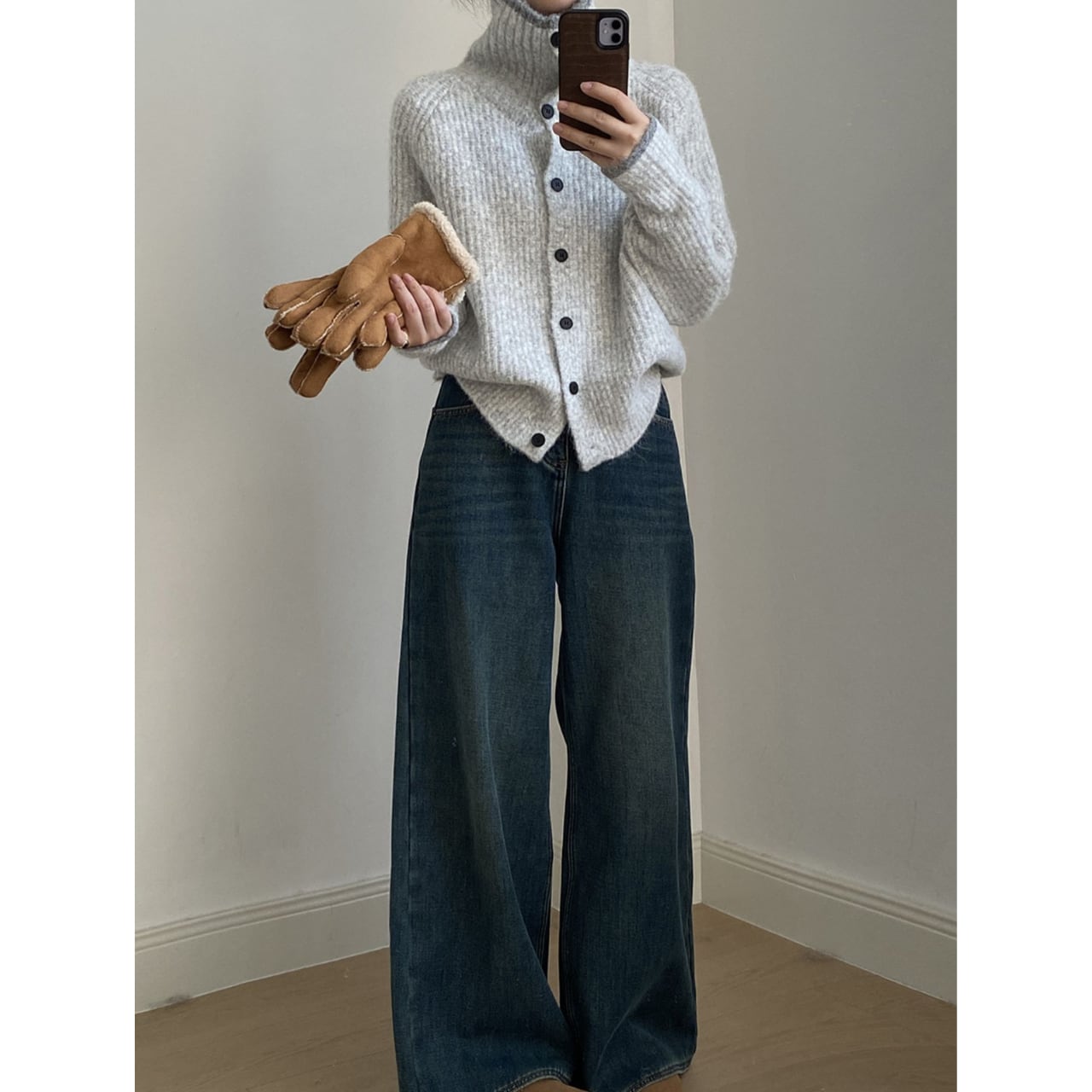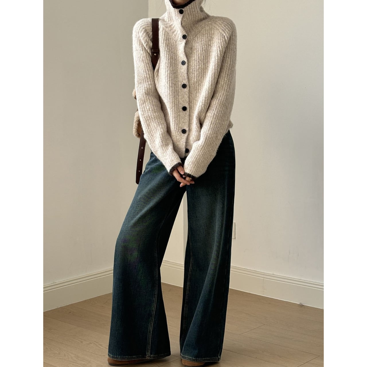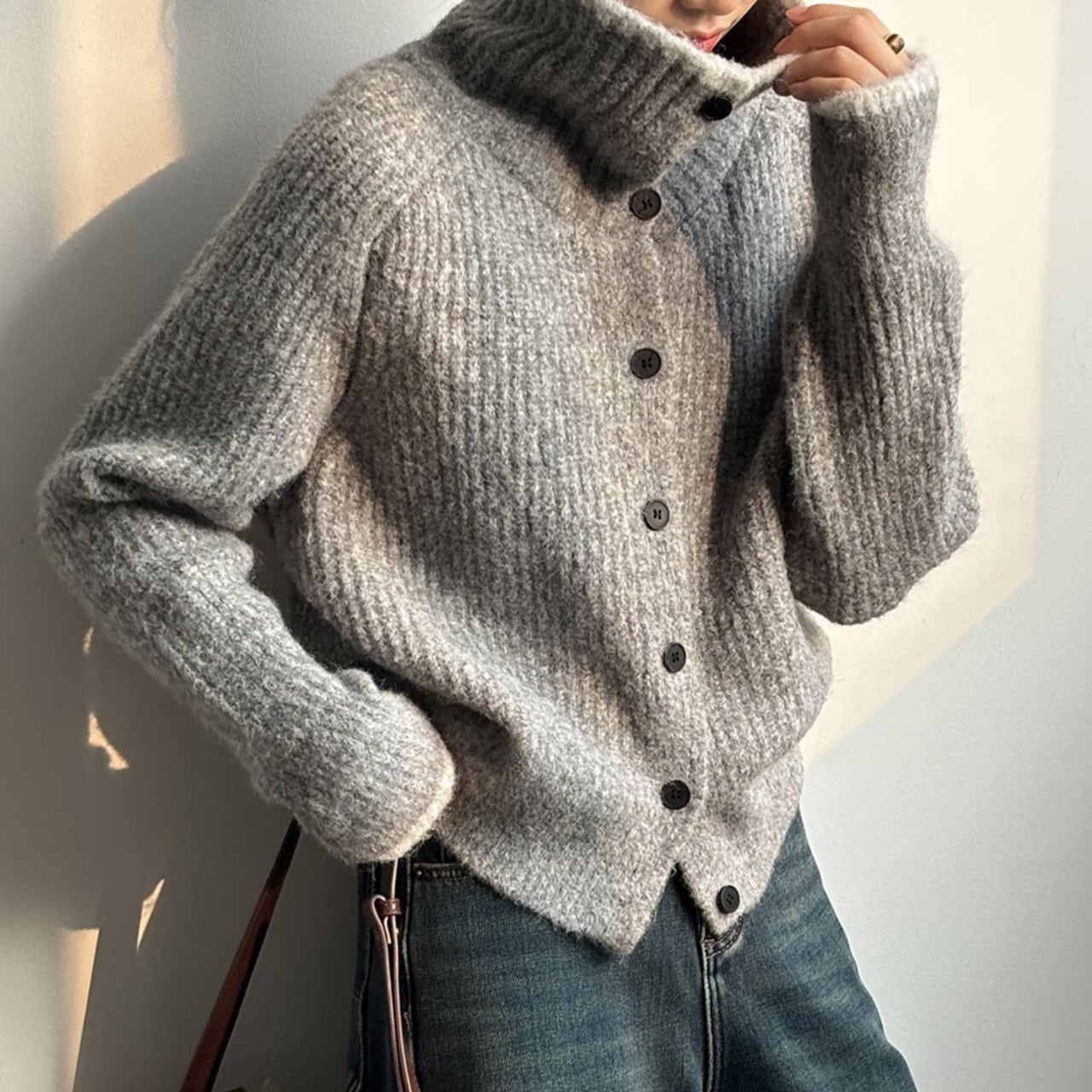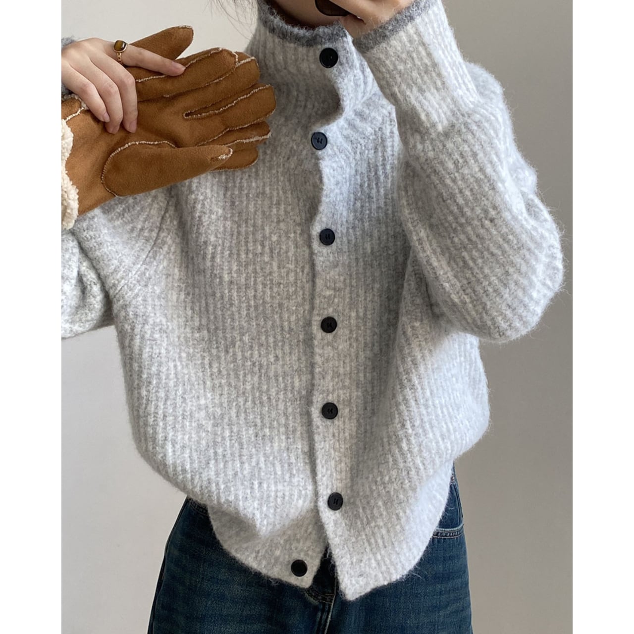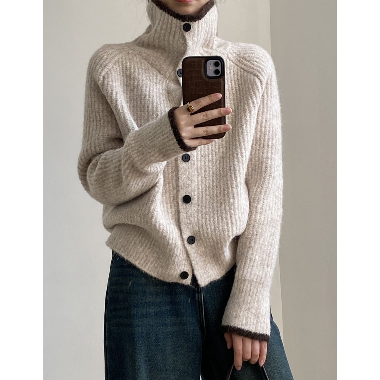 リブ編みニットカーディガンは、デザインと機能性を兼ね備えた一着です。