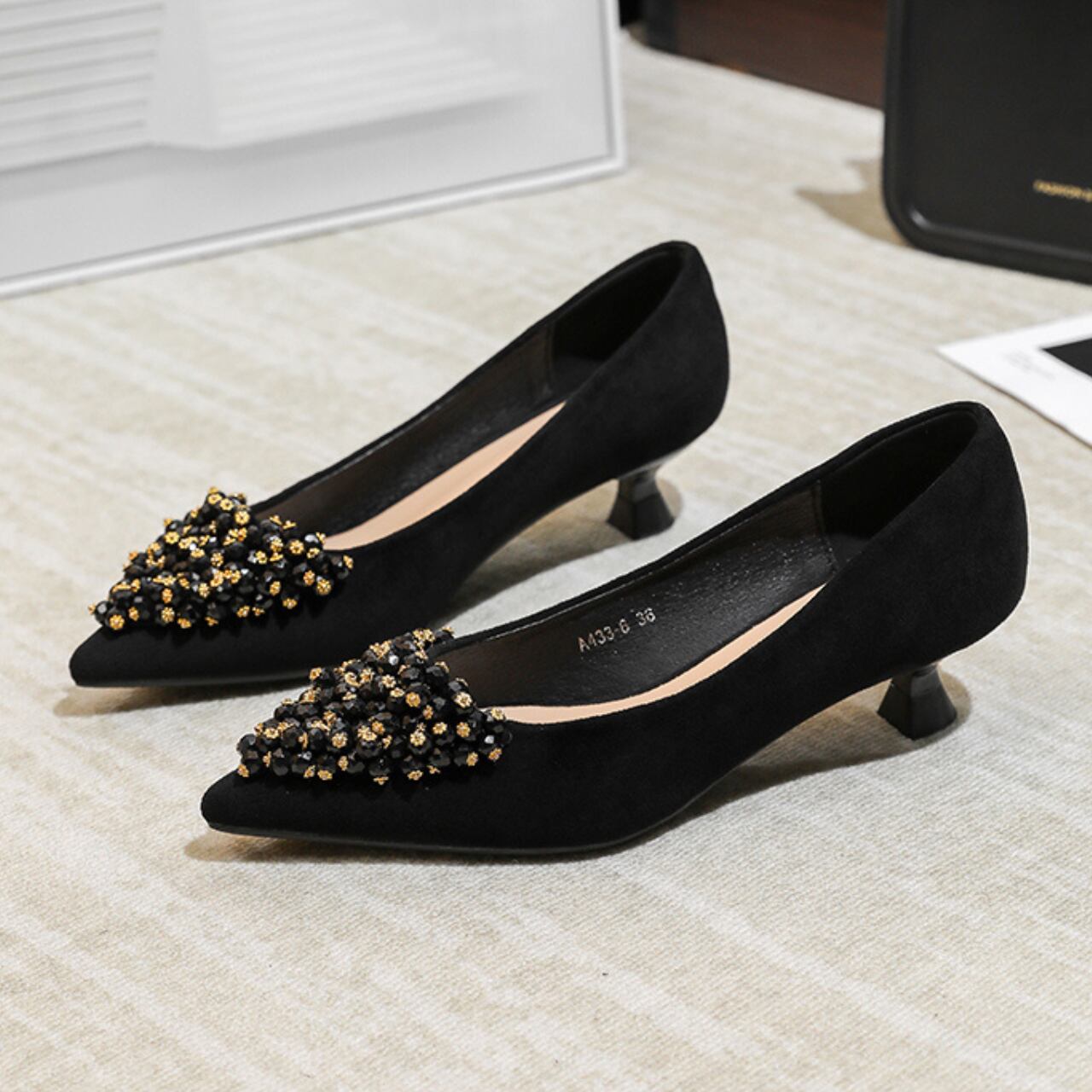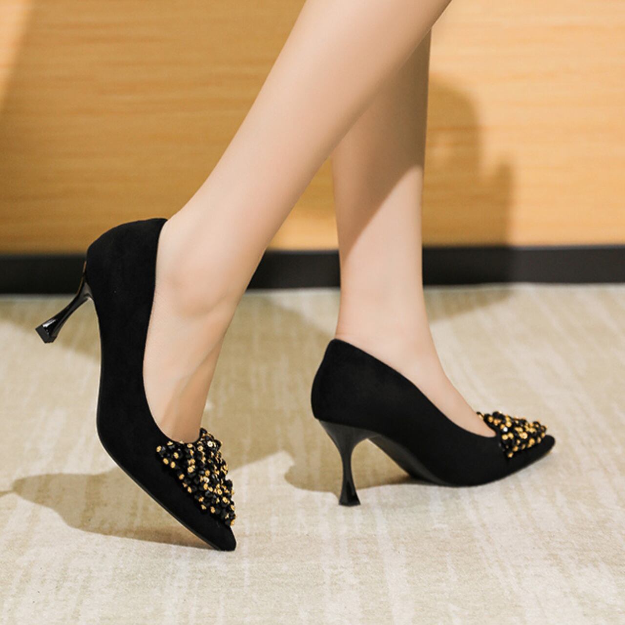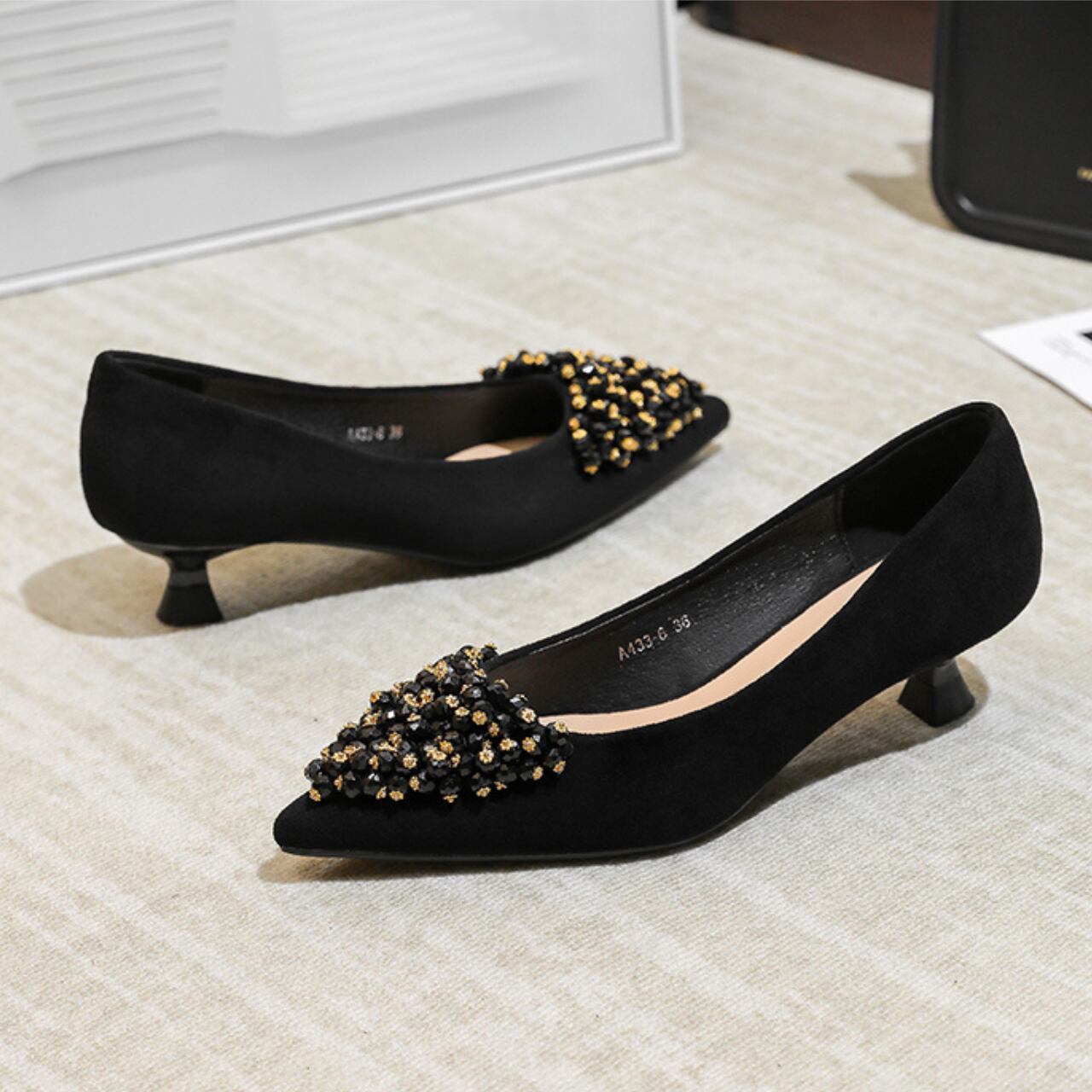 ポインテッドトゥのデザインが足元をシャープに演出し、洗練された印象を与えます。