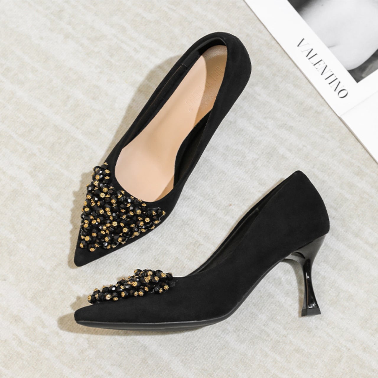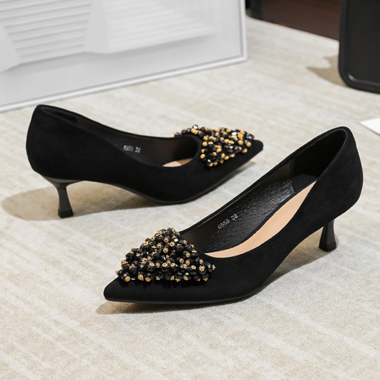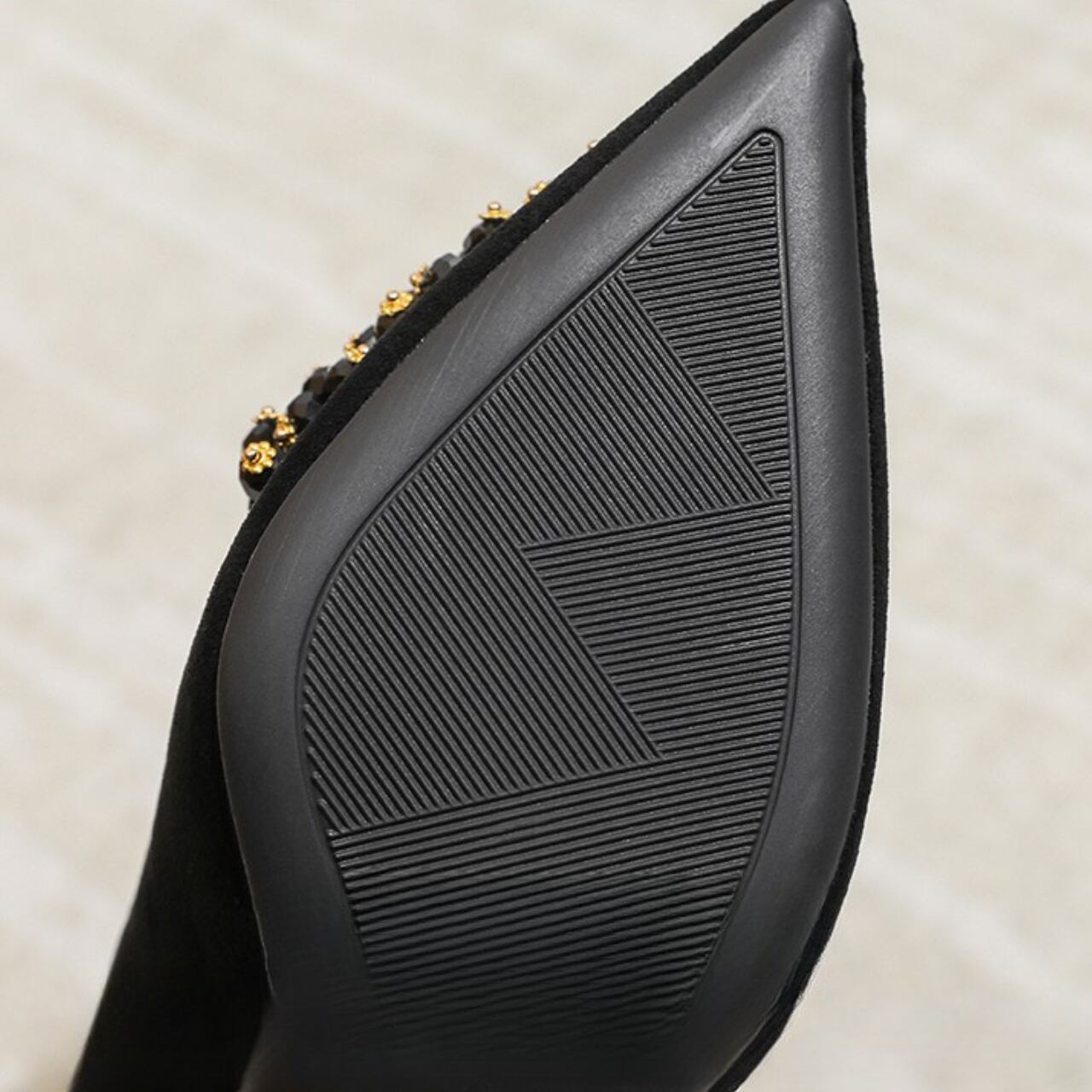 ポインテッドトゥのデザインが足元をシャープに演出し、洗練された印象を与えます。