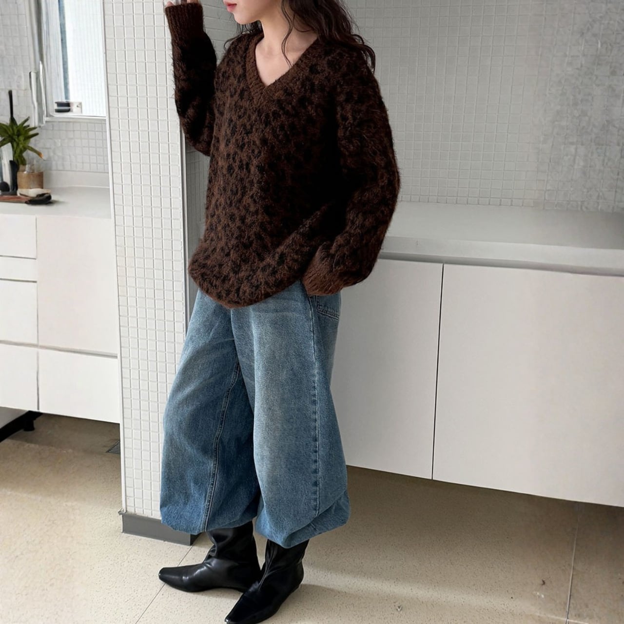 深すぎないVネックラインは、上品さをプラスしつつ、インナーとのレイヤードも楽しめます。