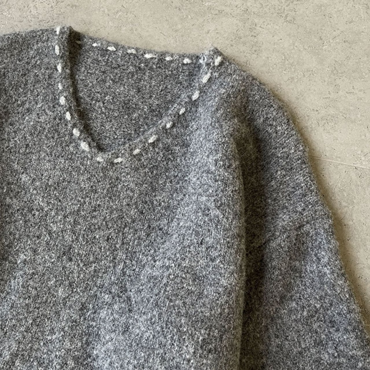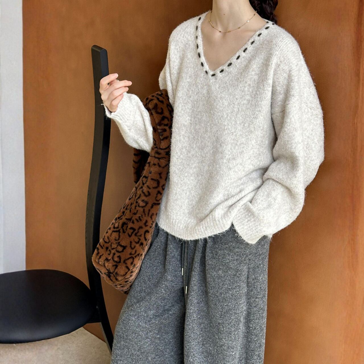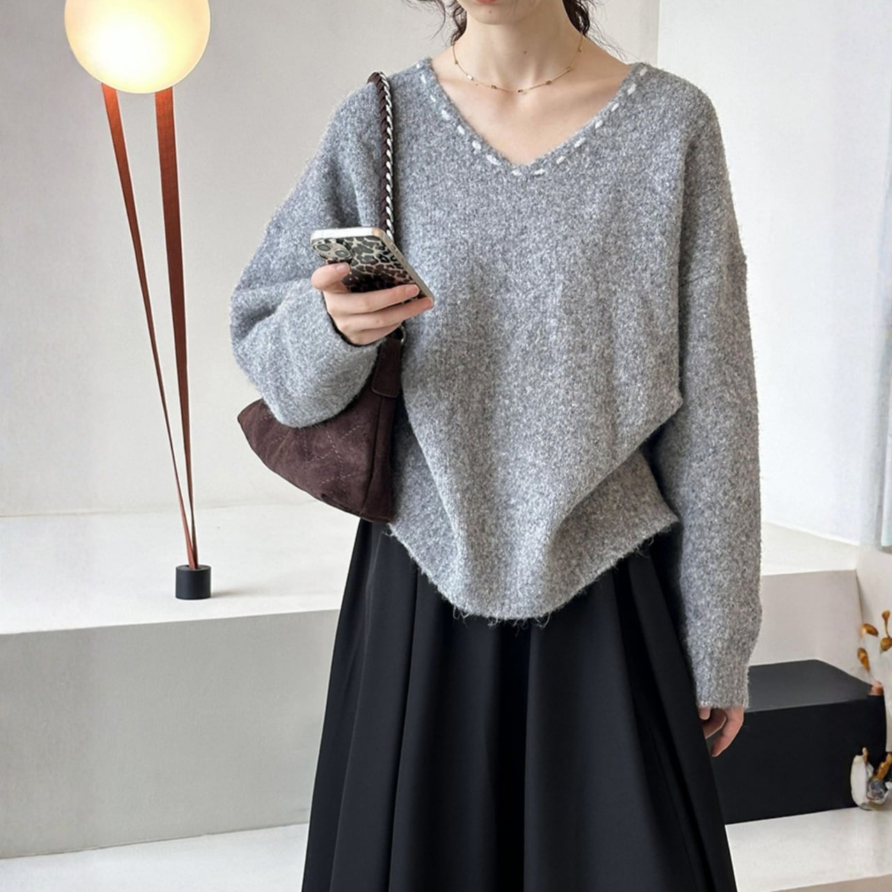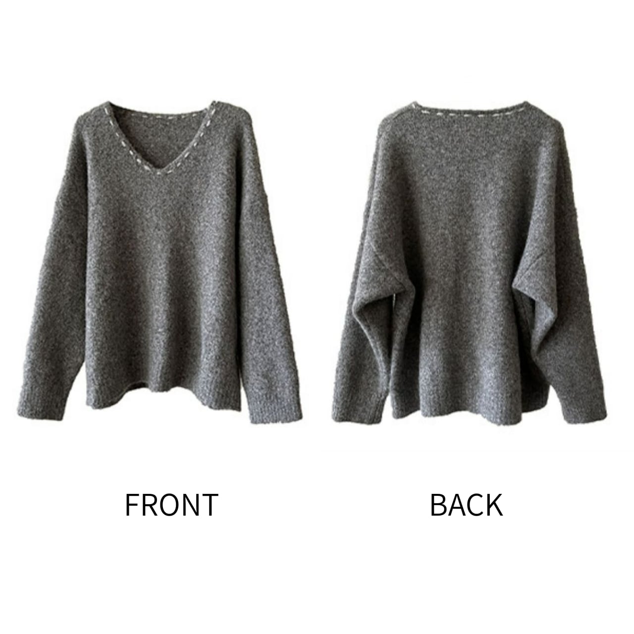 Vネックが首元をすっきりと見せてくれる、長袖オーバーサイズニット。