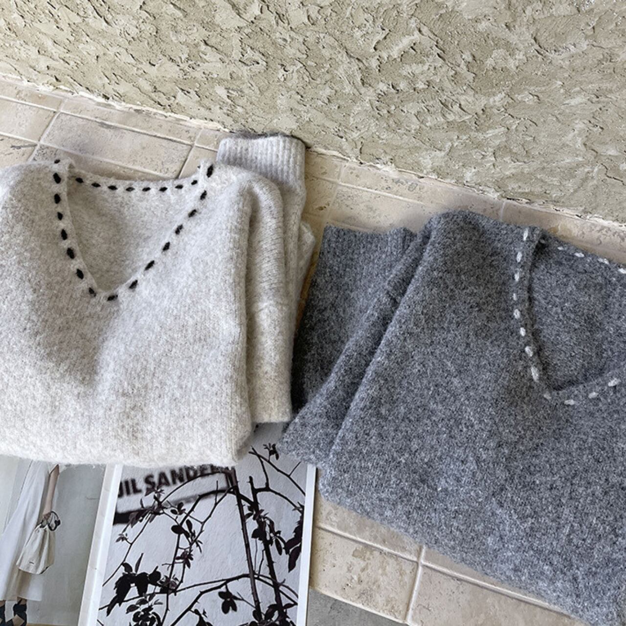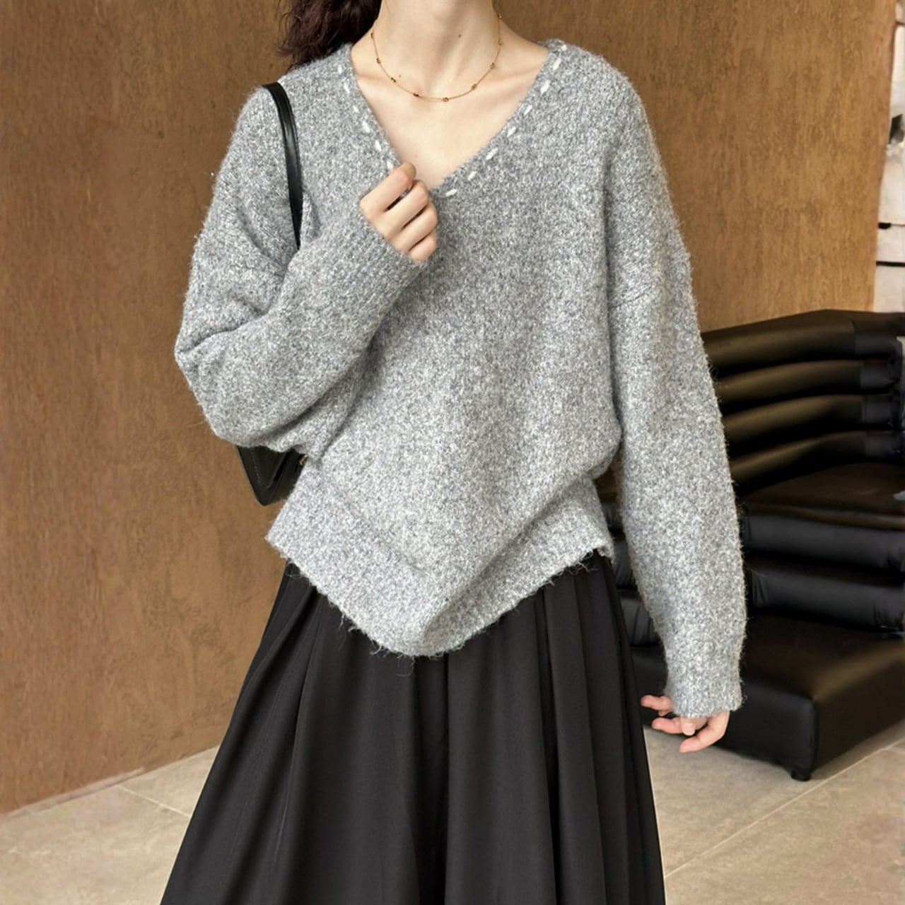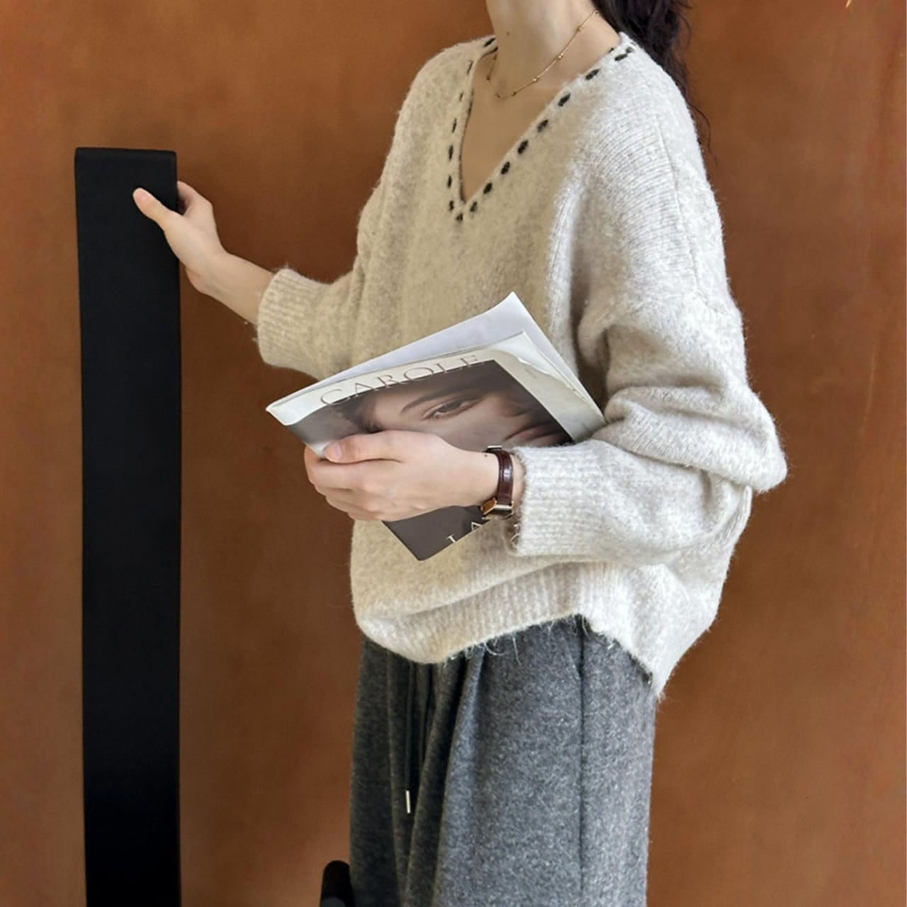 Vネックが首元をすっきりと見せてくれる、長袖オーバーサイズニット。