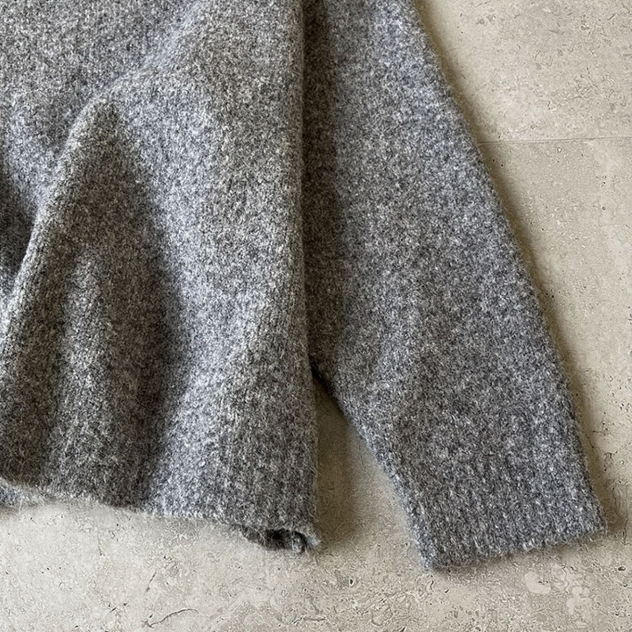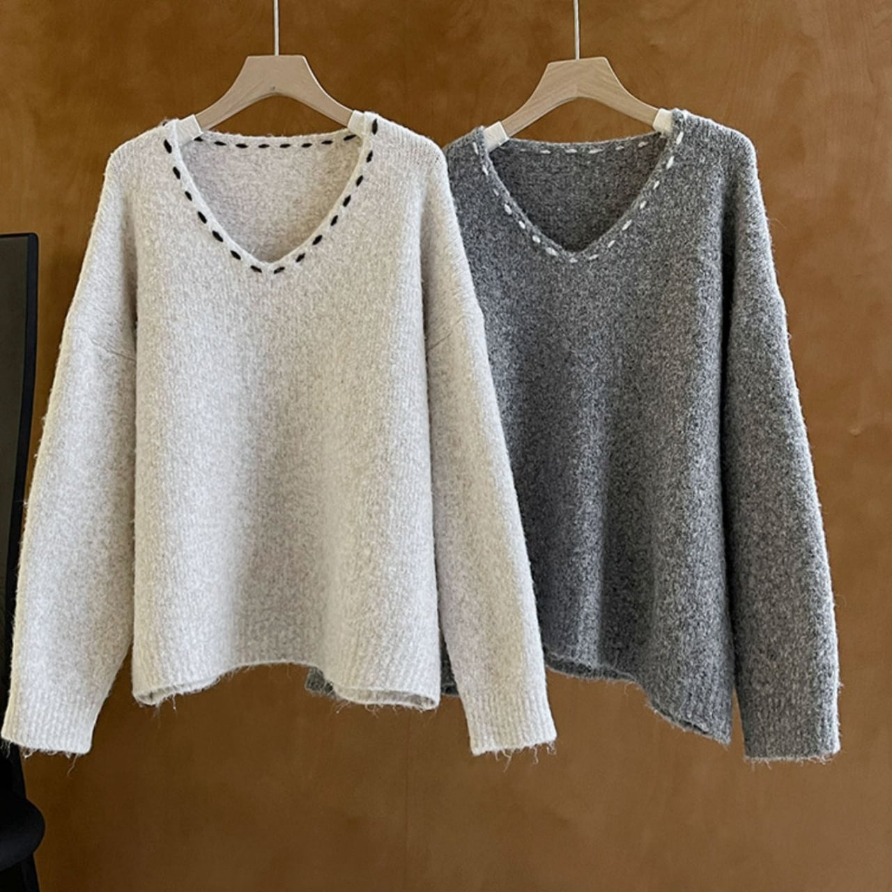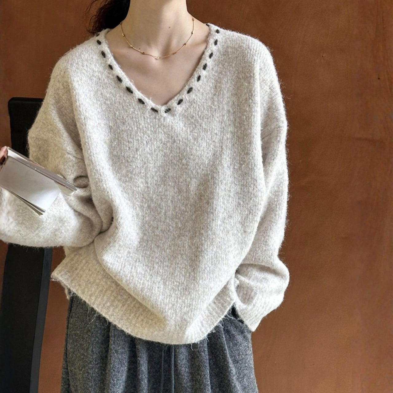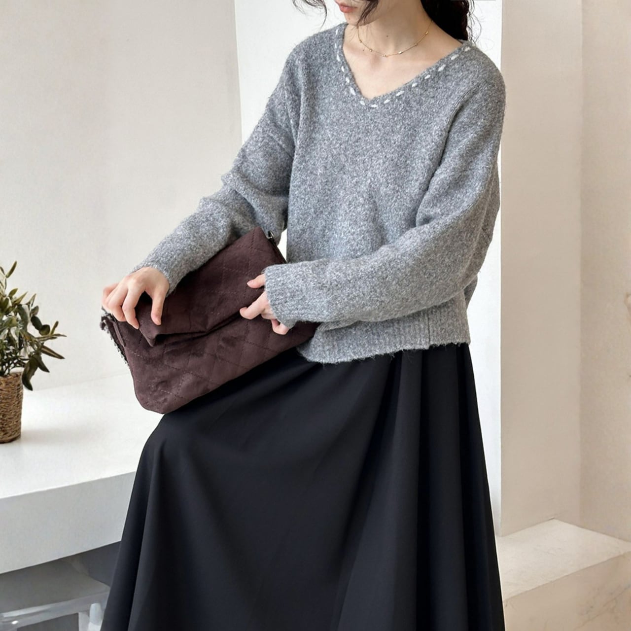 Vネックが首元をすっきりと見せてくれる、長袖オーバーサイズニット。