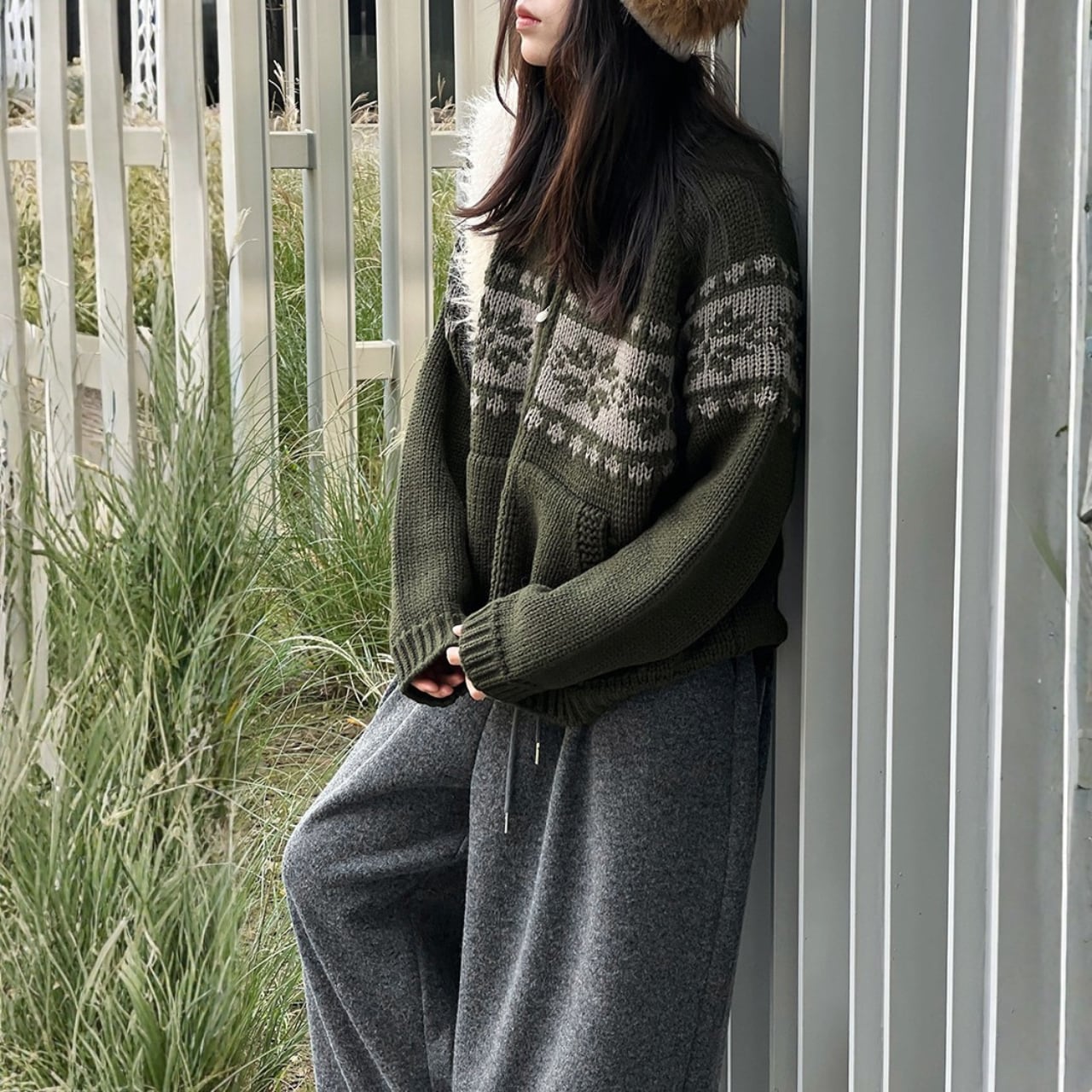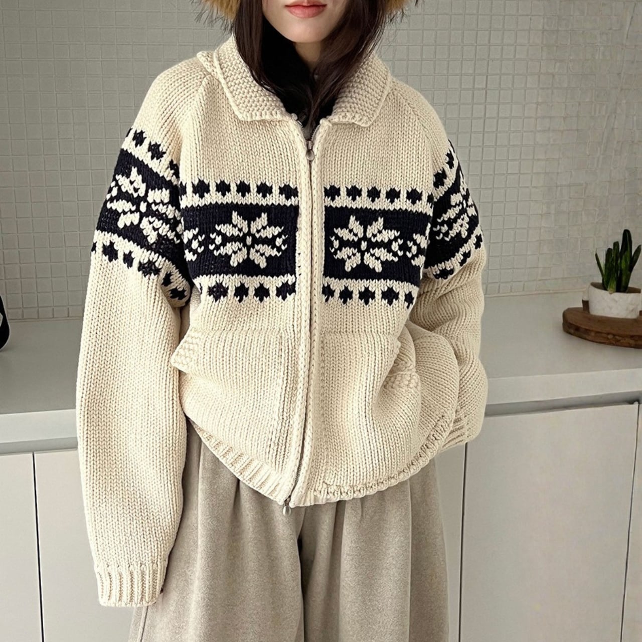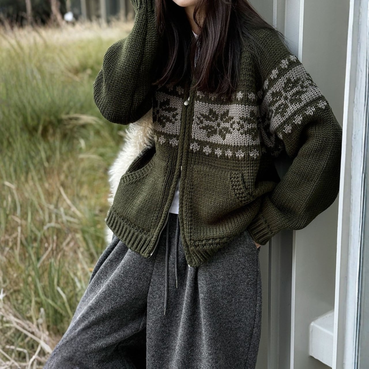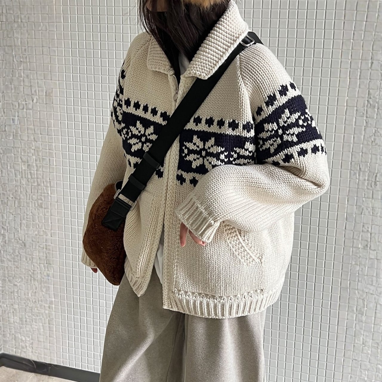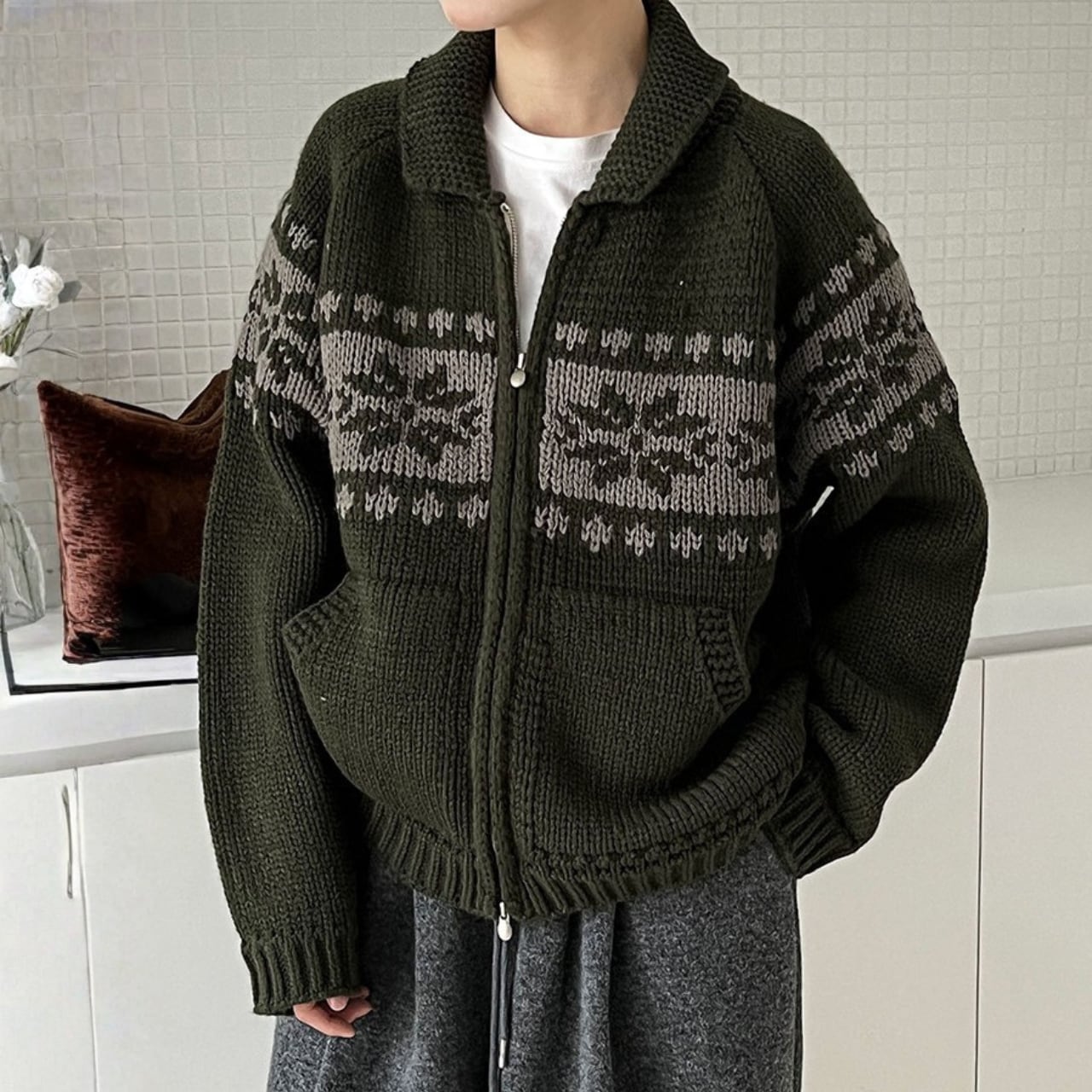 デザインが目を引くニットカーディガンは、コーディネートの主役になるアイテムです。両サイドのパッチポケットが、カジュアルながらも実用的な印象を与えます。ちょっとしたお出かけにも重宝する一枚です。