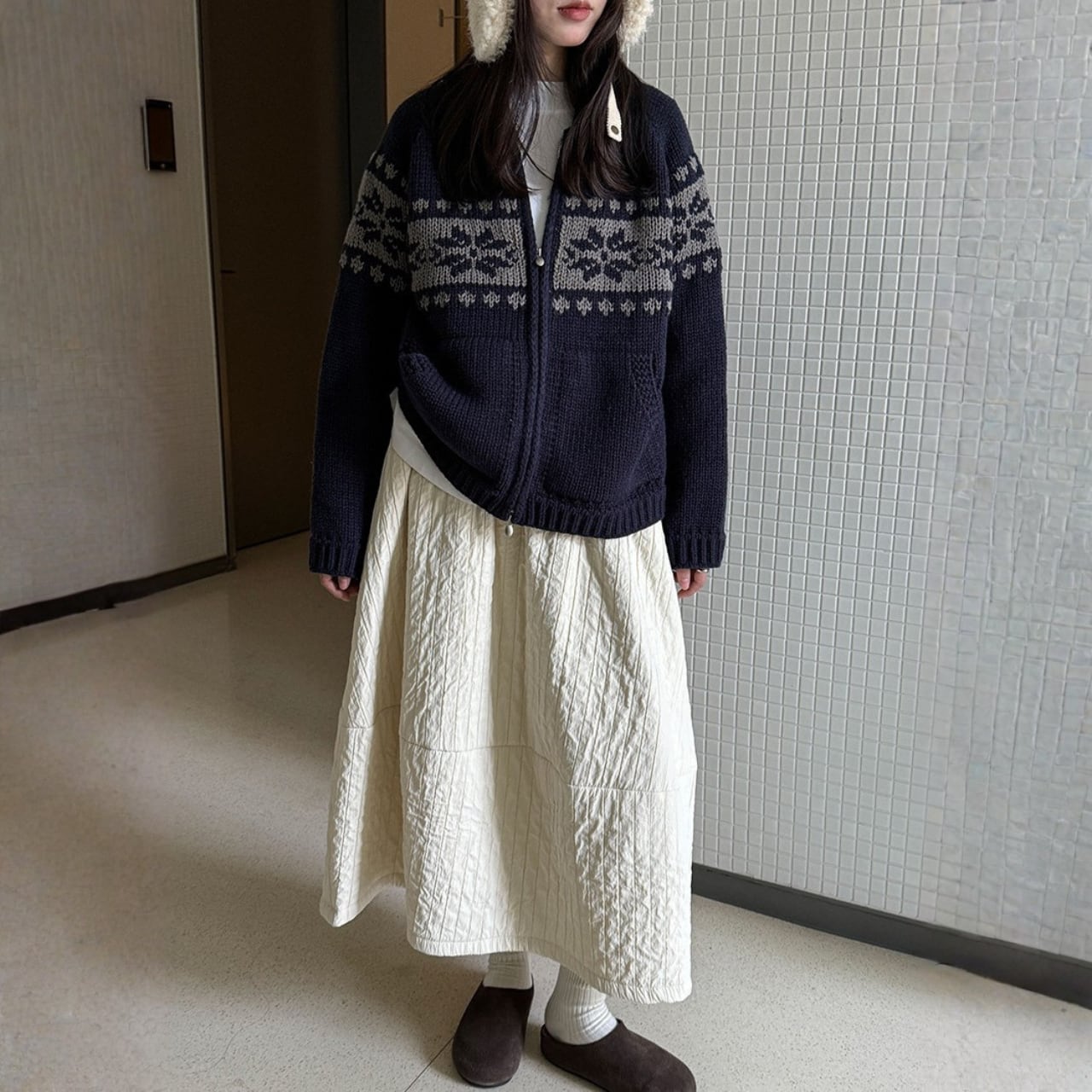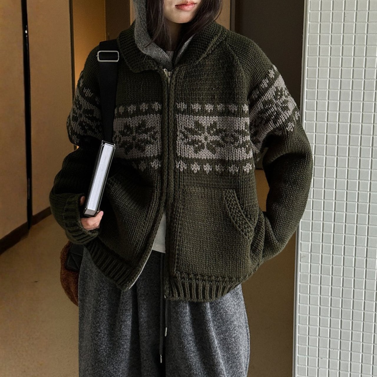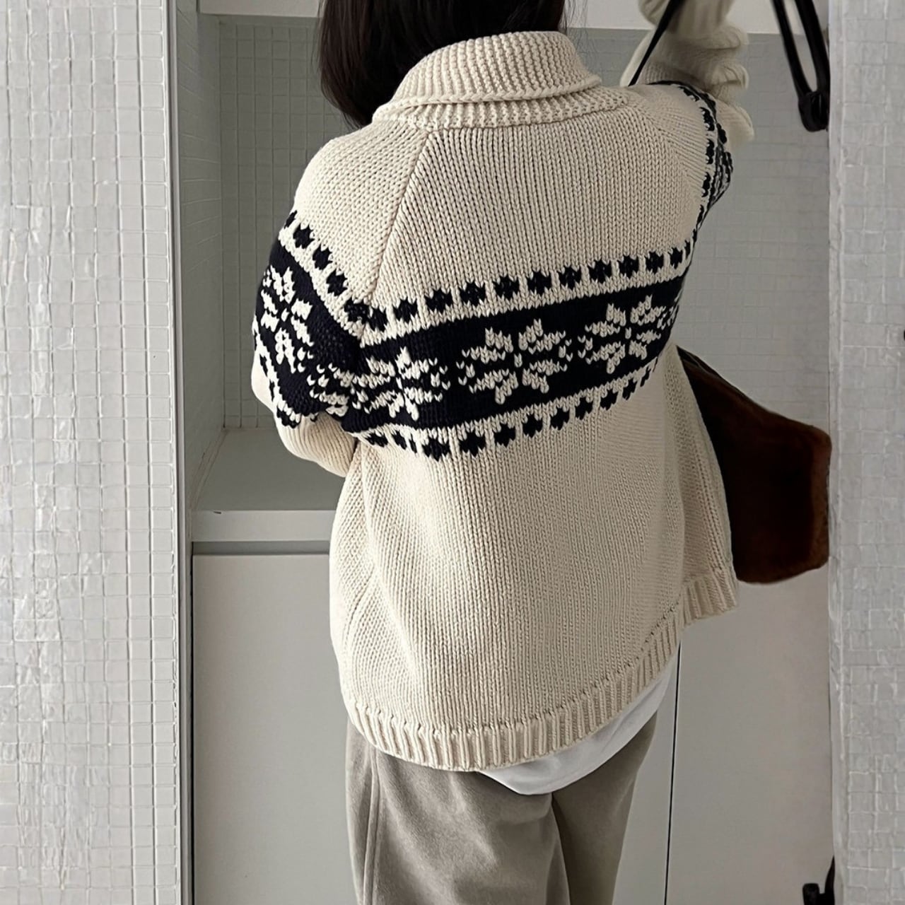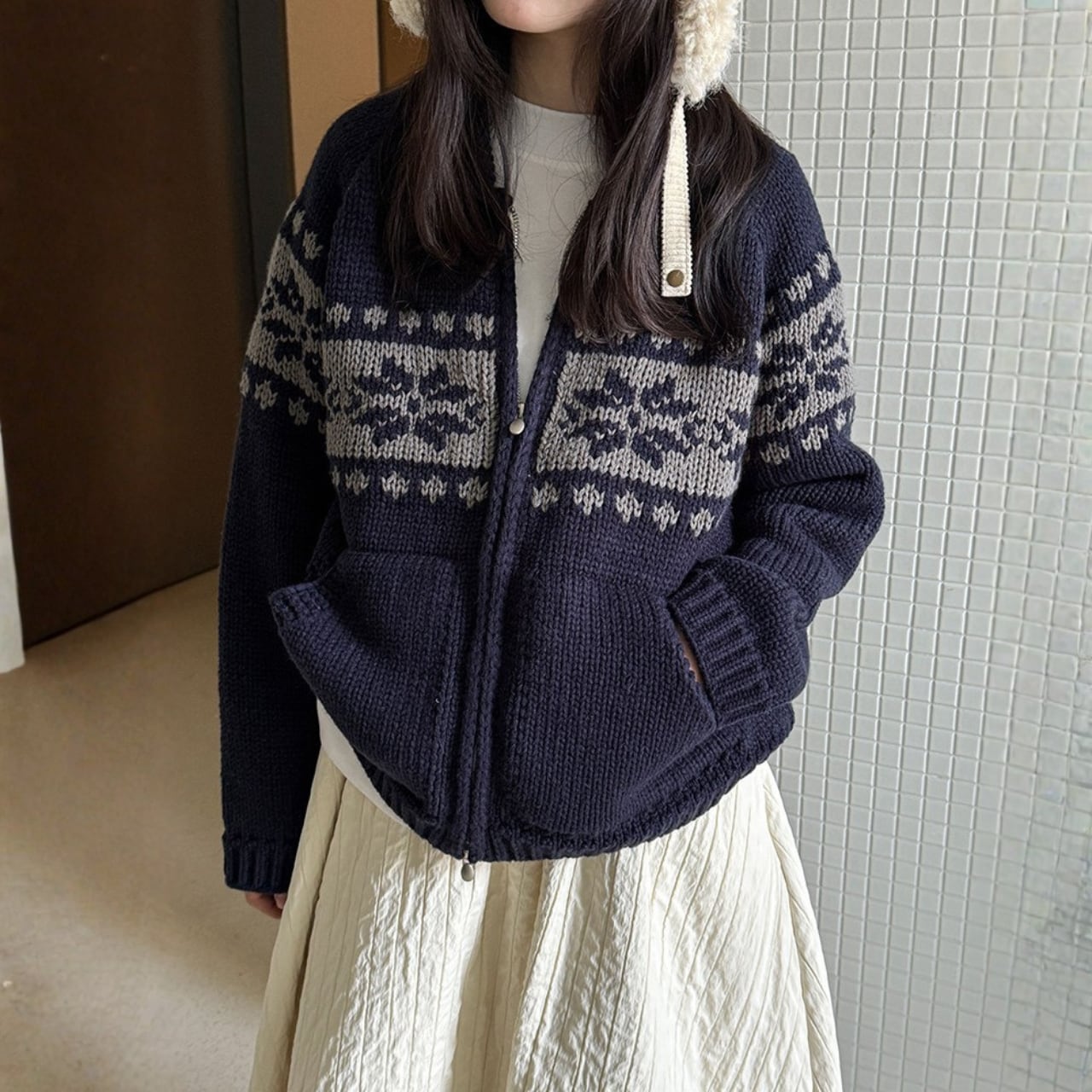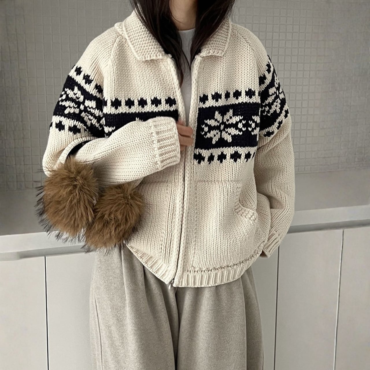 デザインが目を引くニットカーディガンは、コーディネートの主役になるアイテムです。両サイドのパッチポケットが、カジュアルながらも実用的な印象を与えます。ちょっとしたお出かけにも重宝する一枚です。