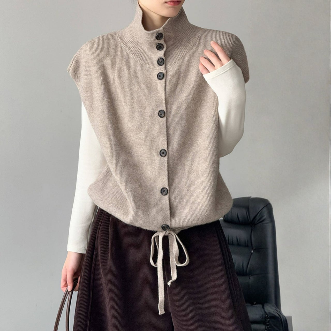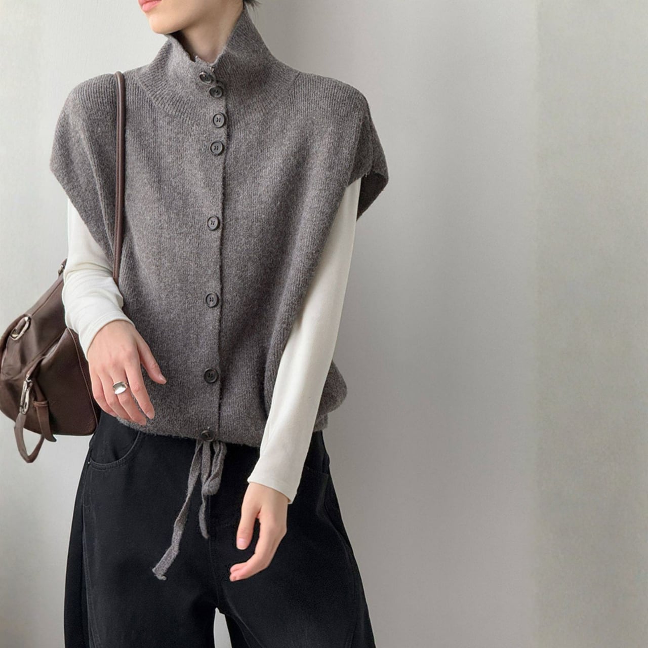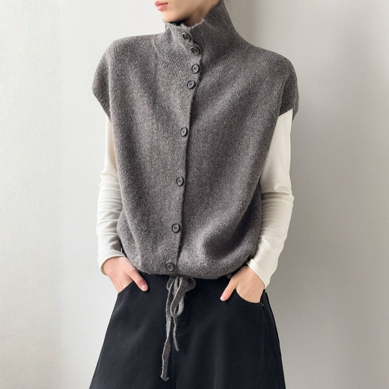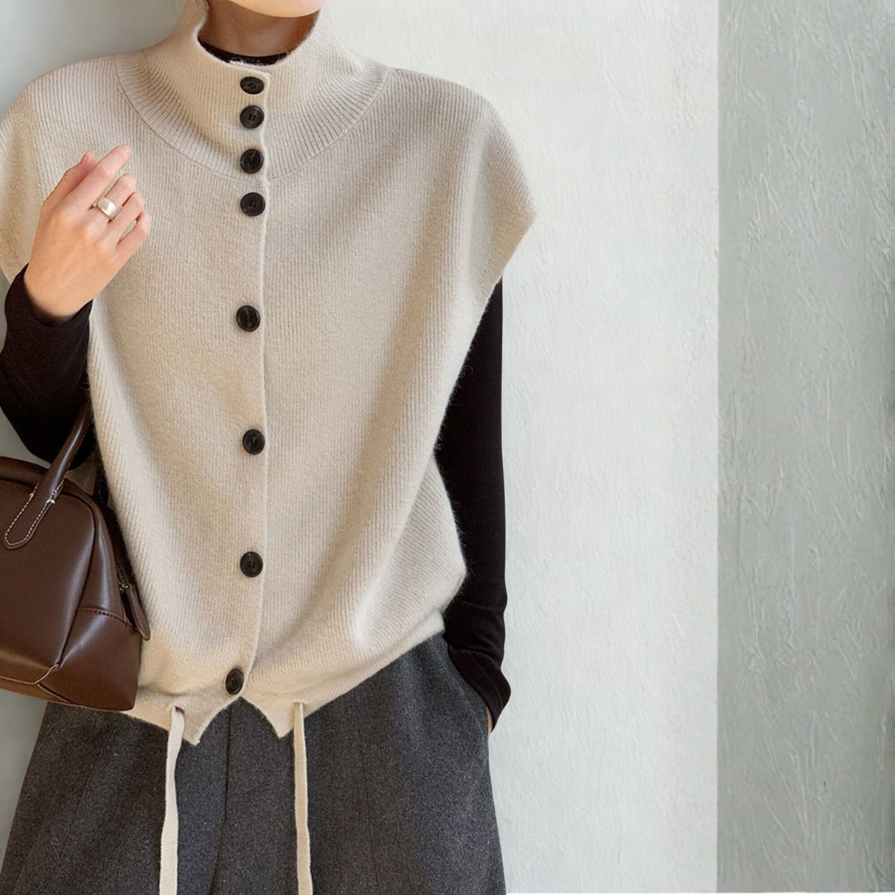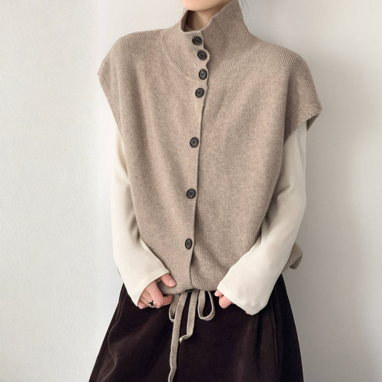 シャツやカットソーに重ねるだけで、コーディネートに奥行きが生まれ、洗練された印象に。