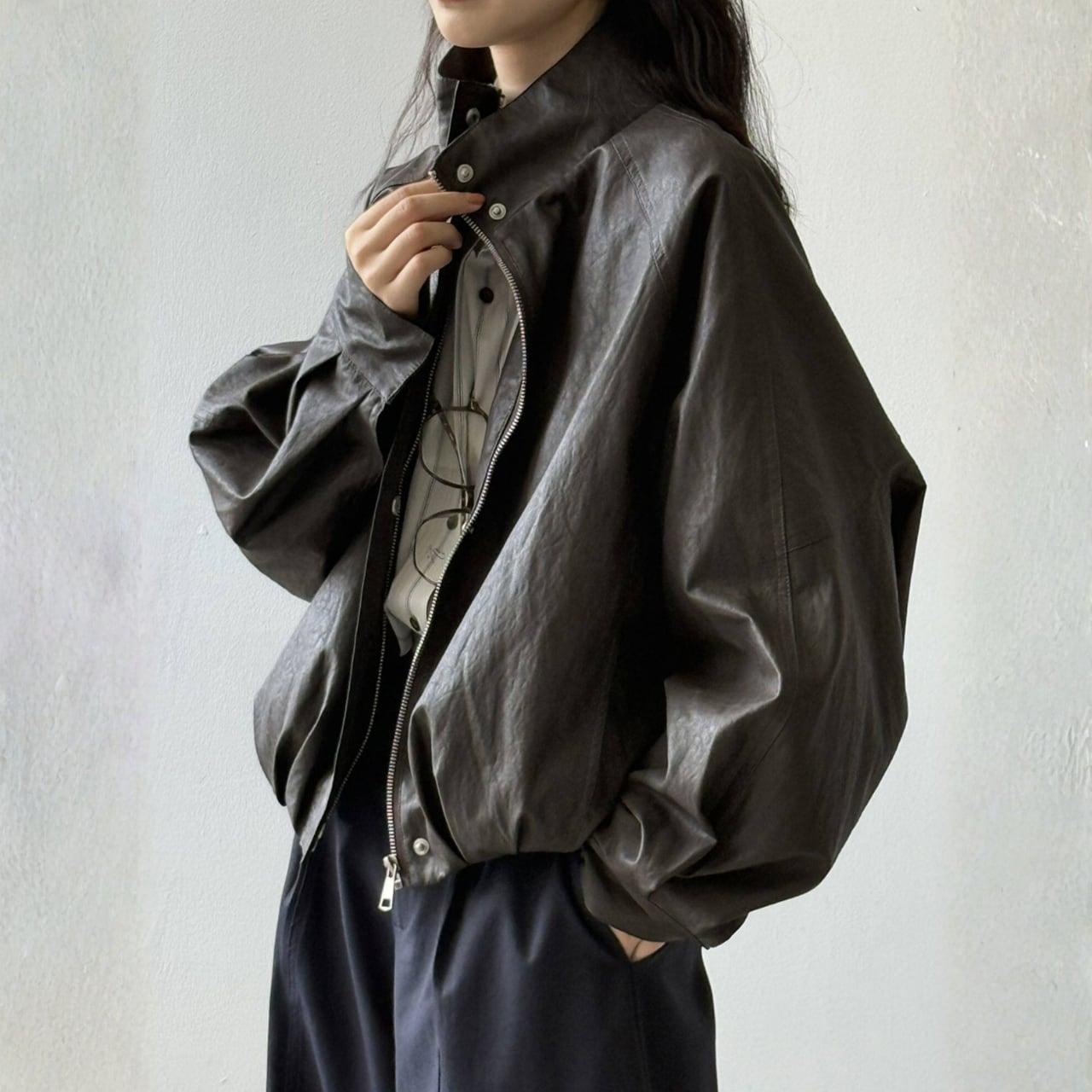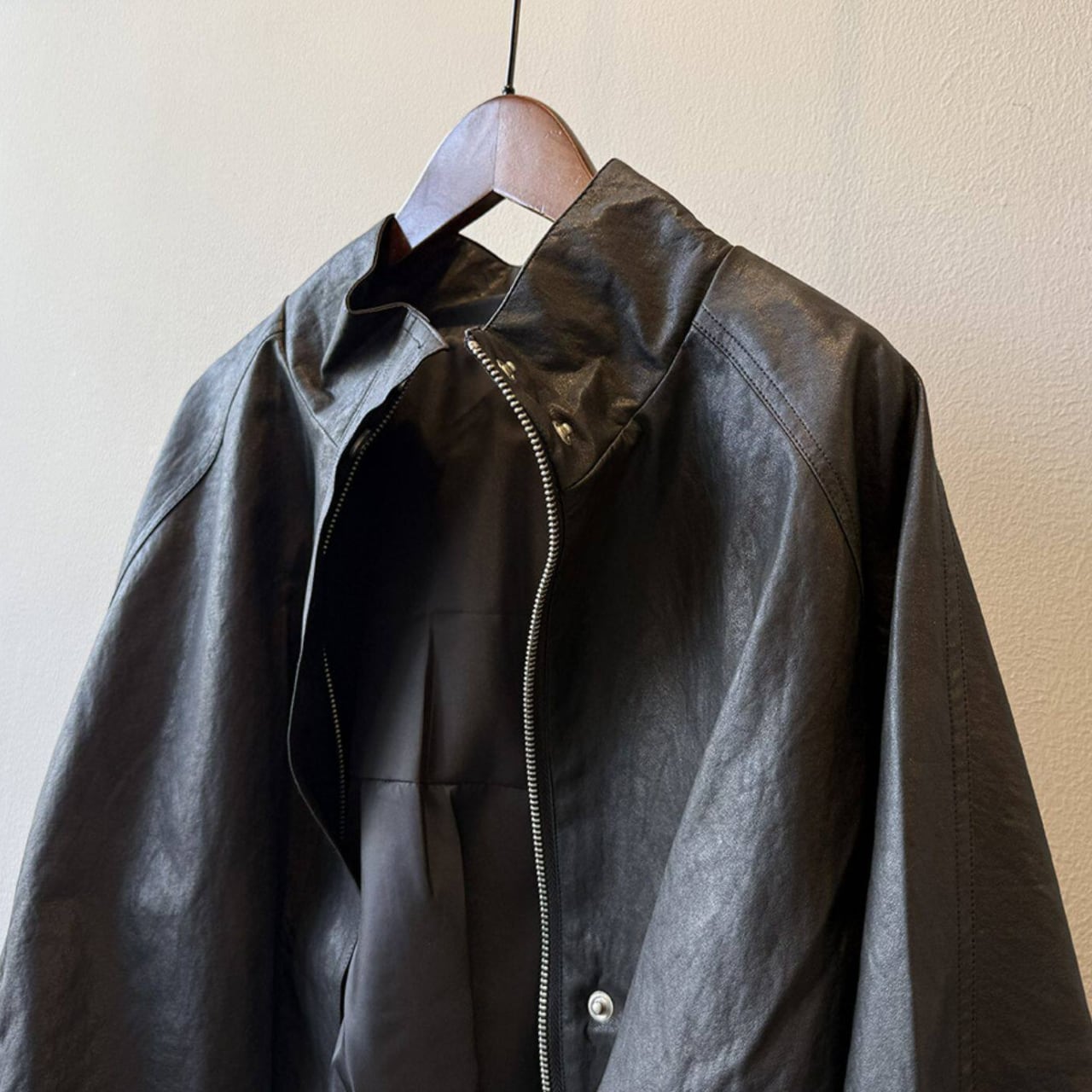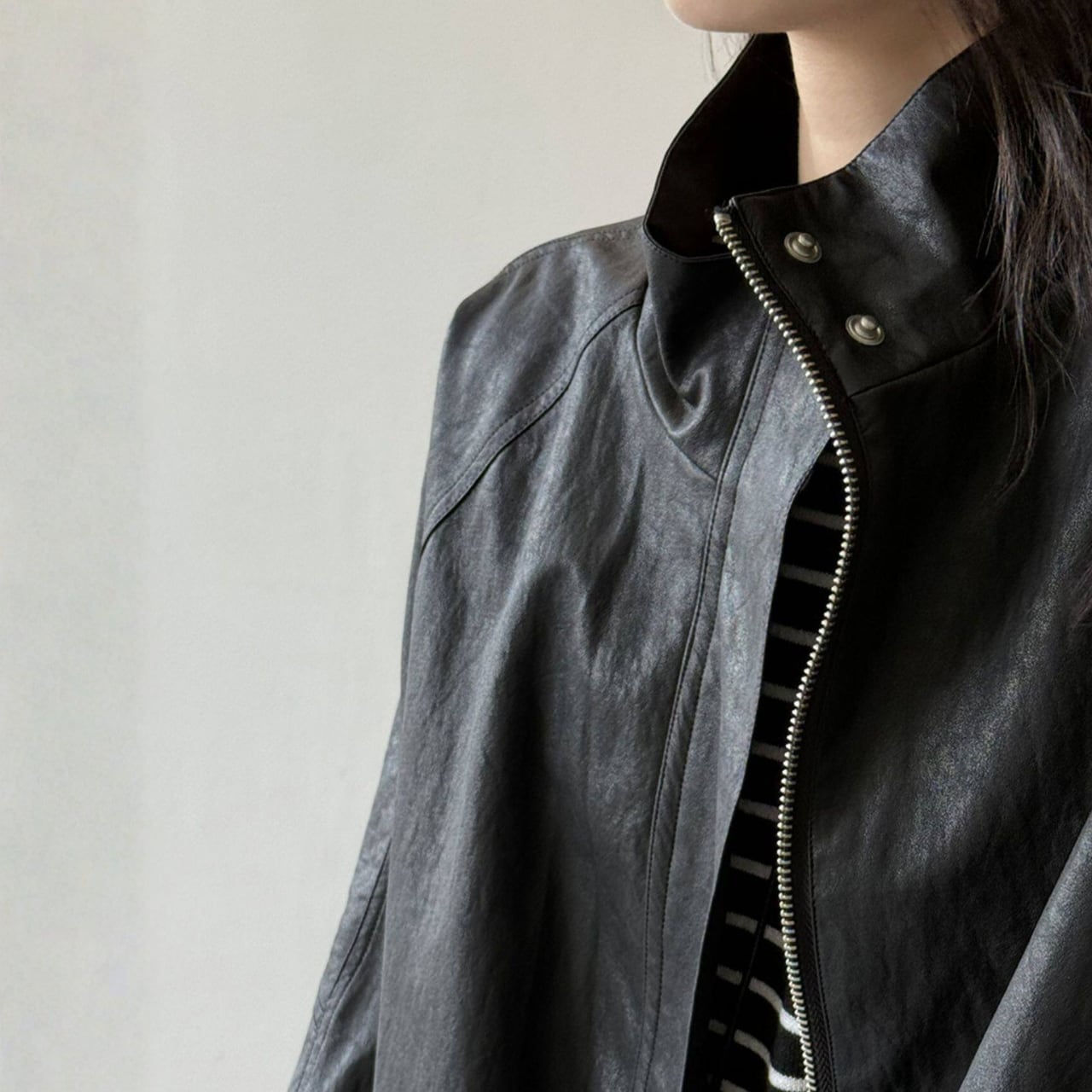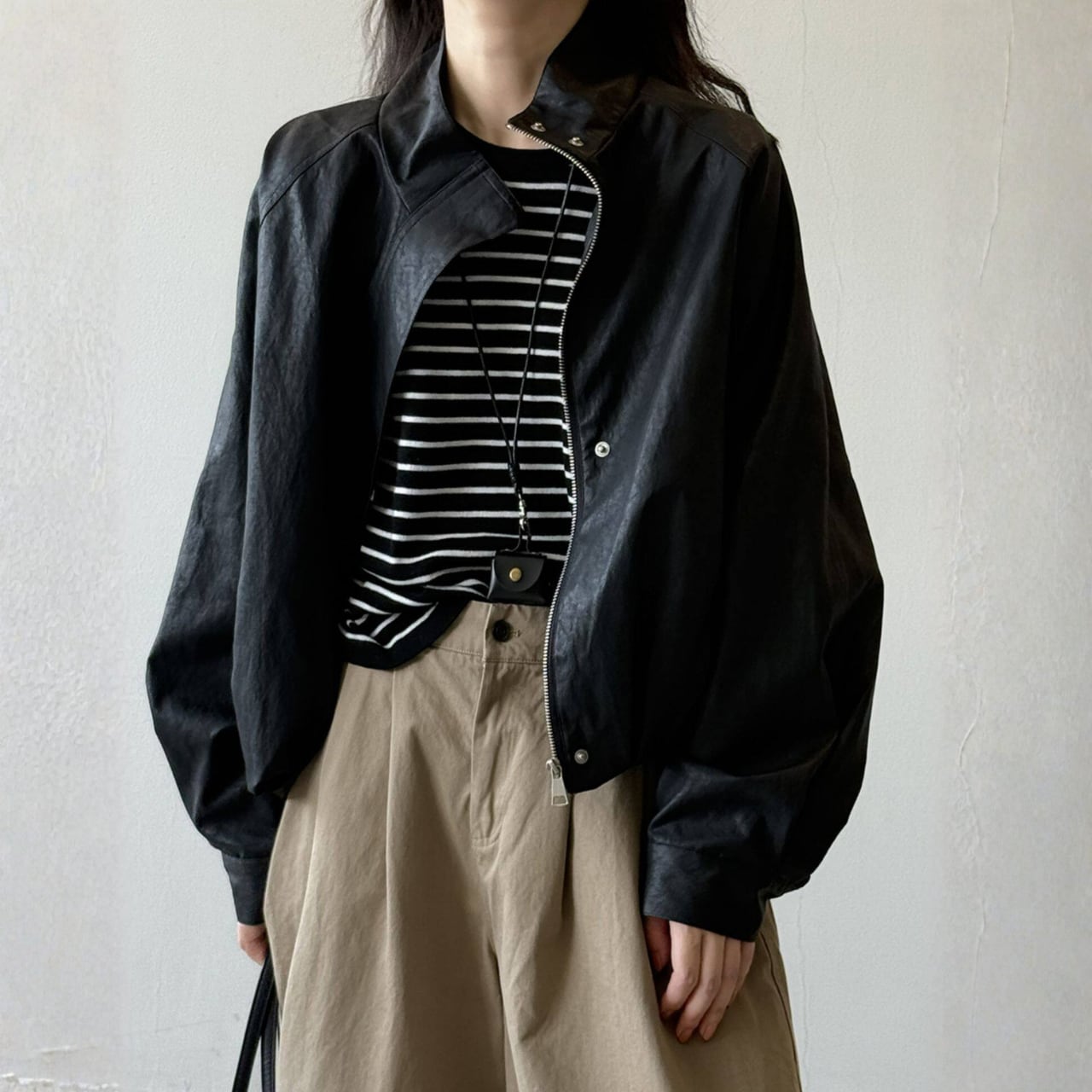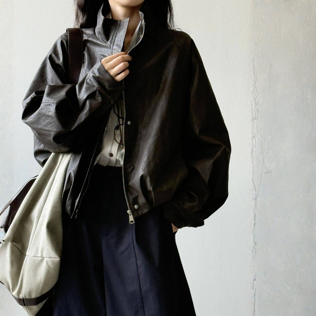 ジップを閉めてスタンドカラーにすれば、よりスタイリッシュな印象に。