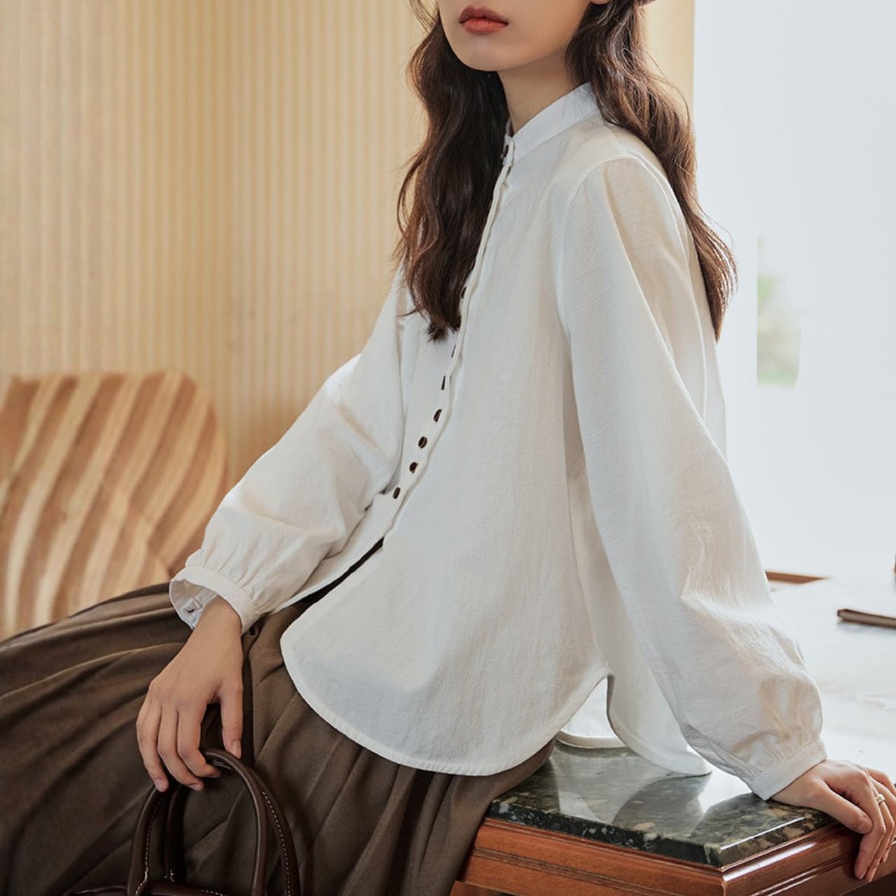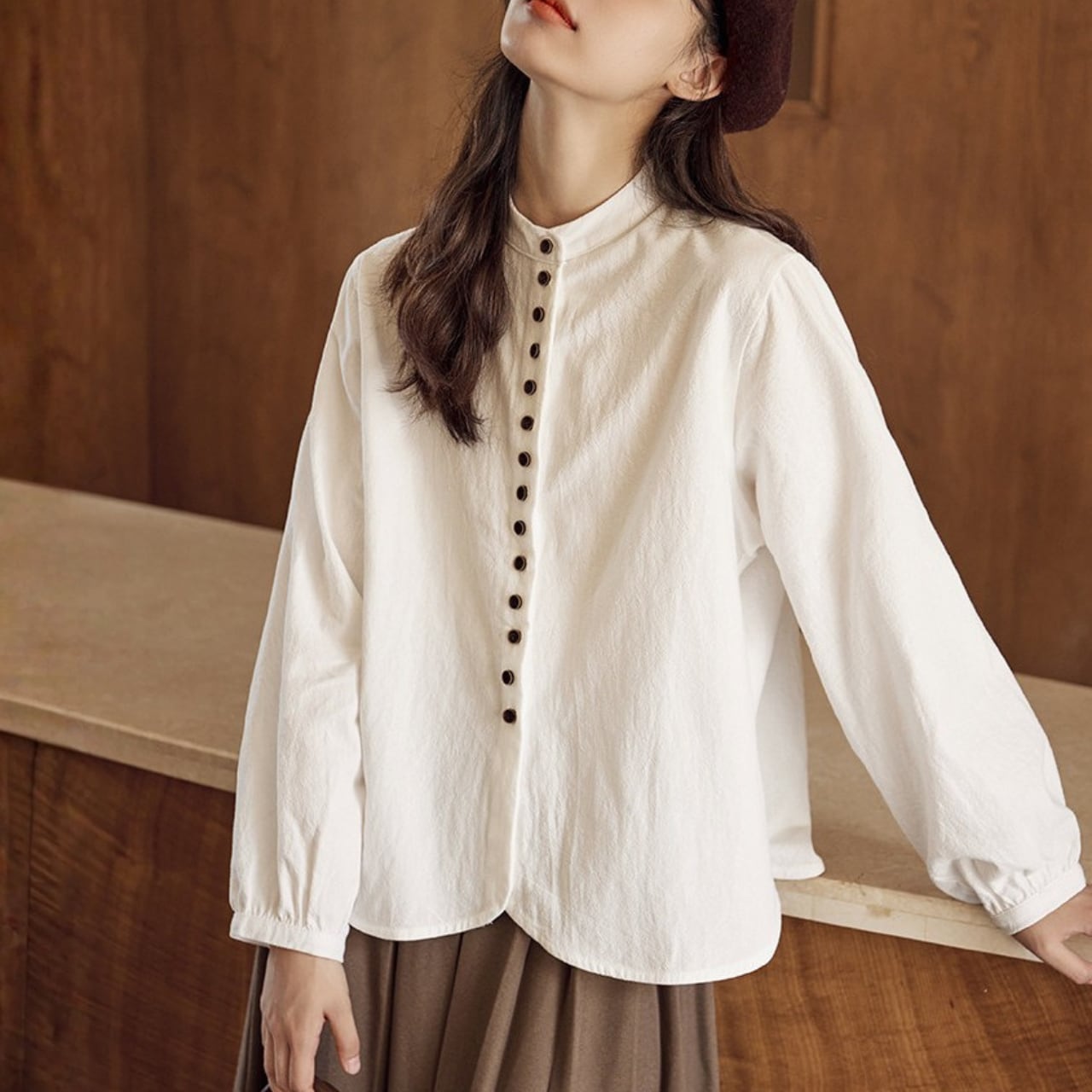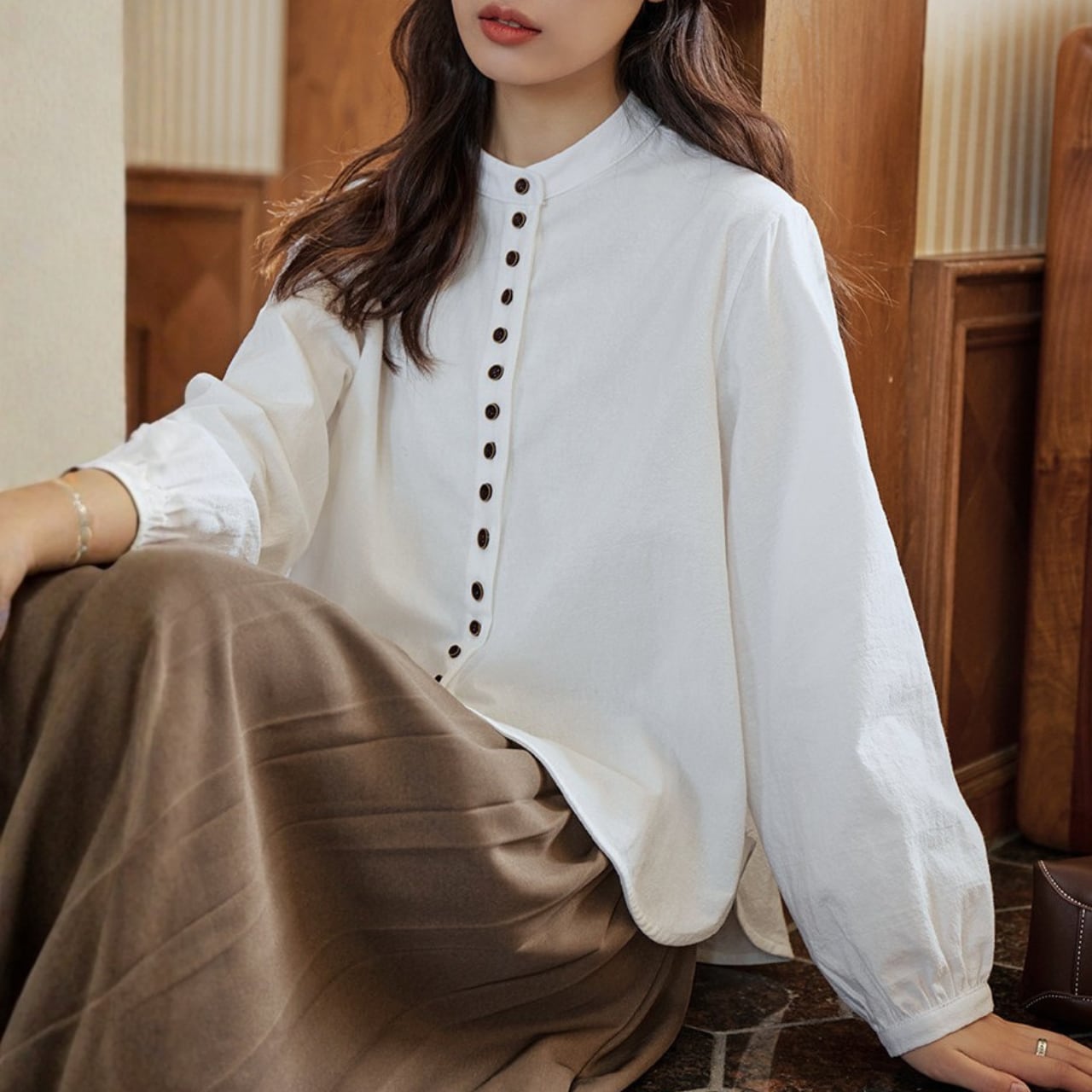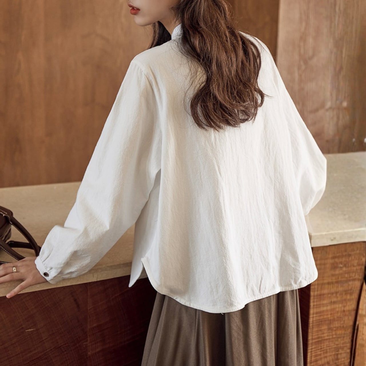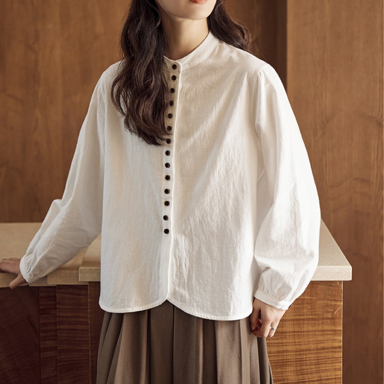 ボタンがアクセントになった長袖シャツは、コーディネートに取り入れやすい丈感。