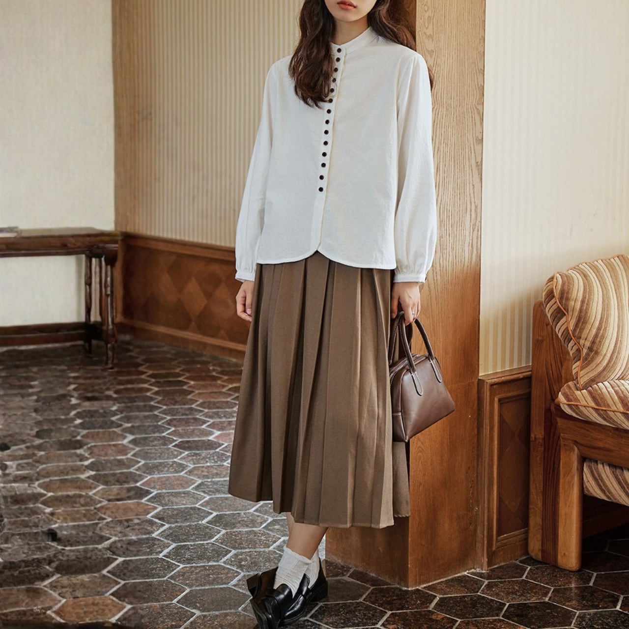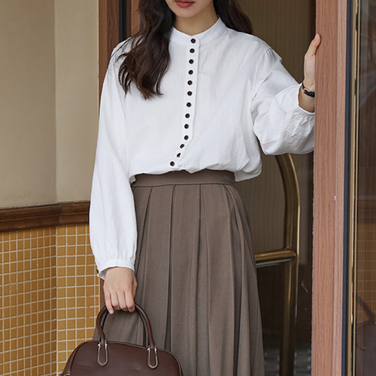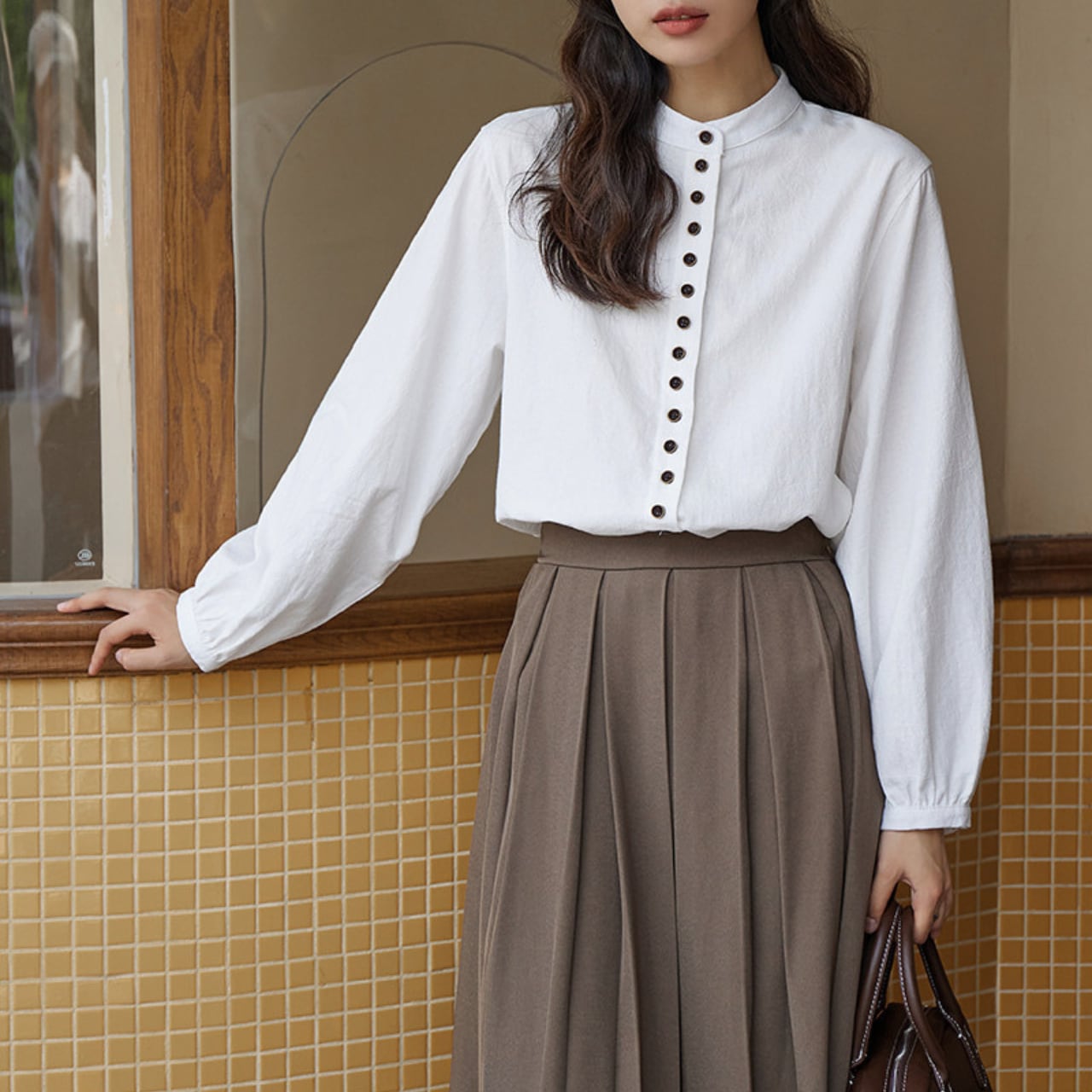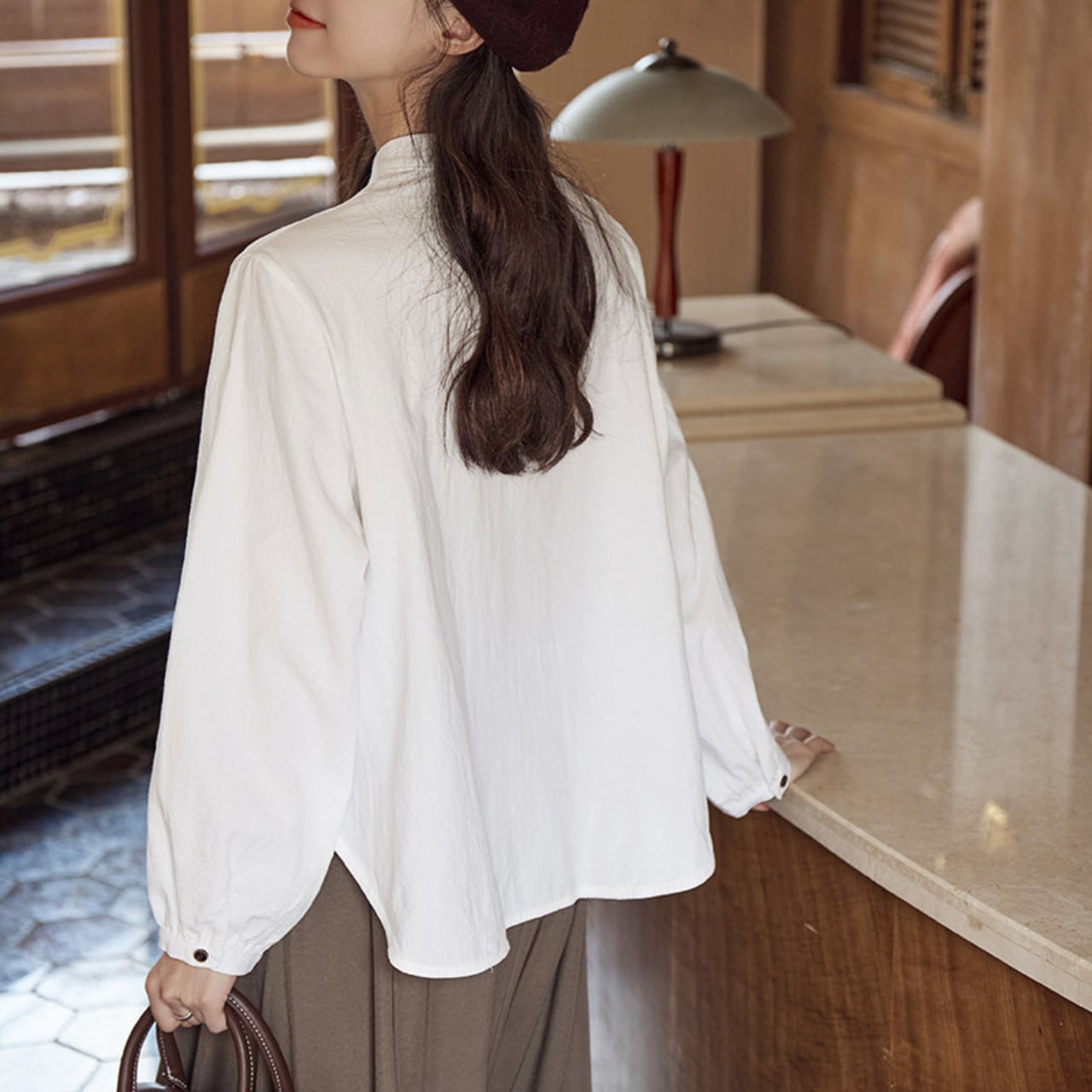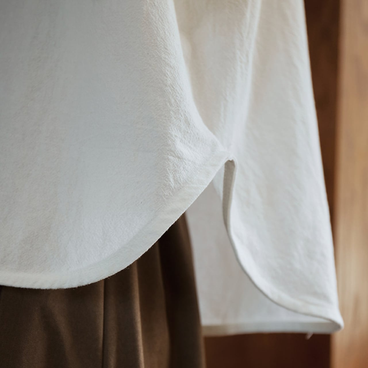 ボタンがアクセントになった長袖シャツは、コーディネートに取り入れやすい丈感。