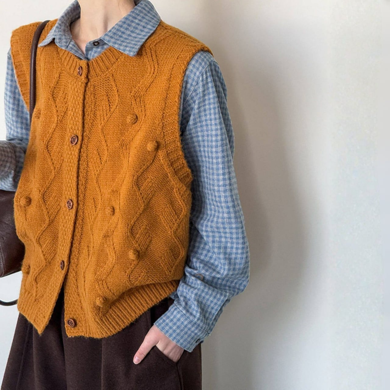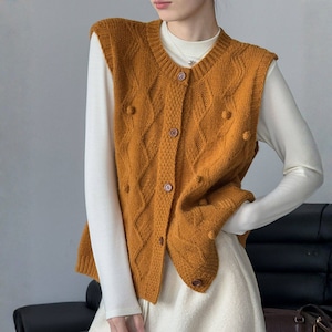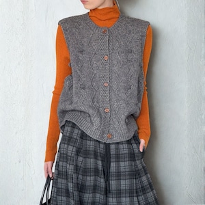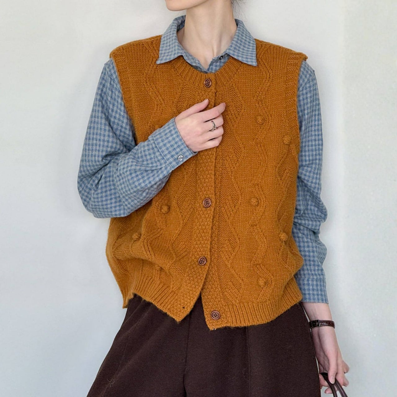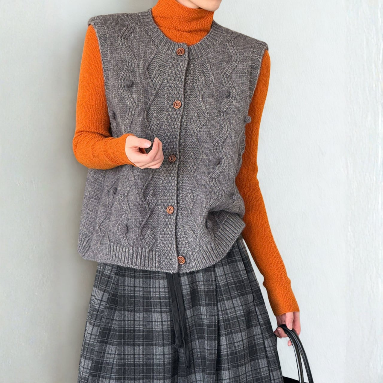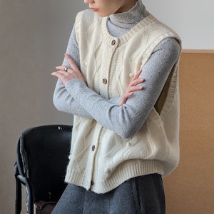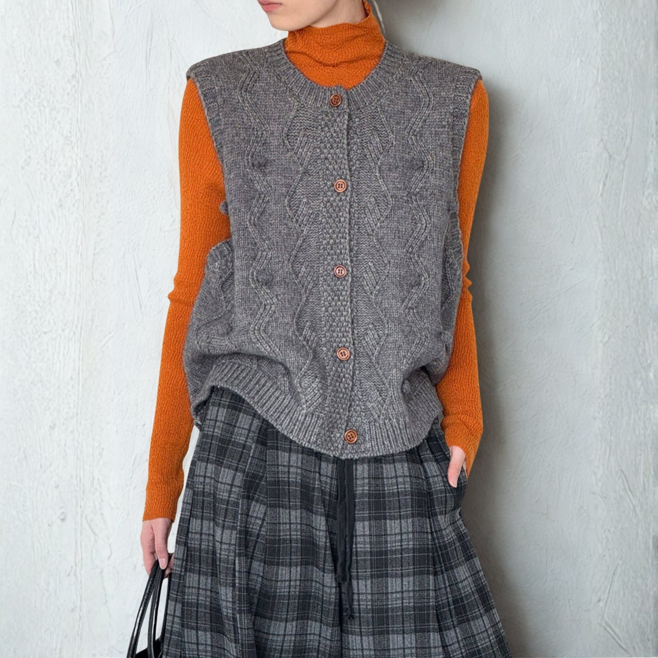 繊細な編みデザインがアクセントになったニットベストは、いつものコーディネートに新鮮さをプラスします。
